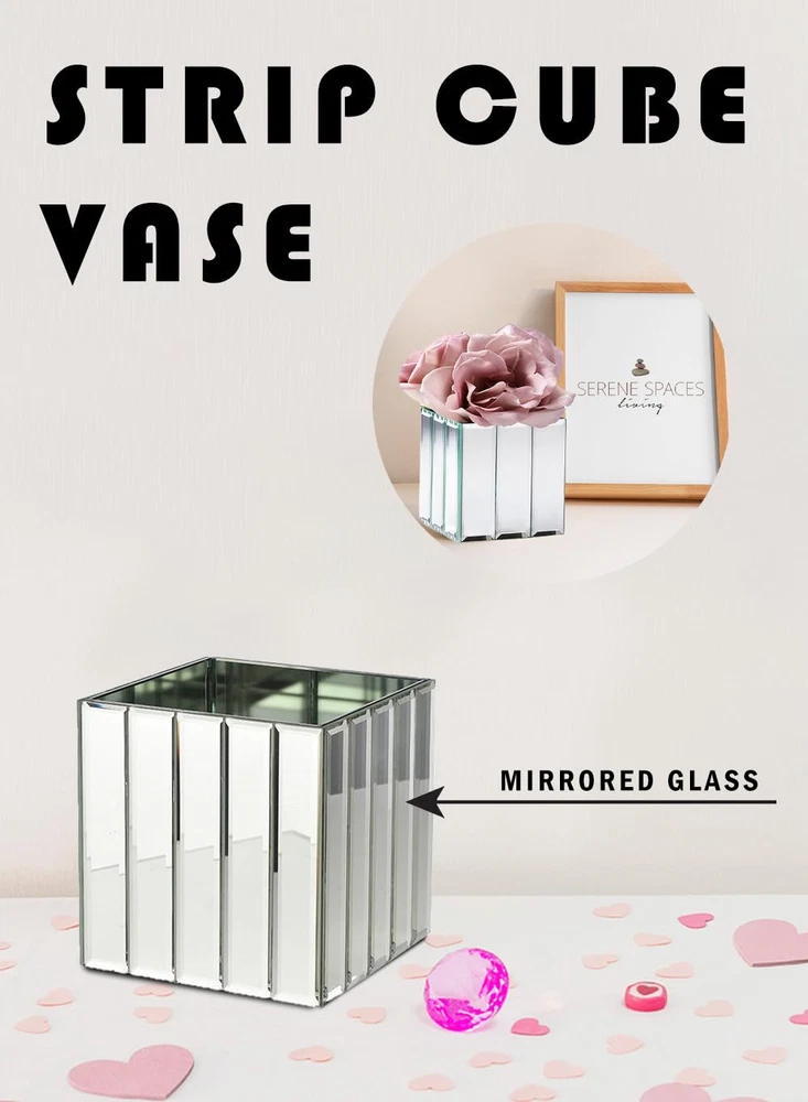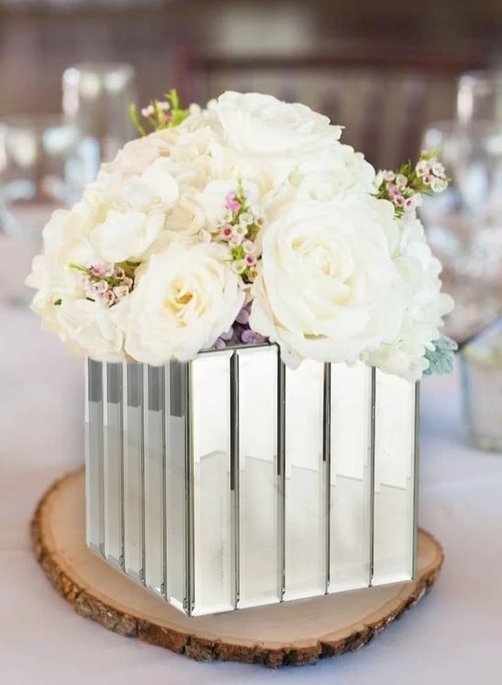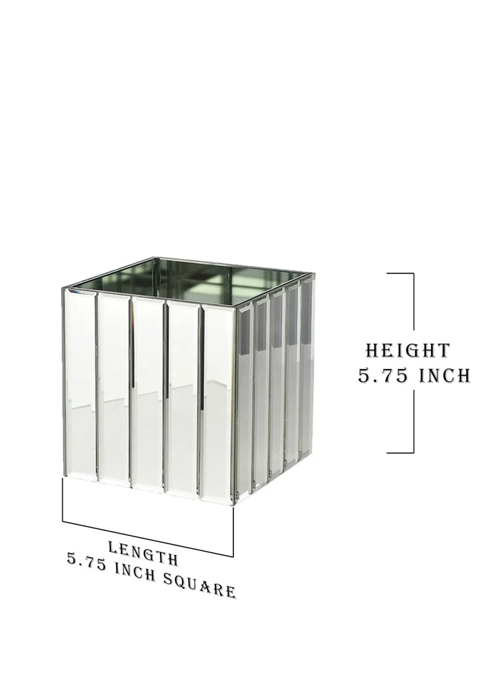 Mirrored Vase - The art deco style heavy cube vase features mirrored glass strips on each side of the exterior for a stylish design. Sold as a set of 6. Heavy Cubes - The 5.75-inch cube shape of the vase also could be used as a votive holder for a candle thanks to its weight, and a smaller vase is available separately Multiple Use Cases - The style of the cube vase will work well in your home, at a wedding, in a restaurant or almost anywhere Modern Design - The art deco cube vase includes a mirror panel on each of the four interior walls, which yields a modern design look Add a Floral Bouquet - To complete the serene look this mirrored cube vase provides, add some simple artificial flowers or greenery