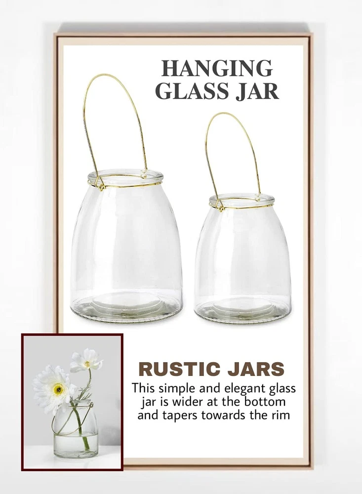 RUSTIC JARS - This simple and elegant glass jar is wider at the bottom and tapers towards the rim METAL HANDLE - An easy to hang gold wire handle adds a touch of class to this outdoor patio hanging lamp. Note: These products are handmade, hence spots and indentations are normal. VERSATILE MASON JAR - Fill it with dried flowers or a mix of wildflowers for a vibrant floral display CREATE AN AMBIENCE - Add fairy firefly string lights or a pillar candle for soft lighting at a porch/ patio/ yard CONVENIENT SIZE - Sold as a set of 12, the vintage style glass vase measures 6" Tall and 5" Diameter