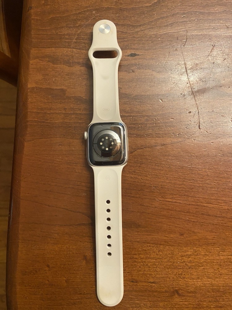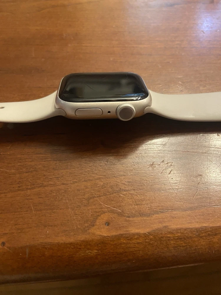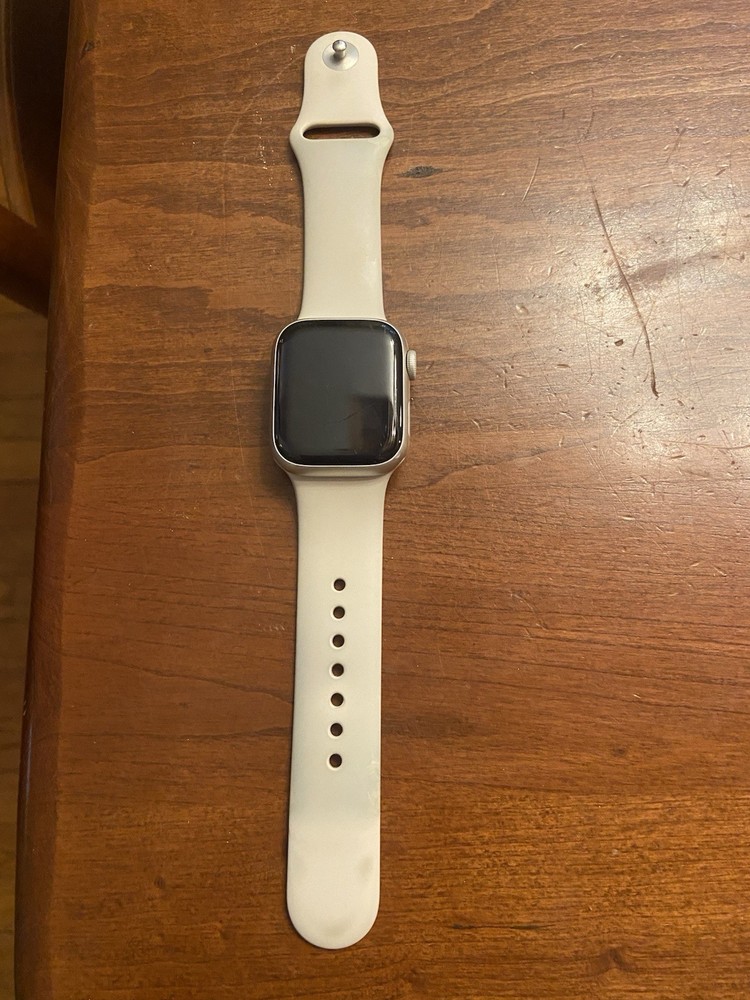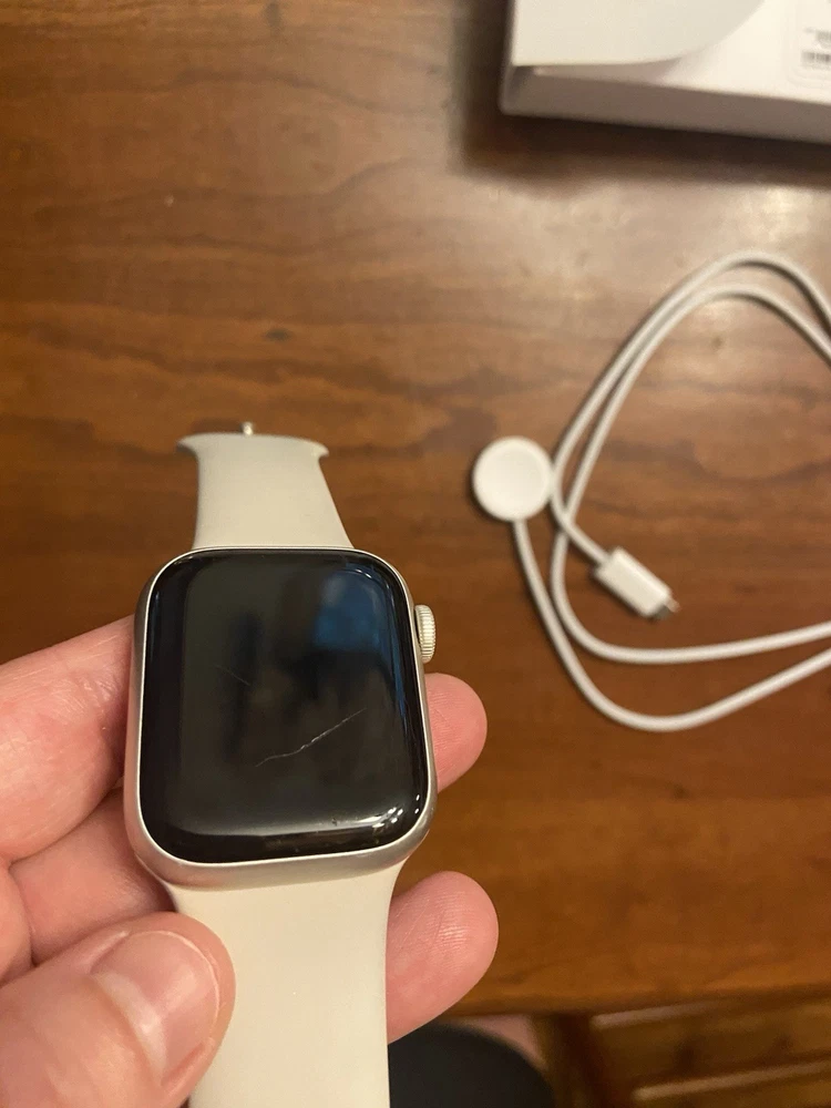 Apple Watch Series 7. Watch has some minor scuffs and marks on it from every day use, and a larger scratch in glass which is shown in pictures. Does not affect the quality or use of the watch. Watch band is stained a blueish/gray color on front and back in some areas. Included is the original USB-C charging cable it came with (no power adapter). Also 1 clear watch case that fits over the screen.
