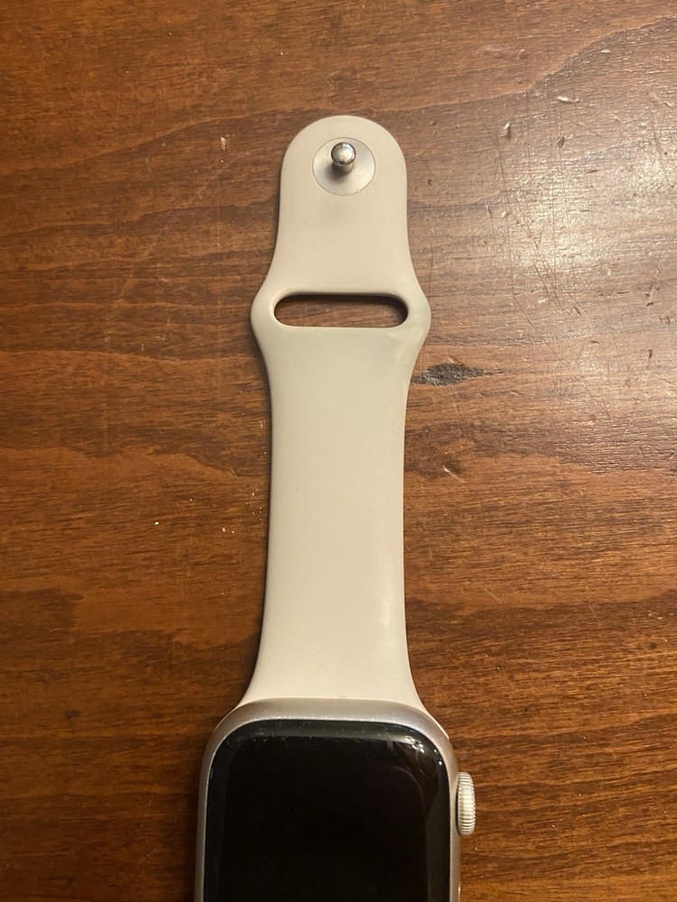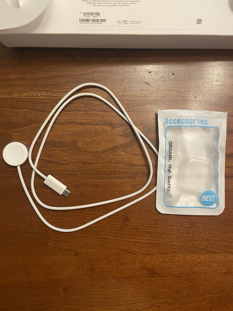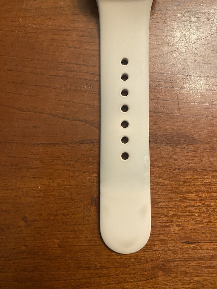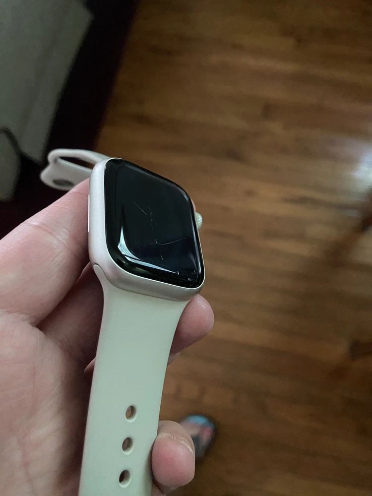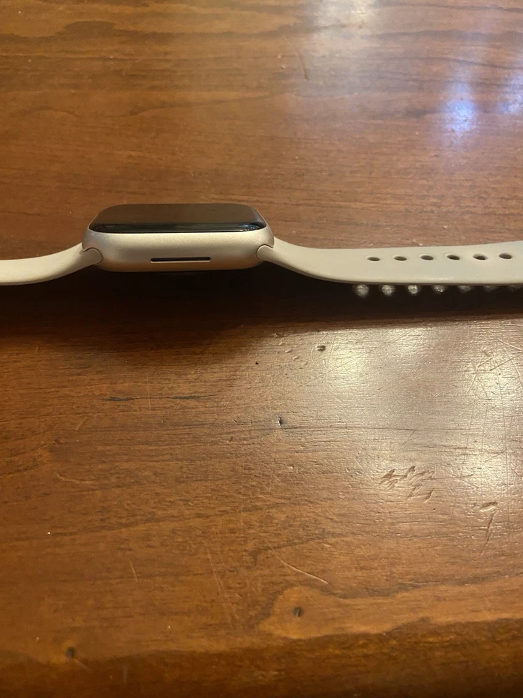 Apple Watch Series 7. Watch has some minor scuffs and marks on it from every day use, and a larger scratch in glass which is shown in pictures. Does not affect the quality or use of the watch. Watch band is stained a blueish/gray color on front and back in some areas. Included is the original USB-C charging cable it came with (no power adapter). Also 1 clear watch case that fits over the screen.