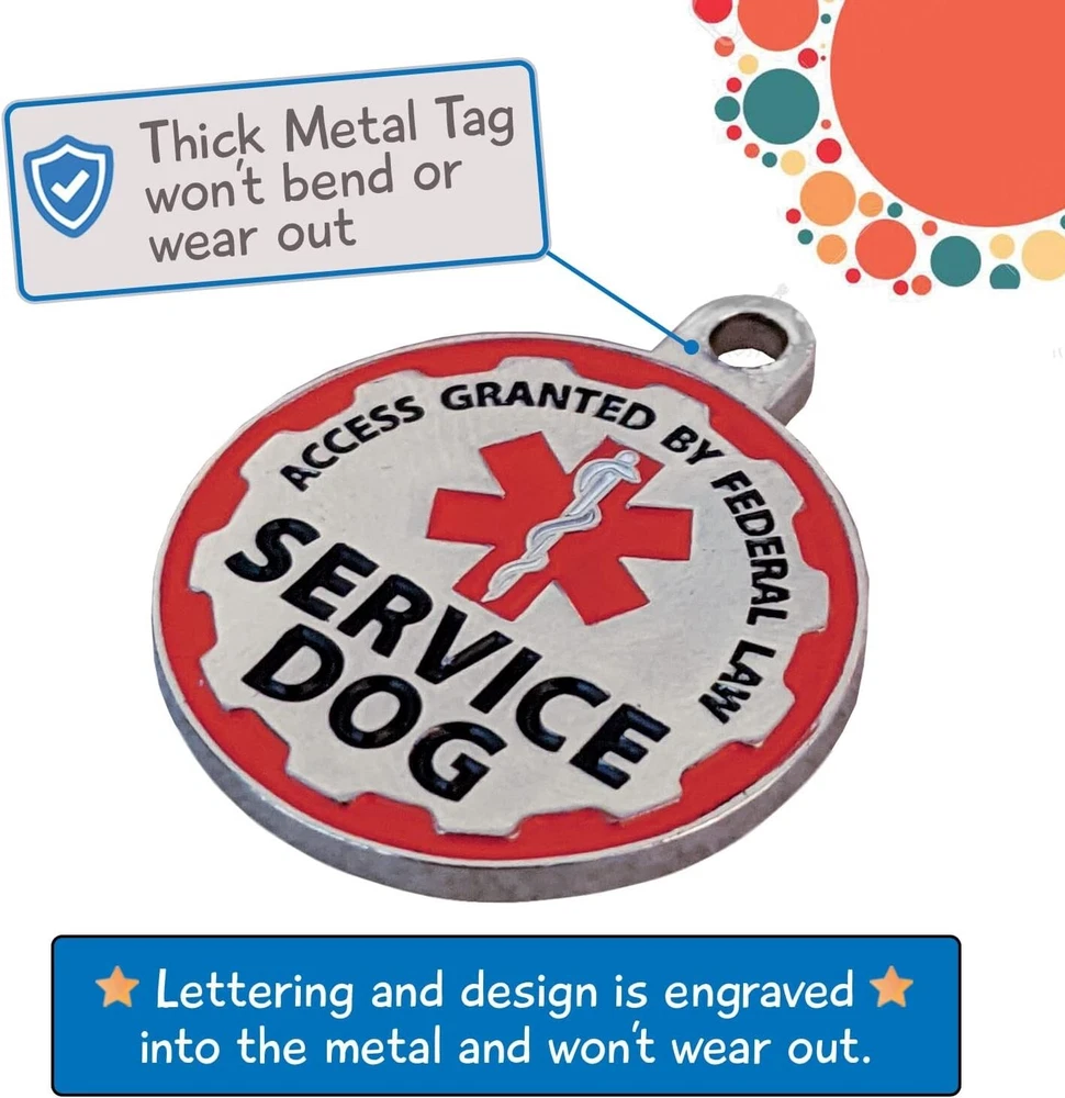 Service Dog ID Tag + 50 ADA Information Cards - Metal Dog Tag is Double-Sided Product Details: Service dog cards and tag for your K9 accessories so you can have certification to enter establishments without your rights being taken away. Good for service animals as defined by federal law, not recommended for service dogs in training, ESA, therapy dogs, or emotional support dogs. CHOOSE FROM 2 SIZE ID TAGS - 1 inch for smaller dogs, 1.25 inch for medium and larger dogs. Easily attaches to harness, vest, or collar includes a clip that fits onto any collar. 2-sided thick metal material ensures that the fact is always seen and wont get ruined with wear and tear 50 High quality cards with all your federal government rights written on both sides. Includes box to hold the cards so they wont get ruined. ADA cards are similar size to credit-card and will fit in your wallet so you always have it when you need it These accessories can be used in addition to, or instead of, a vest, patch, or other identifiers. When you present the card or ID tag, you DO NOT need to provide any other proof or identification for you animal