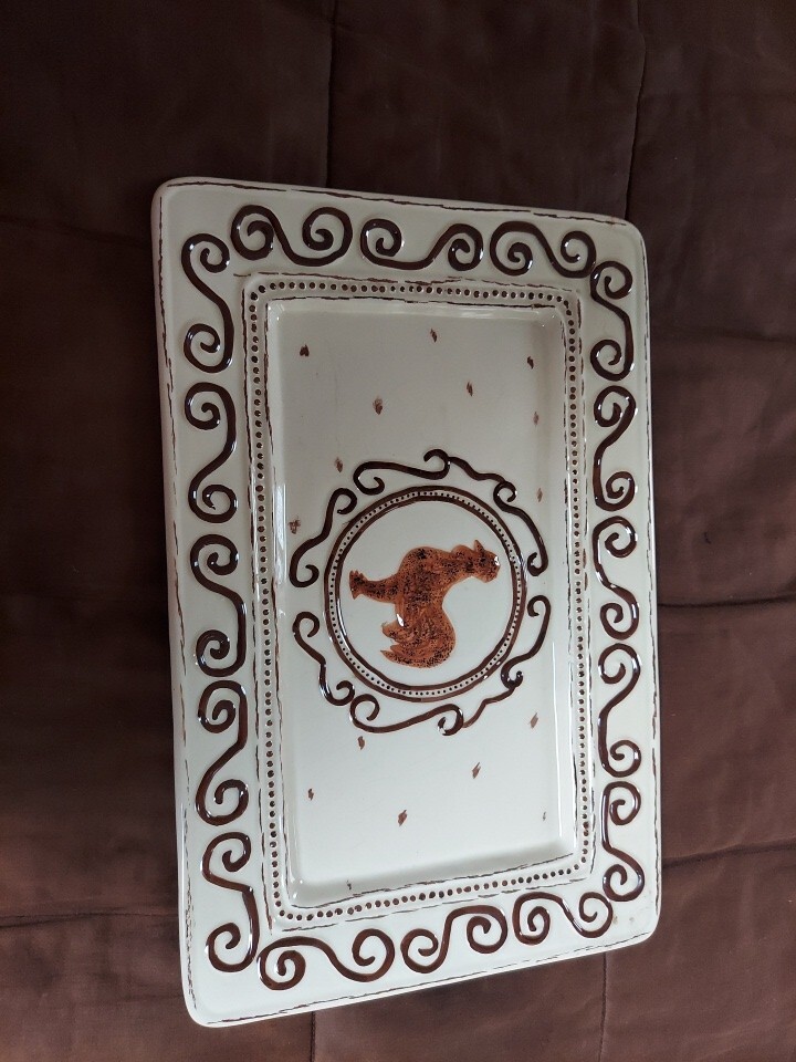 Theme: Farm Animals Pattern: Animal Print Size: Large Type: Serving Brand: Unbranded California Prop 65 Warning: N/A Manufacturer Warranty: N/A Personalization Instructions: N/A Features: Stand Style: Country Materials sourced from: Unknown Personalize: No Item Length: 20 in UPC: Does not apply gtin13: Does not apply Item Width: 12 in Material: Ceramic, Porcelain Item Depth: 3 in Wood Tone: Black Color: Multicolor Shape: Rectangle Finish: Painted Country of Origin: United States Occasion: All Occasions Number of Compartments: 0 MPN: N/A