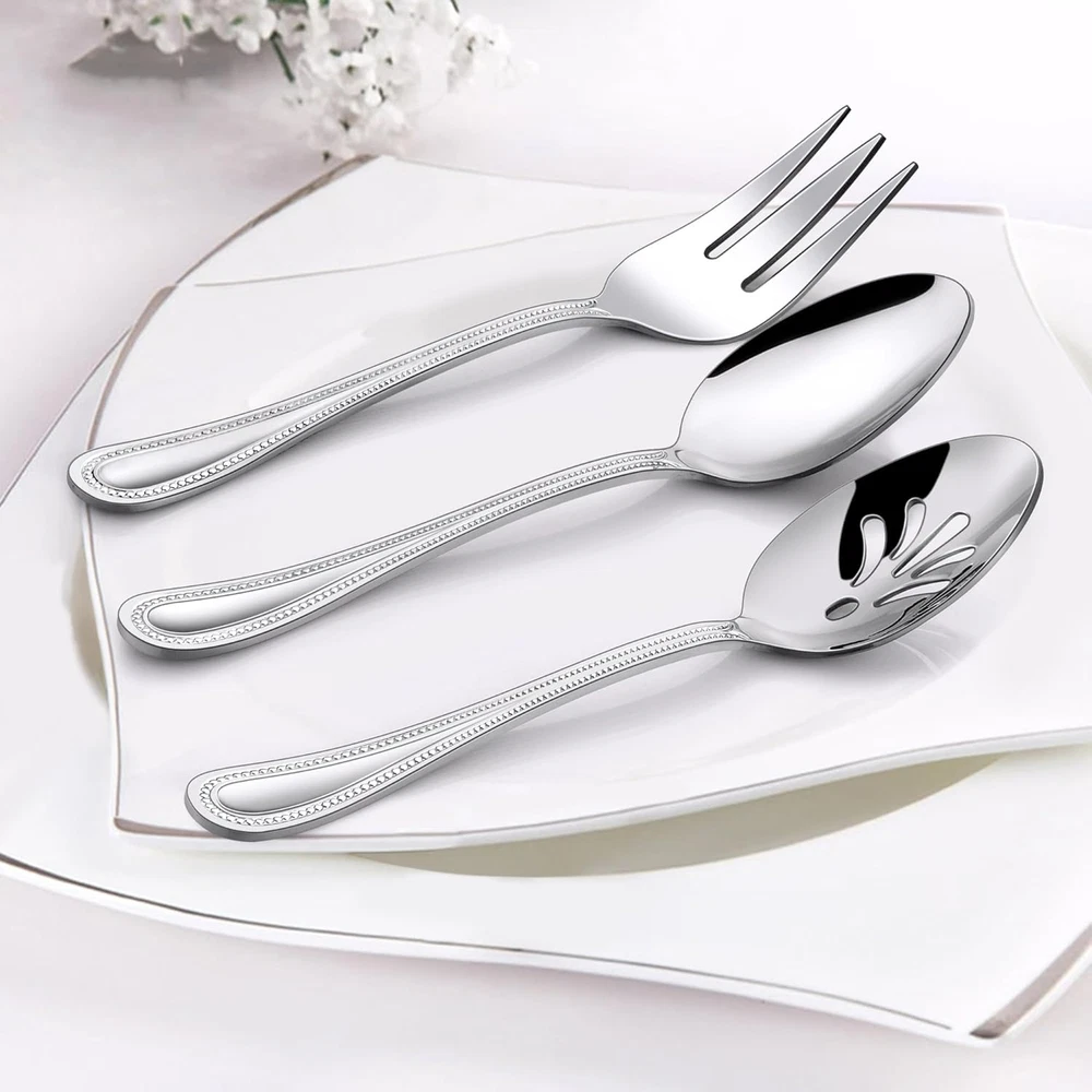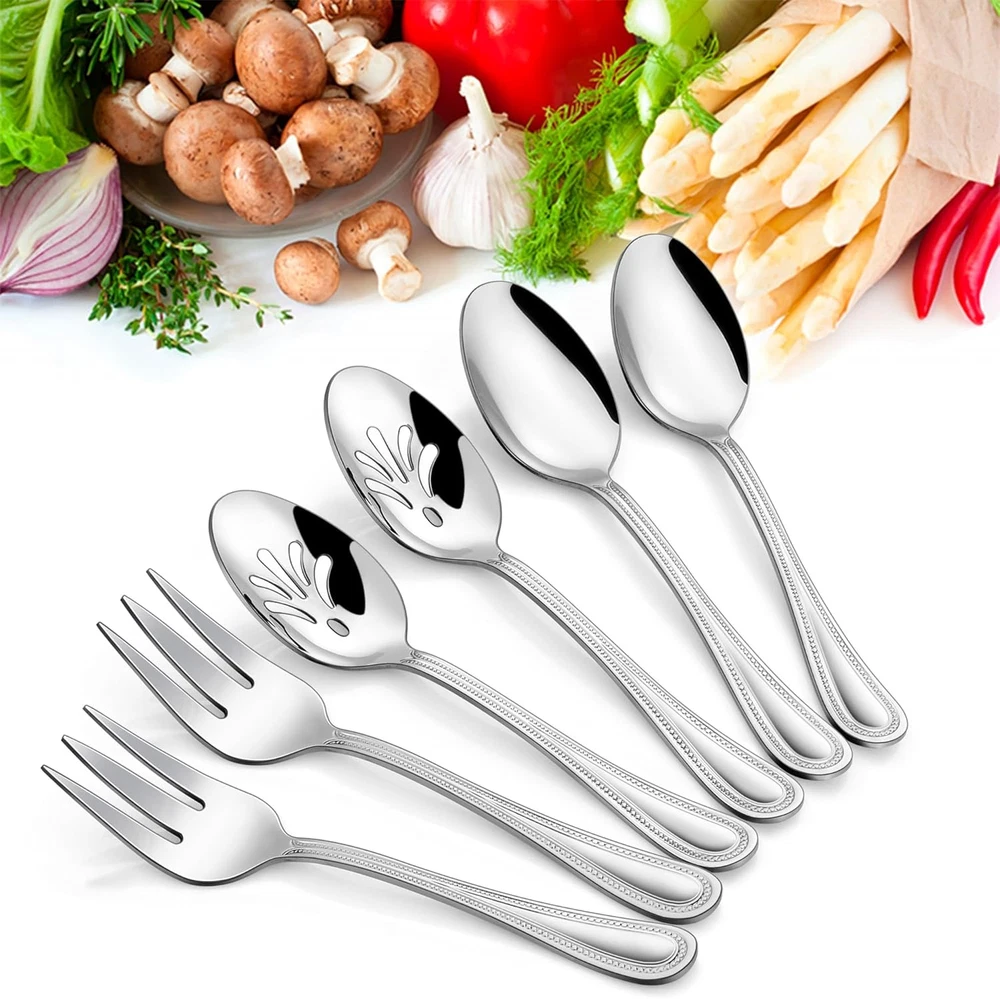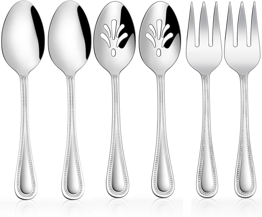 Store New Arrivals Add to Favorite View Feedback Contact Serving Set, 6 Pieces Stainless Steel Silverware Serving Utensils, Pearled Edge Hostess Serving Set for Buffet Party Kitchen Restaurant, Mirror Finished & Dishwasher Safe Description Is Stain Resistant Yes Style Traditional Number of Pieces 6 Color Silver Special Feature Mirror, Dishwasher Safe, Rust Resistant Material Stainless Steel Country of Origin China Is Dishwasher Safe Yes Item Weight 1.1 pounds Recommended Uses For Product Indoor, Outdoor Included Components 8.7” Serving Slotted Spoon x 2, 8.7” Serving Spoon x 2, 8.7” Serving Fork x 2 Finish Type Polished Package Dimensions 9.65 x 2.83 x 2.09 inches Product Care Instructions Dishwasher Safe [HOSTESS SET] - 6-piece stainless steel serving utensils include: 8.7” Serving Slotted Spoon X 2, 8.7”Serving Spoon X 2, 8.7”Serving Fork X 2, Perfect match with our existing tableware [HEALTHY MATERIAL] - Made of high quality 18/0 stainless steel to ensure rust resistance, Non Toxic and nickel free, Healthy and sturdy as everyday use eating utensils, Dishwasher Safe [FASHIONABLE APPEARANCE] - Elegant style with beautiful pearled-edge handle shape is easy to attract eyeballs, Making every meal like a high-end banquet and bring a pleasant dining atmosphere, Matching different tablecloths, The design of the handle can highlight more styles [PERFECT SIZE] - Ideal for catering, food service, picnics, weddings, buffets,holiday dinners, party serving, family reunions and everyday use, Perfect as a gift for various holidays such as Christmas, birthdays, weddings, etc [EXCELLENT SERVICE] - We have a very efficient after-sales service team, If you have any questions about our products, Please feel free to , We will try our best to give you a satisfactory answer [6 PIECE SET] - 6-piece stainless steel serving utensils include: 8.7” Serving Slotted Spoon X 2, 8.7”Serving Spoon X 2, 8.7”Serving Fork X 2, Perfect match with our existing tableware [HEALTHY MATERIAL] - Made of high quality 18/0 stainless steel to ensure rust resistance, Non Toxic and nickel free, Healthy and sturdy as everyday use eating utensils, Dishwasher Safe [FASHIONABLE APPEARANCE] - Elegant style with beautiful pearled-edge handle shape is easy to attract eyeballs, Making every meal like a high-end banquet and bring a pleasant dining atmosphere, Matching different tablecloths, The design of the handle can highlight more styles [PERFECT SIZE] - Ideal for catering, food service, picnics, weddings, buffets,holiday dinners, party serving, family reunions and everyday use, Perfect as a gift for various holidays such as Christmas, birthdays, weddings, etc [EXCELLENT SERVICE] - We have a very efficient after-sales service team, If you have any questions about our products, Please feel free to , We will try our best to give you a satisfactory answer ABOUT US We offer the best prices around on high quality products. Our E-store includes media such as books, movies, music and games while offering electronics, toys, sporting apparel, clothing, tools, general home, garden items and more. SHIPPING We are always working hard to ensure your package arrives as soon as possible. Please understand that some factors like weather, high postal traffic, and the performance of shipping companies are outside of our control. We offer free shipping to the lower 48 states and ship within 2 business days of payment, usually sooner. We do not accept P.O. Boxes. Please provide a physical address. For shipping outside of the continental USA, we only use eBay's Global Shipping Program.The item is shipped to KY and then sent to the rest of the world. International customers are responsible for all duties and taxes. Continue to check out in order to calculate costs for shipping the item to your country. Messages regarding eBay's Global Shipping Program MUST be directed at eBay EXCLUSIVELY. RETURNS We offer a 30-Day Return Policy on items which you are not completely satisfied with. You have the option for a full-refund or an exchange of the item. No returns are available on items shipped outside of the USA. PAYMENT We accept PayPal. CONTACT US This page content is yet to come Please ad us to your favorite seller and visit again later Thank You CUSTOMER SATISFACTION We try our very best to make sure every customer is completely satisfied. If there's a problem, message us! We're happy to help. WE ACCEPT Copyright © 2021 AutoDS. | All Rights Reserved