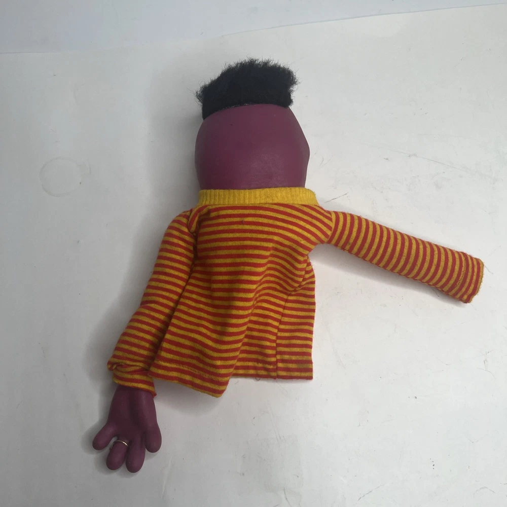 The Sesame Street Roosevelt Hand Puppet is a vintage toy featuring a plush vinyl head and hands, perfect for young children aged 1-7. This puppet is part of the beloved Sesame Street character family, making it a fun and interactive toy for both boys and girls. With its unique design and nostalgic appeal, this hand puppet is sure to bring hours of imaginative play to any child. missing one hand.