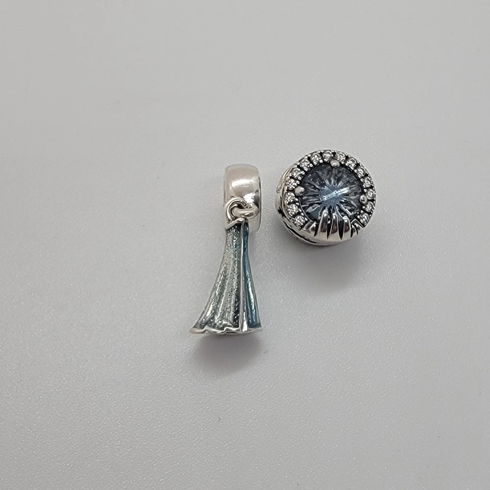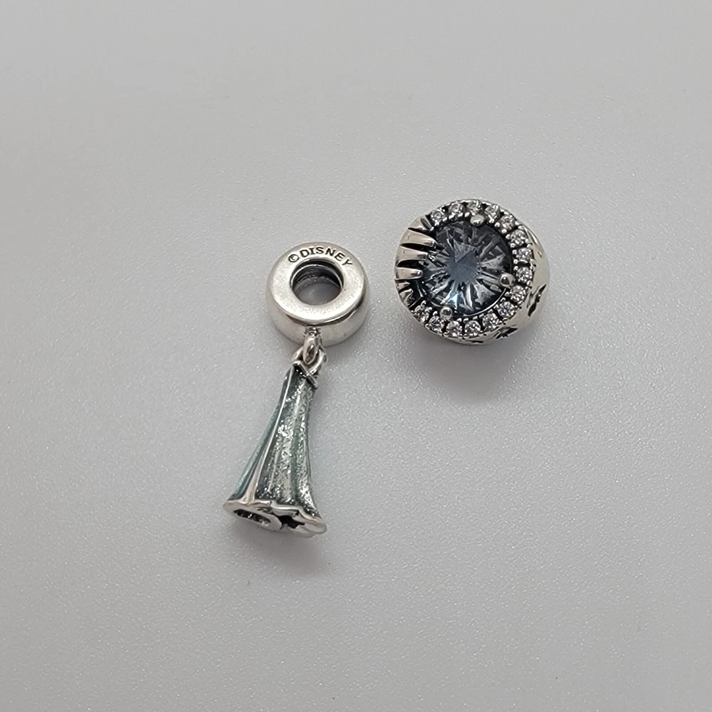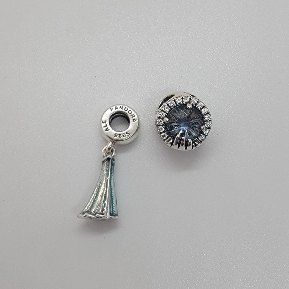 Set 2 New Pandora Authentic Disney Elsa's Dress Dangle and Frozen Crystal Charms The charms are new, never worn. Some charms are used for pictures and advertising purposes only. All charms come in Jewelry Pouch with Pandora logo on it. Bracelet and Box NOT INCLUDED.