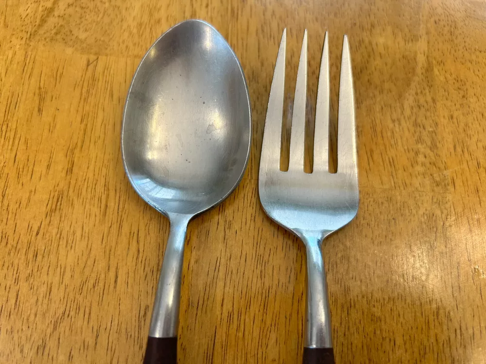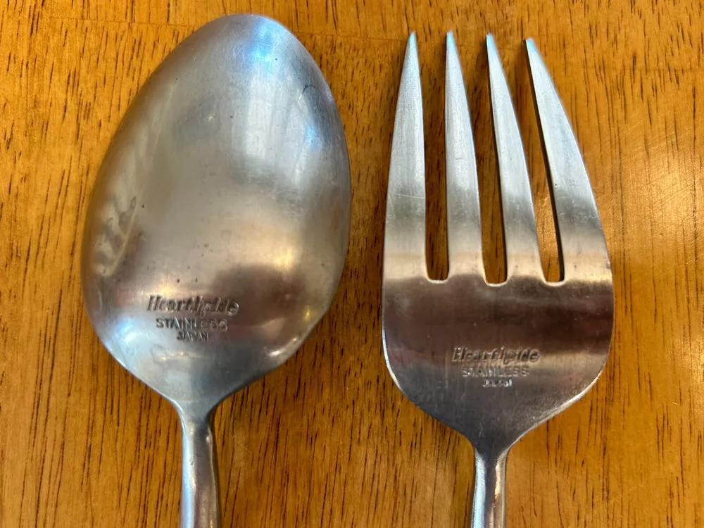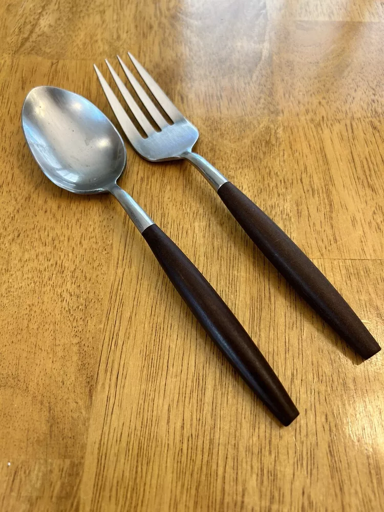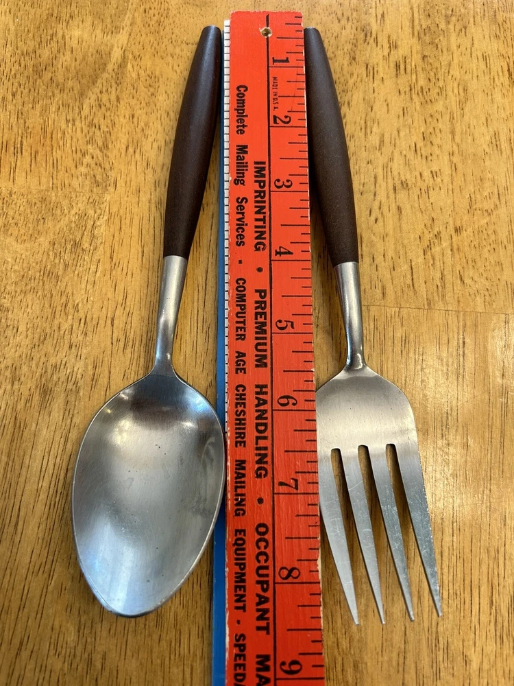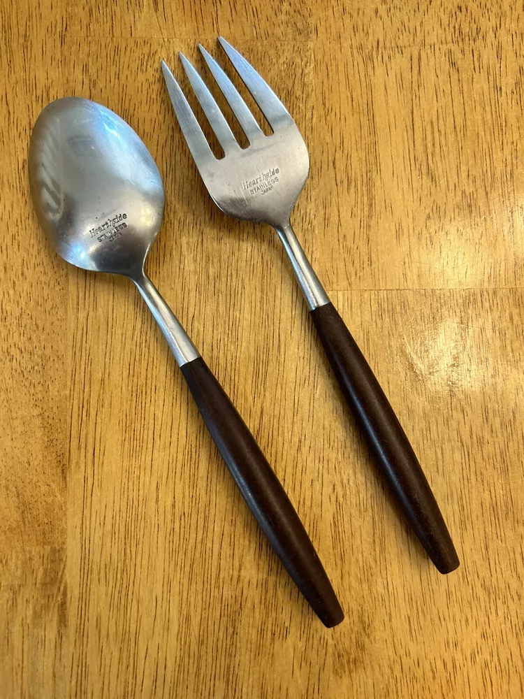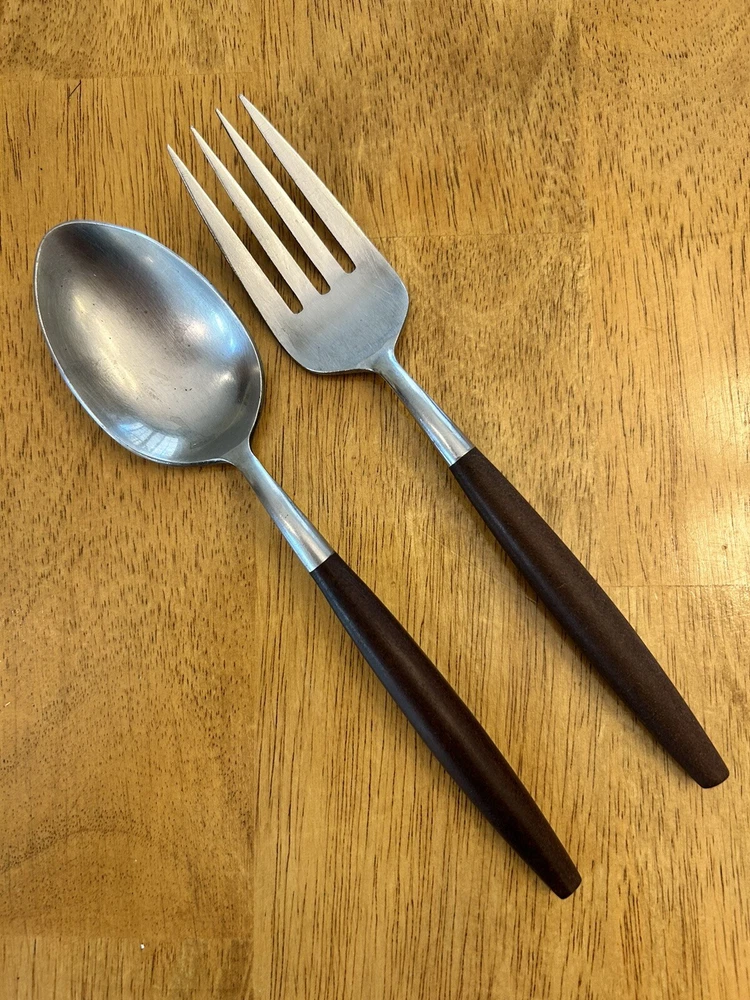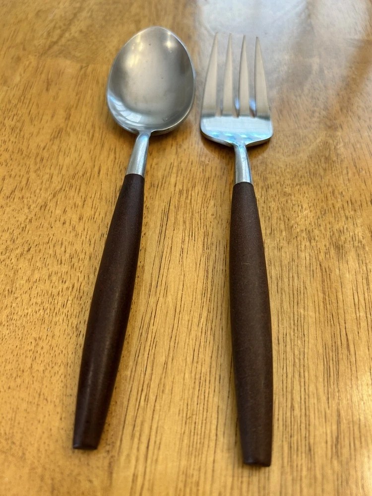 Set 2 Vintage Hearthside Serving Fork & Solid Spoon Stainless Made in Japan Brown Handle Vintage used condition- refer to pics Scratching scuffing from wear and use