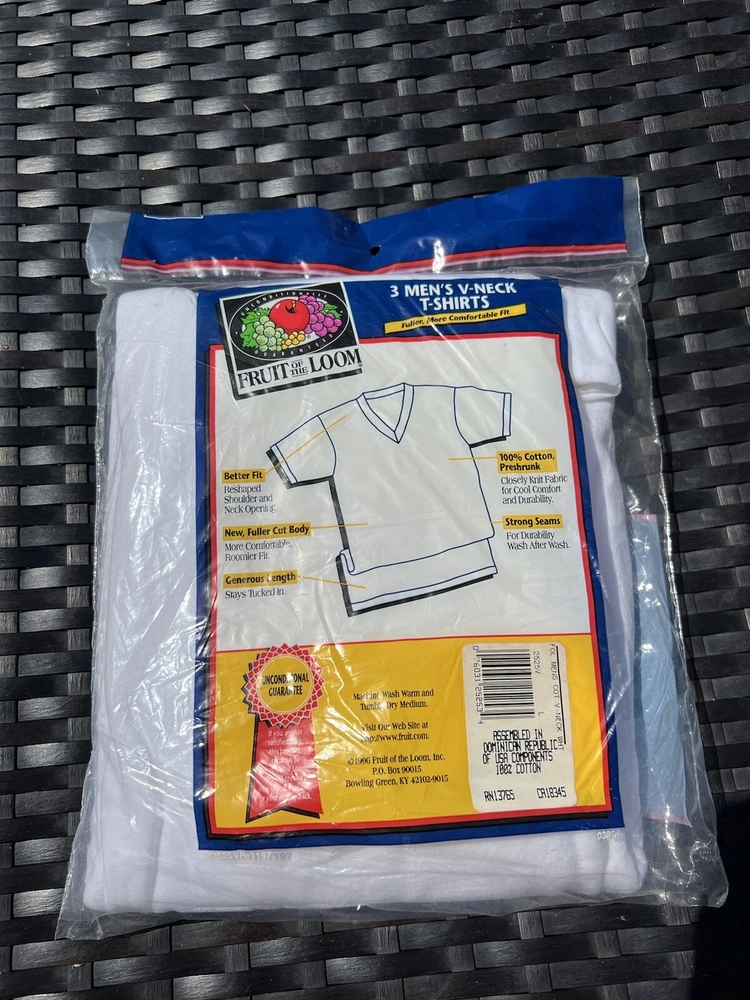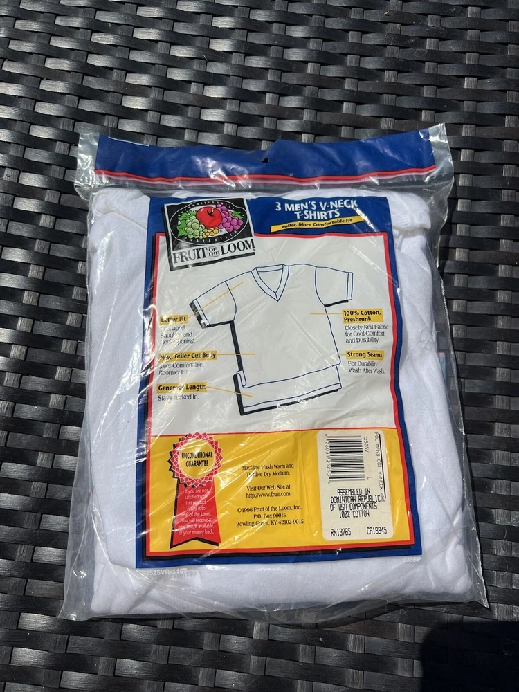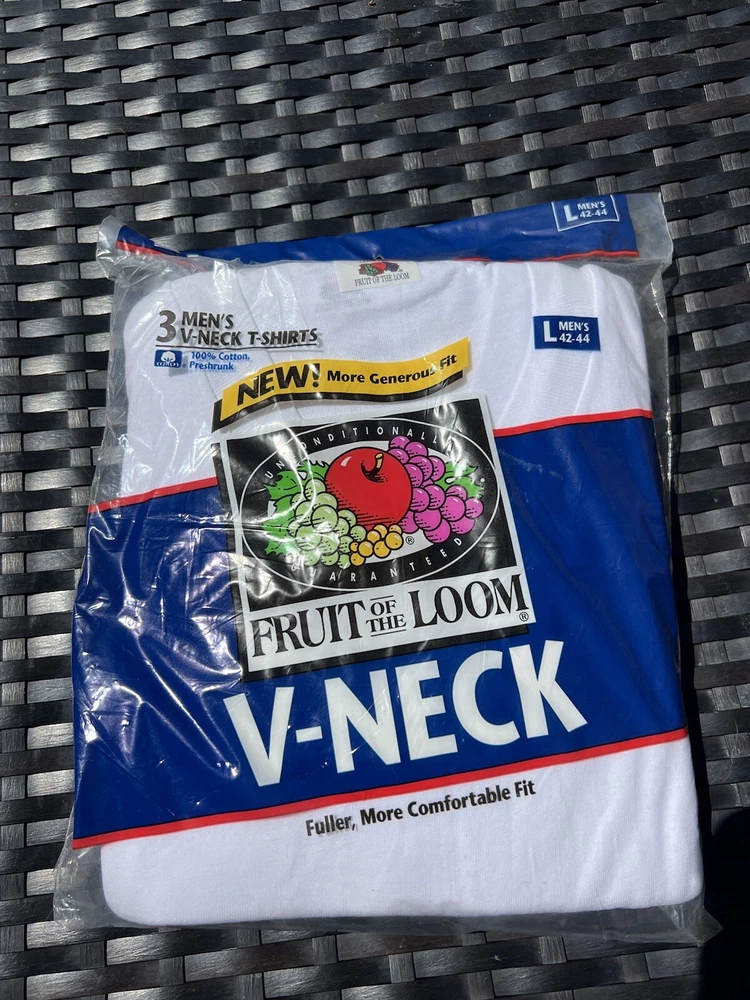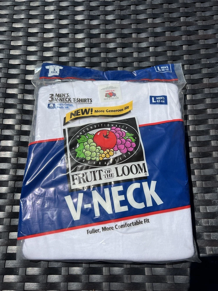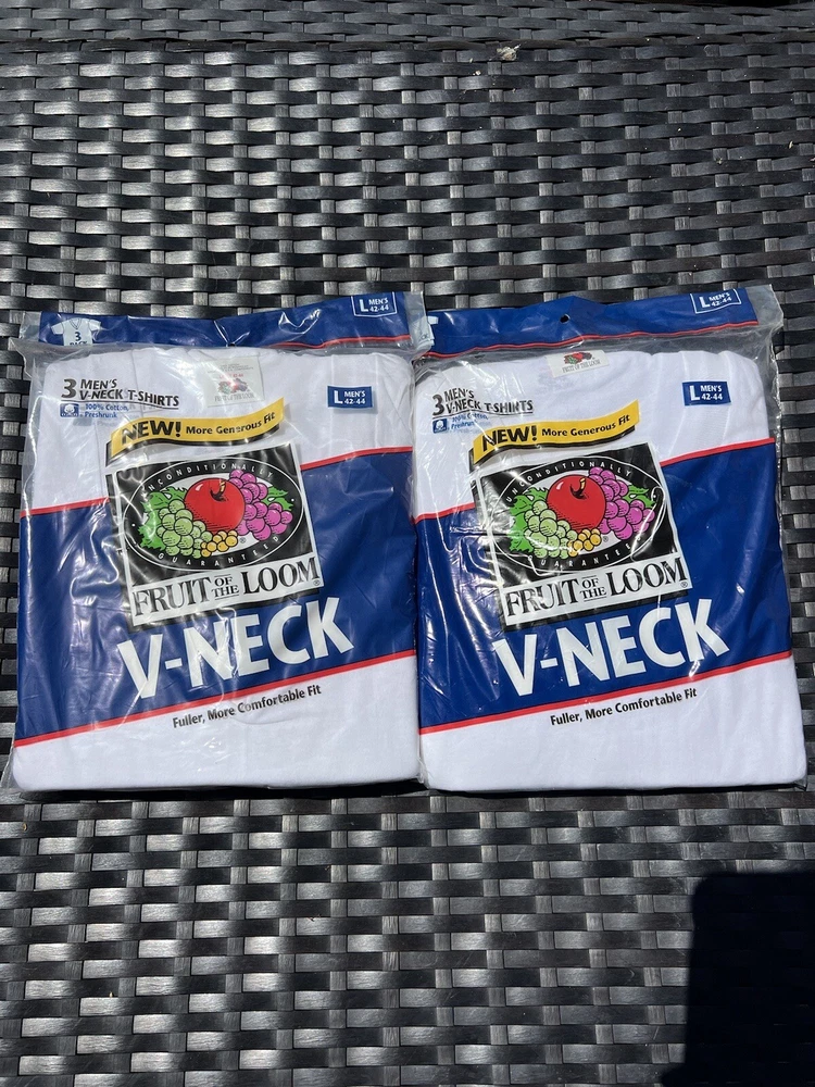 First off let me say thank you for taking the time to look at my auction. There are millions of auctions to look at, so I’m glad you made your way to mine! I take great pride in my eBay feedback, and strive for 5 star positive feedback. I know everyone works hard for their money and only want buyers to be 100 percent satisfied with their purchases. Im a one man show and try to have all items packed and shipped out within one business day from purchase. All items usually ship priority Mail or usps Ground Advantage, unless it’s a piece of luggage or a briefcase. Free shipping items will usually ship first class. All listings are USA only! If you have any issues with your purchase, please contact me before leaving feedback. I have no issues with making any purchase right! Thank you again. -Chris *I DO NOT SHIP TO APO’S OR PUERTO RICO*** I do not ship large items such as luggage to Hawaii or Alaska. Please inquire before bidding or purchasing. I take great pride in properly representing each item that i have for sale. Please take the time to look at each picture. I try to describe my items in words as well as i can, but pictures can often show things that i cannot describe. For this reason, i consider my pictures to be a key part of my items description. If you have any questions, please feel free to contact me prior to bidding so that i can address any questions prior to a purchase. Set of 2 new old stock 90s fruit of the loom v neck tee shirts. 6 total. Size large.