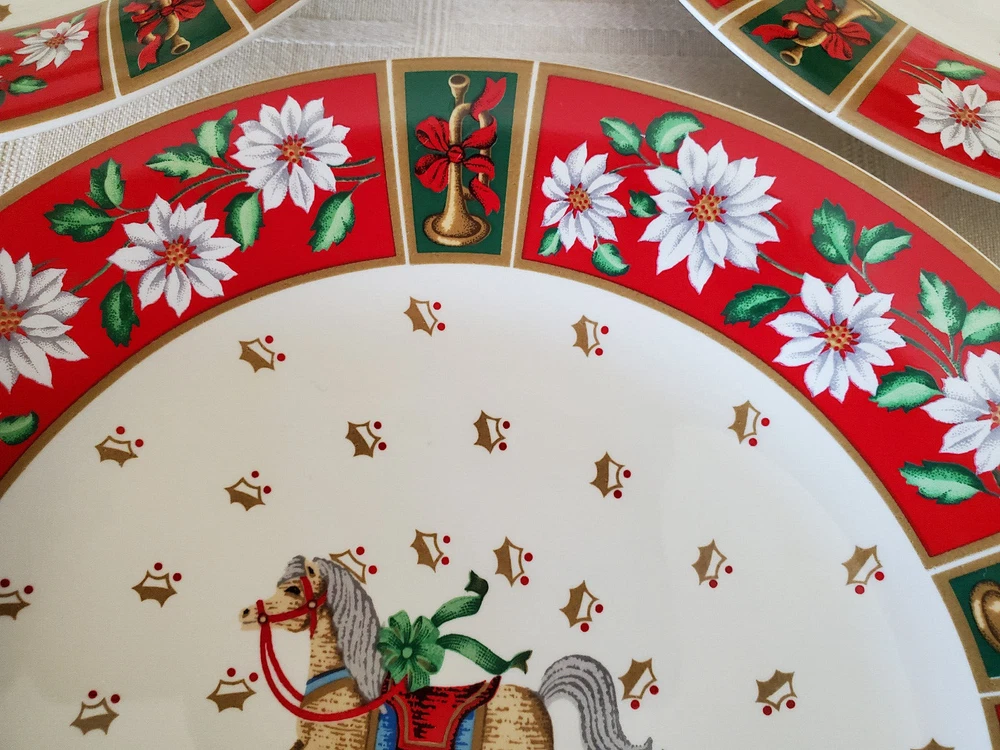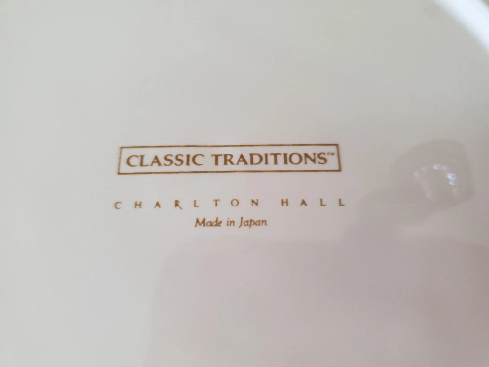 Set of 4 Charlton Hall by Kobe - Classic Traditions SALAD PLATES Produced between 1985-1995 Made in Japan Christmas Poinsettia Flowers - Golden Trumpets tied w/Red Ribbon Plates were NEVER USED - Stored in a plastic bin Measures 7.75" Round Diameter Questions ?? Please .. Just Ask !! Thank you for looking and please check out my other listings ! WILL Combine Shipping for you (IF Shipping is overpaid - WILL refund you back)