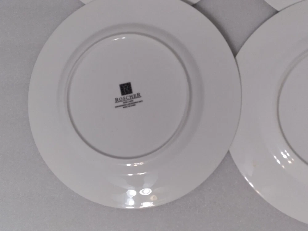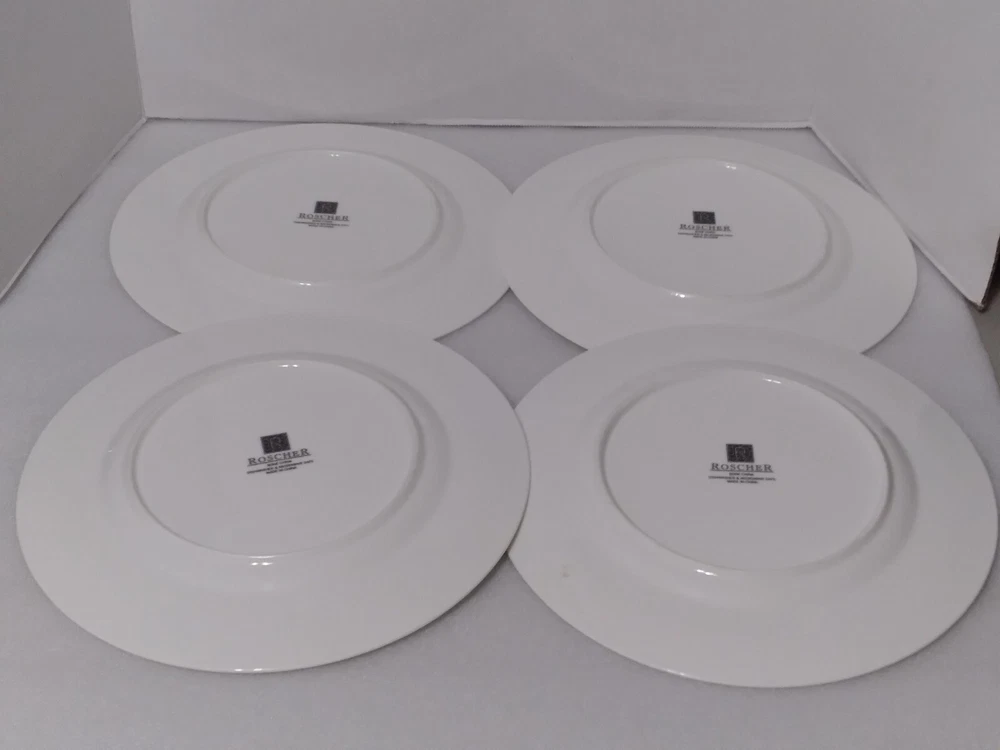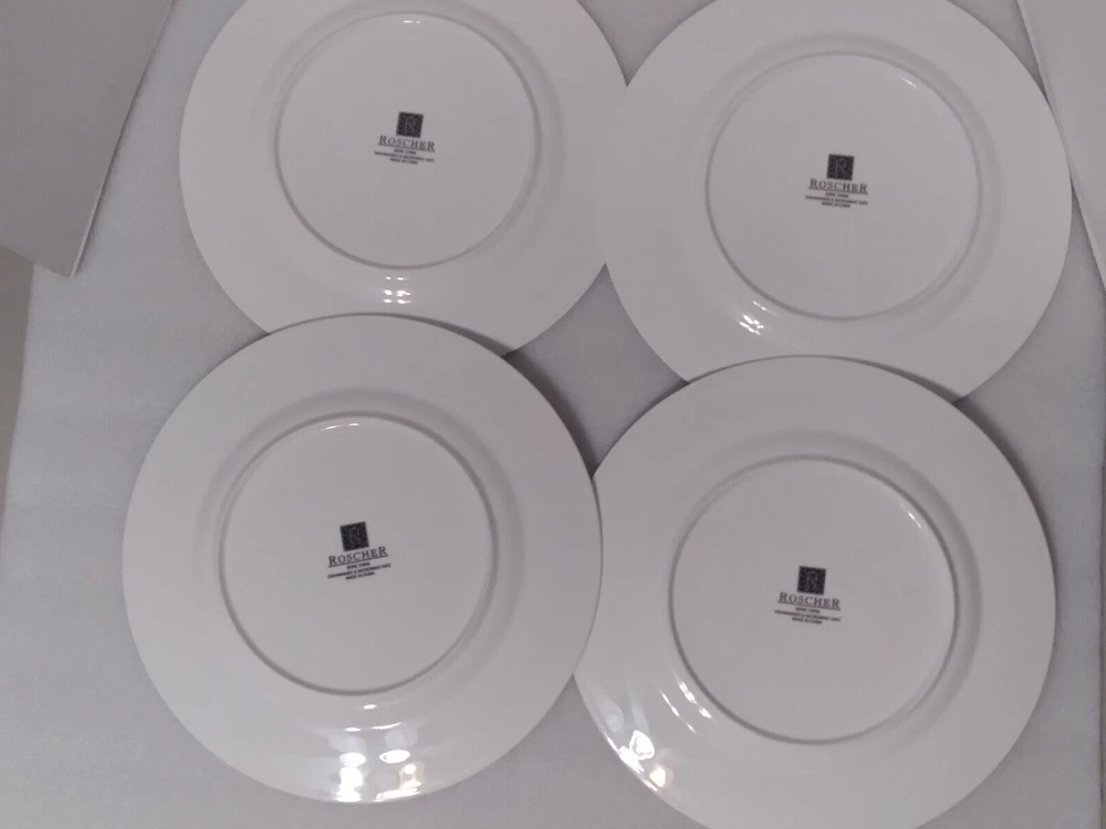 Set Includes:Plate SetBackstamp:PrintedPlate Diameter:11.25"Features:Dishwasher Safe, Microwave SafeBrand:RoscherNumber of Items in Set:Four-PieceStyle:ContemporaryColor:WhitePattern:Palm TreeShape:RoundMaterial:Bone ChinaType:Dinner PlatesFinish:GlossyOriginal/Licensed Reproduction:OriginalSeller Notes:“THESE DO HAVE LITE UTENSIL MARKS AND ON BACK TINY BROWN SPOTS ON SOME”