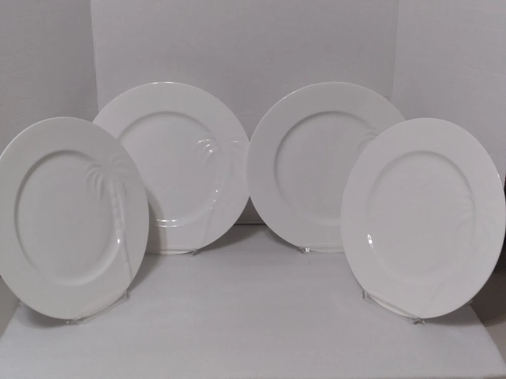 Set (4) Roscher BONE CHINA Solid White PALM TREE PATTERN Dinner Plates 11.25"