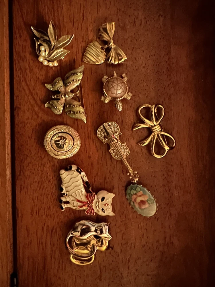 This is a set of 10 vintage Avon brooch pins, perfect for adding a touch of elegance to any outfit. These rare estate sells are a great addition to any jewelry collection. Each pin features a unique design and can be worn on any occasion. The brand Avon is known for its high-quality jewelry and these brooches are no exception. Get your hands on these stunning pieces today!