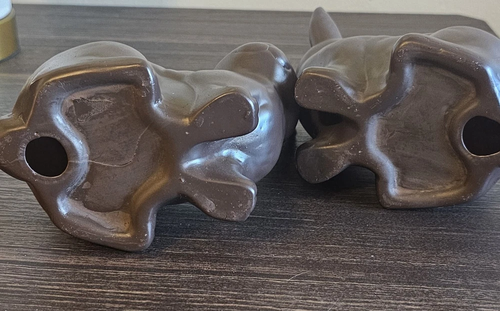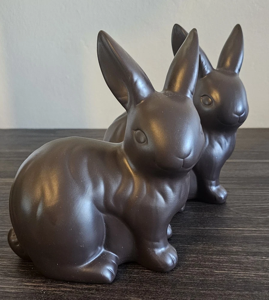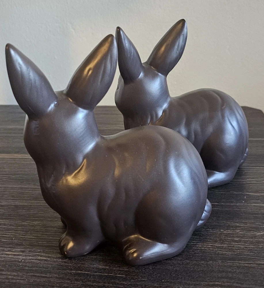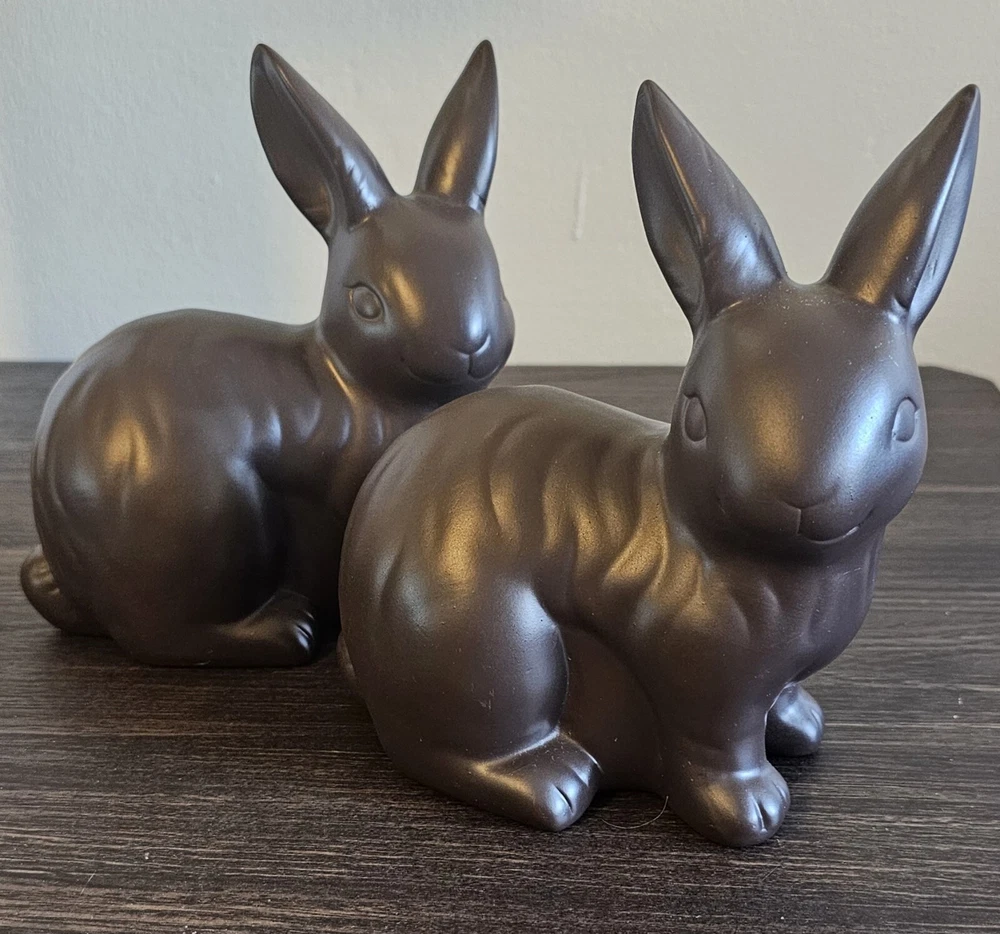Super cute set of 2 brown 'chocolate' bunnies. Possibly handmade & painted? Looks like a crack on the bottom of the one but it is not. Just the mold while being made.