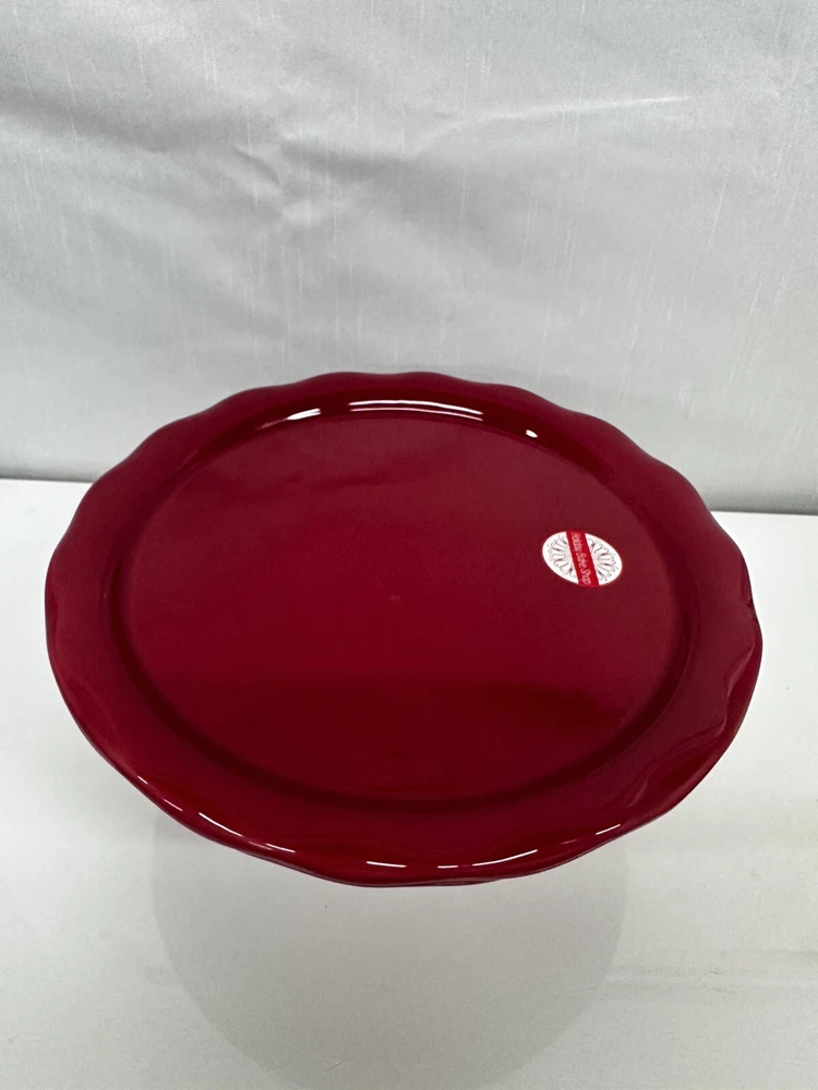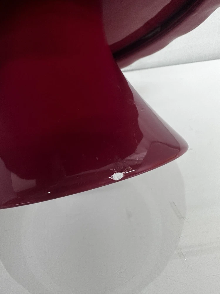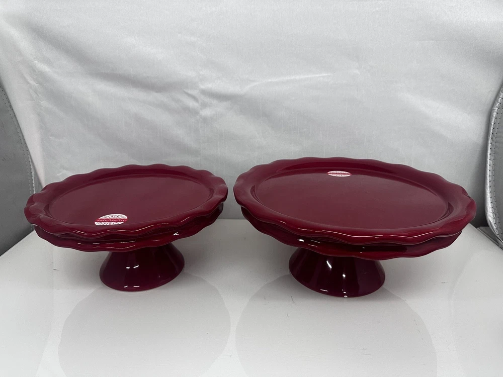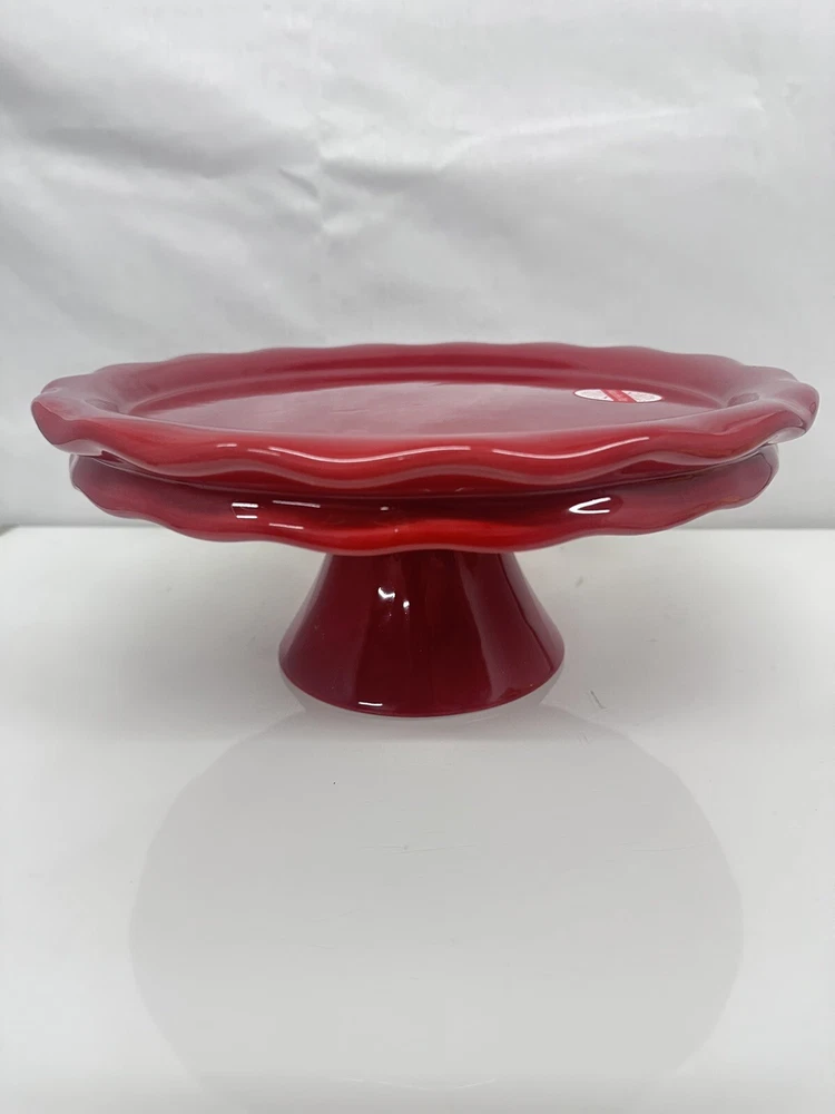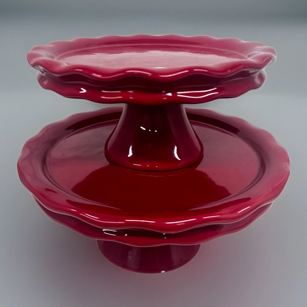 The bigger stand has a small white spot as it shown at the picture. Add a touch of elegance to your dessert presentation with this set of two cake pedestals. The round, footed plates are made of high-quality ceramic and come in diameters of 10" and 12", with a height of 5". The vibrant red color and ruffled design add a pop of color and a feminine touch to any occasion. Perfect for weddings, parties, or just a sweet treat for yourself, these cake stands are sure to impress. The set includes two items and is ideal for displaying your favorite desserts.