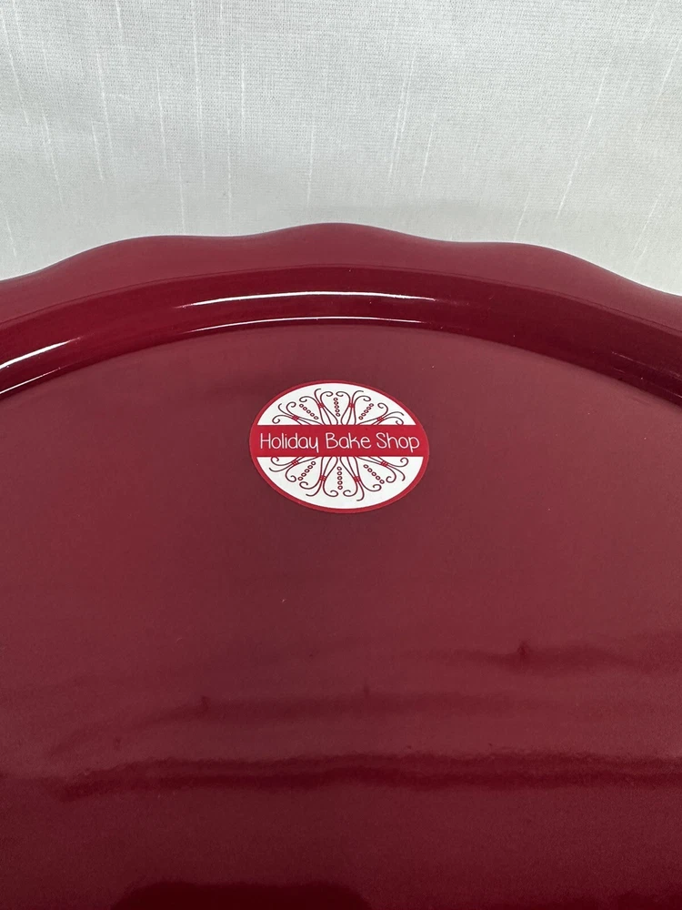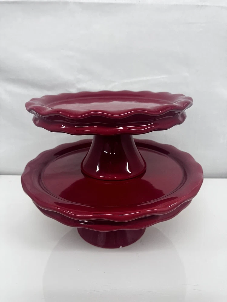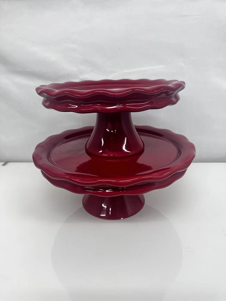 Set Of 2 Cake Pedestal 10" and 12" Round Red Ruffled Footed Plate Ceramic