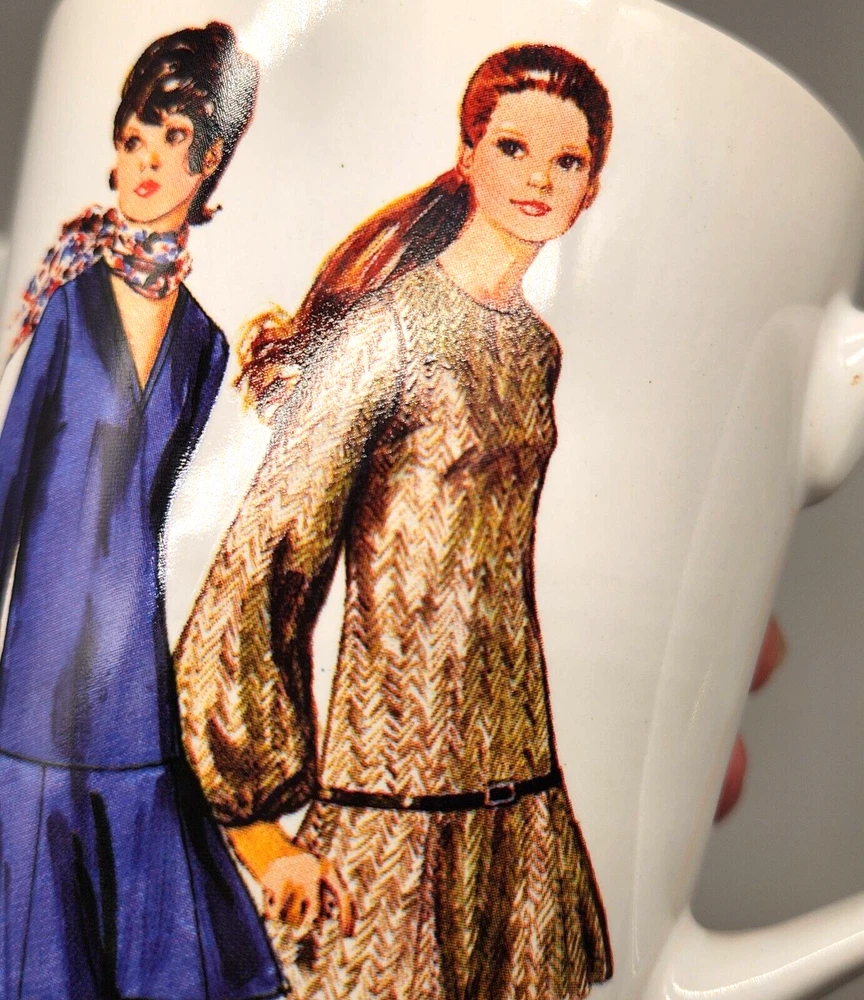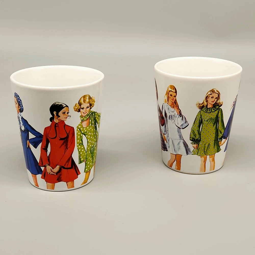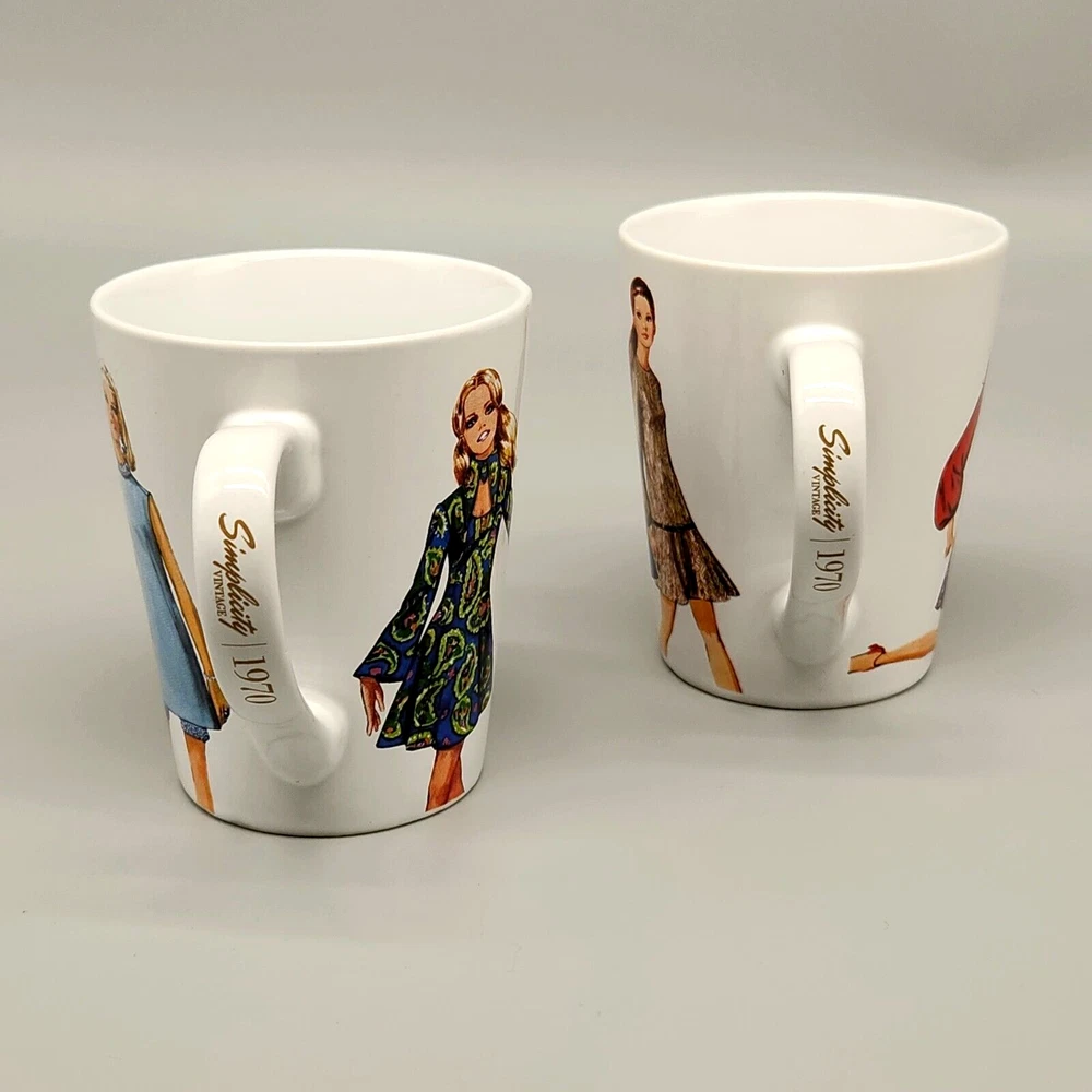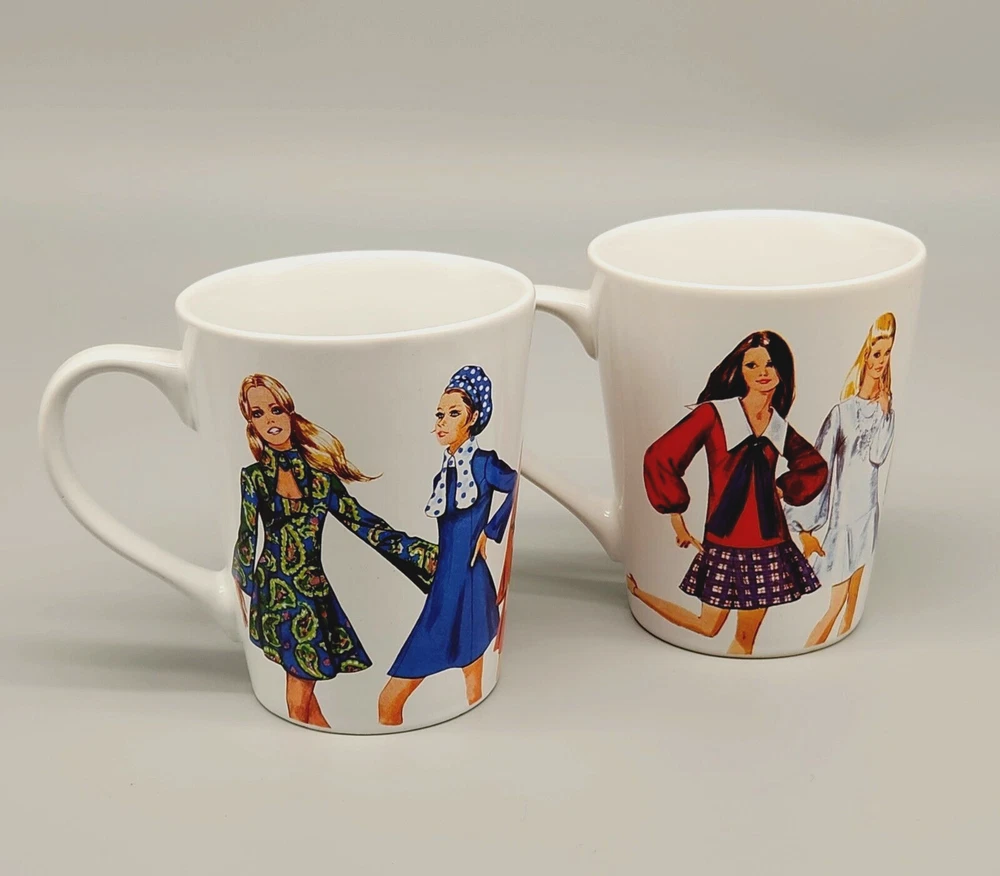 Sip your coffee like it's 1970, darling! These mugs feature groovy fashionistas strutting their stuff in retro threads. If only they could talk, they'd probably spill the tea on disco nights and roller-skating dates. Embrace the nostalgia and serve up some fabulousness with every cup. • Set of 2 mugs • Simplicity Vintage design • Durable ceramic material • Fashion prints from 1970 • Comfortable handles Height = 4 inches Used but in very good condition. No chips or cracks. See photos for details.