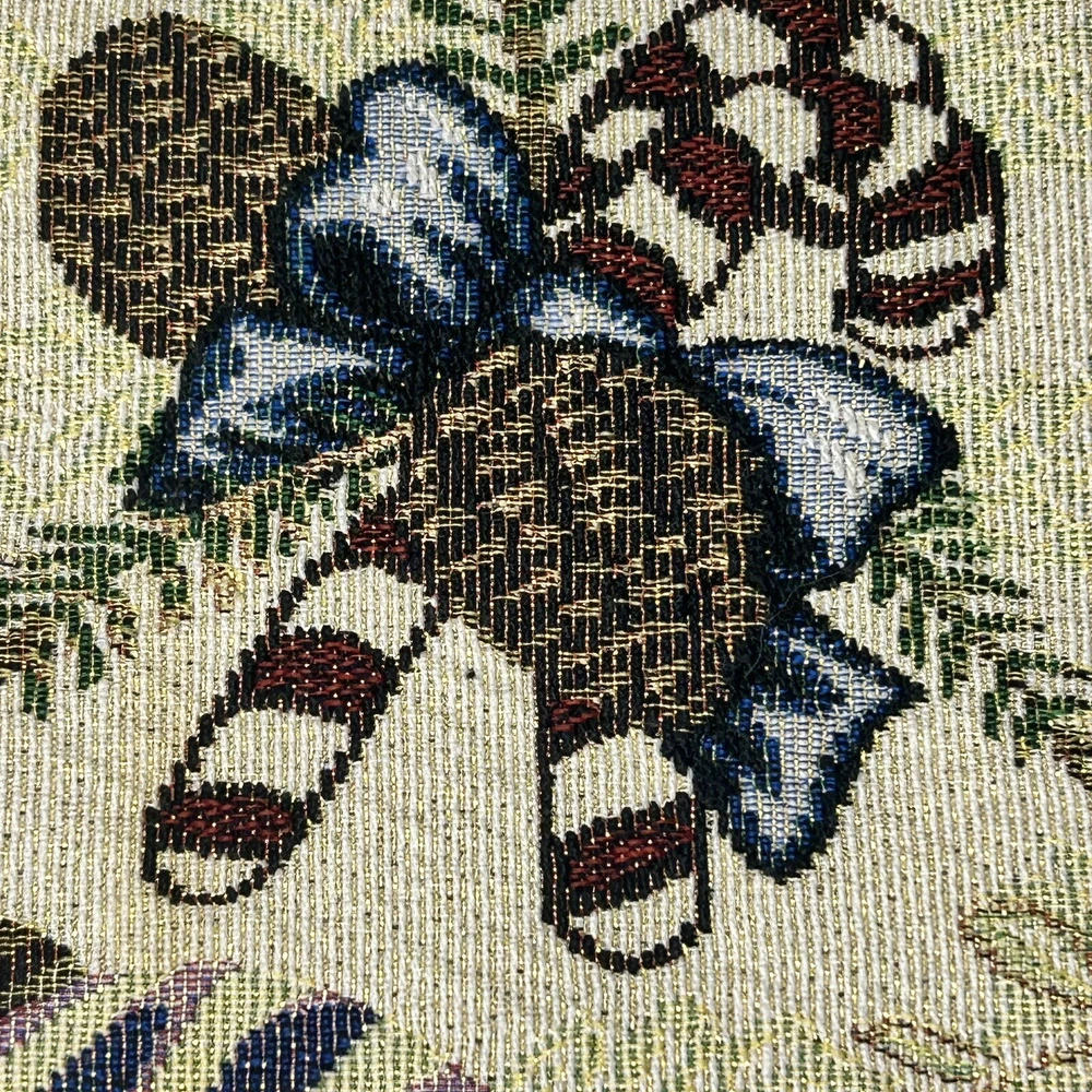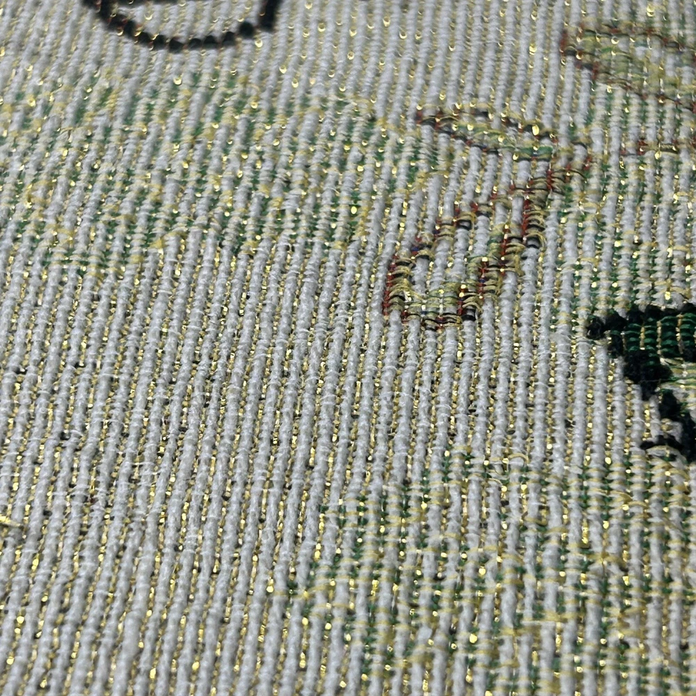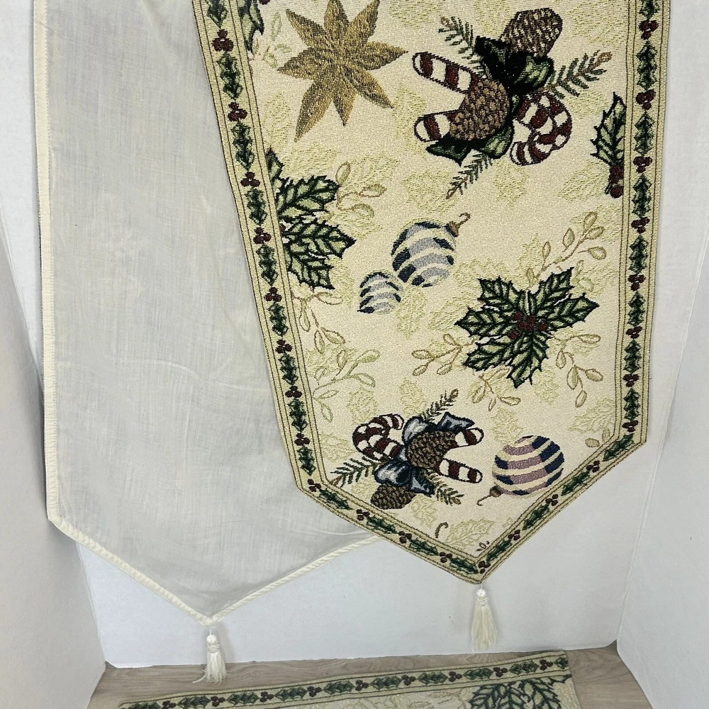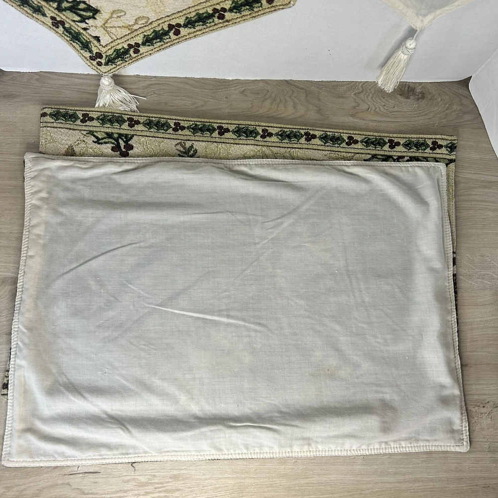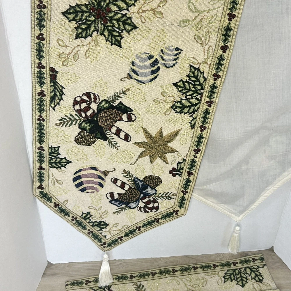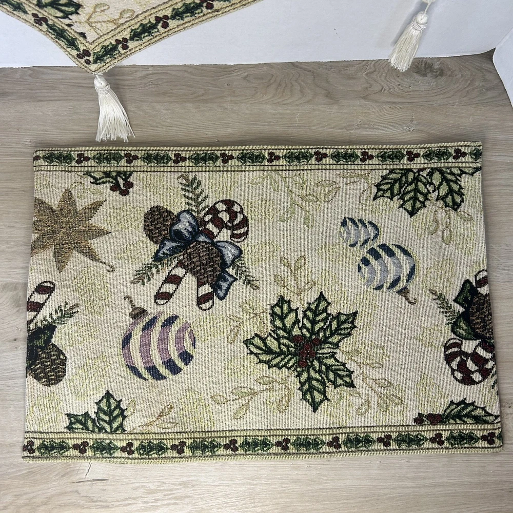 Set of 2 tapestry placemats and matching table runner. Christmas holly and candy cane design with gold thread woven in to give some sparkle. Placemats are 19” x 13” and runner is 70” long. All in great condition with no rips or stains.