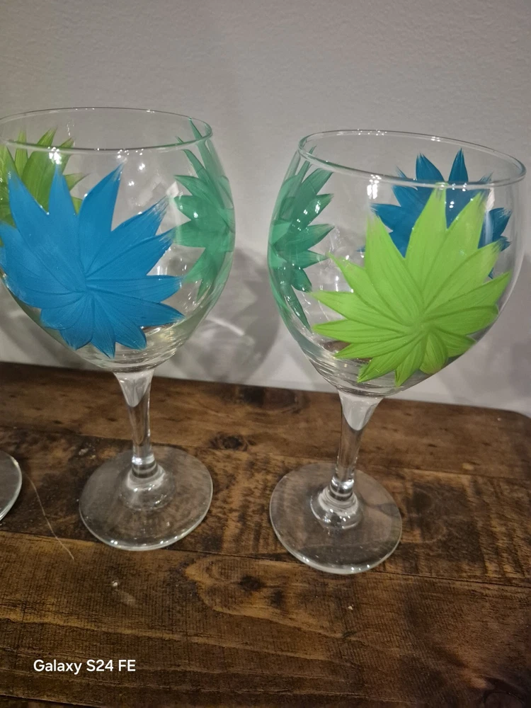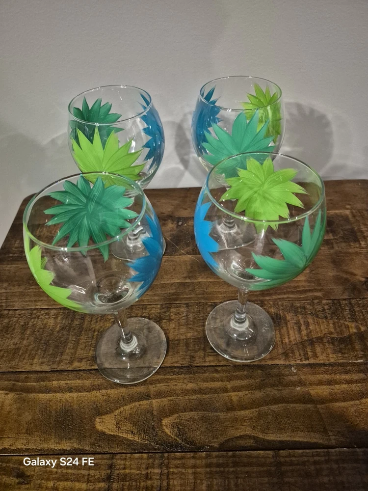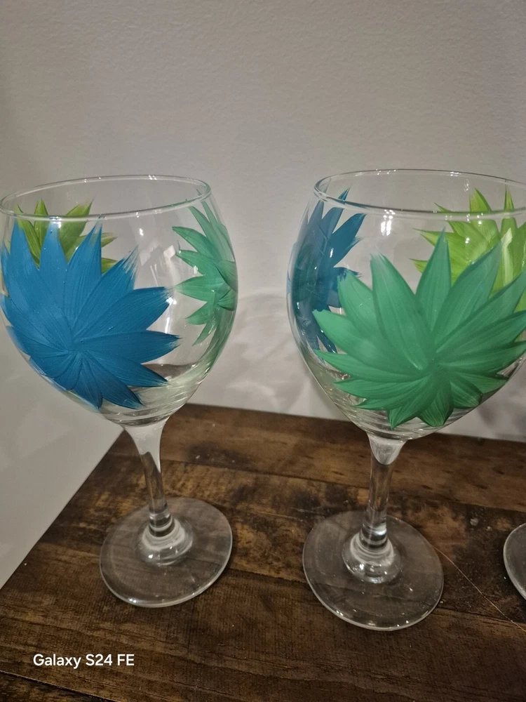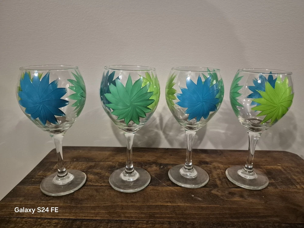 Set Of 4 Hand Painted Wine Glaases Blue & Green Floral 9"