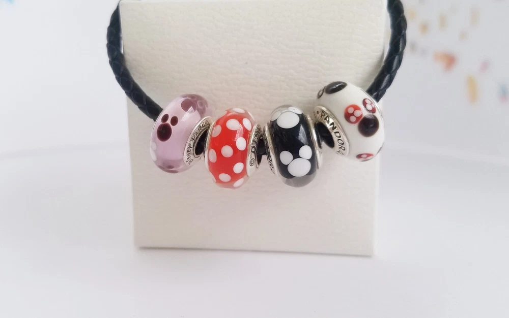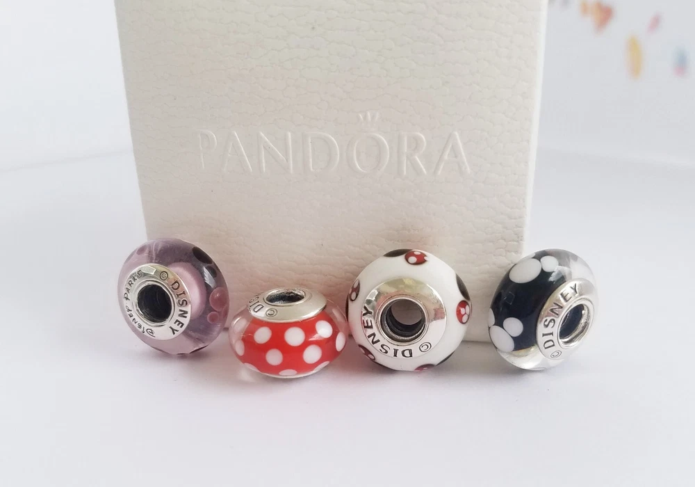 Set Of 4 New Pandora Authentic Disney Mickey and Minnie Murano Charms The charms are new, never worn. Some charms are used for pictures and advertising purposes only. All charms come in Jewelry Pouch with Pandora logo on it. Bracelet and Box NOT INCLUDED.