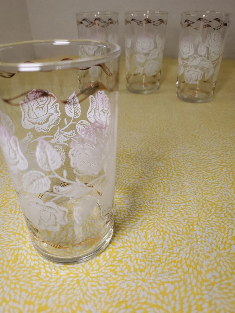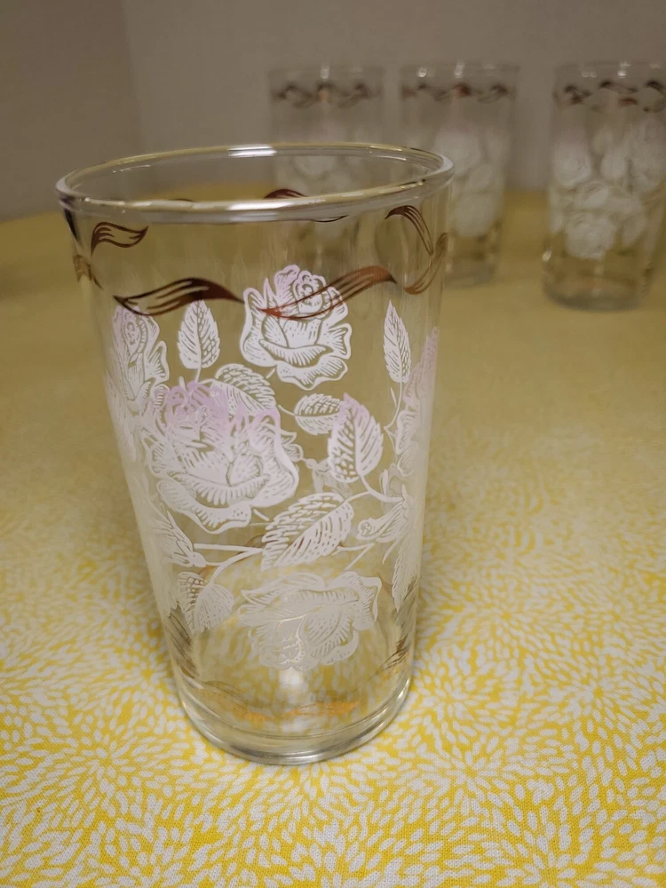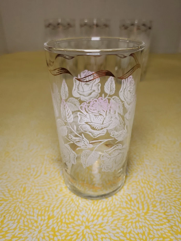THANK YOU FOR VISITING OUR STORE. WE SHIP 6 DAYS A WEEK (UNLESS THERE IS A FEDERAL HOLIDAY). MOST ITEMS WILL SHIP IN A STURDY BOX AS NEEDED. PLEASE FEEL FREE TO REACH OUT IF YOU HAVE ANY QUESTIONS. WE WILL COMBINE SHIPPING WHEN AVAILABLE. Add a touch of Mid-Century Modern charm to your drinkware collection with this set of four vintage Libbey glass tumblers. Featuring a beautiful white rose leaf design with gold ribbon detailing, these glasses are perfect for any occasion from birthdays to anniversaries. With a capacity of 10-15 oz., they are ideal for both casual and formal occasions. Crafted in Ohio in 1960, these glasses are a true vintage original. The round shape, etched and decorated features, and glossy finish make them a stunning addition to any bar or kitchen. Hand wash only and measuring 6.5 inches in height, these glasses are a must-have for any collector of art glass.