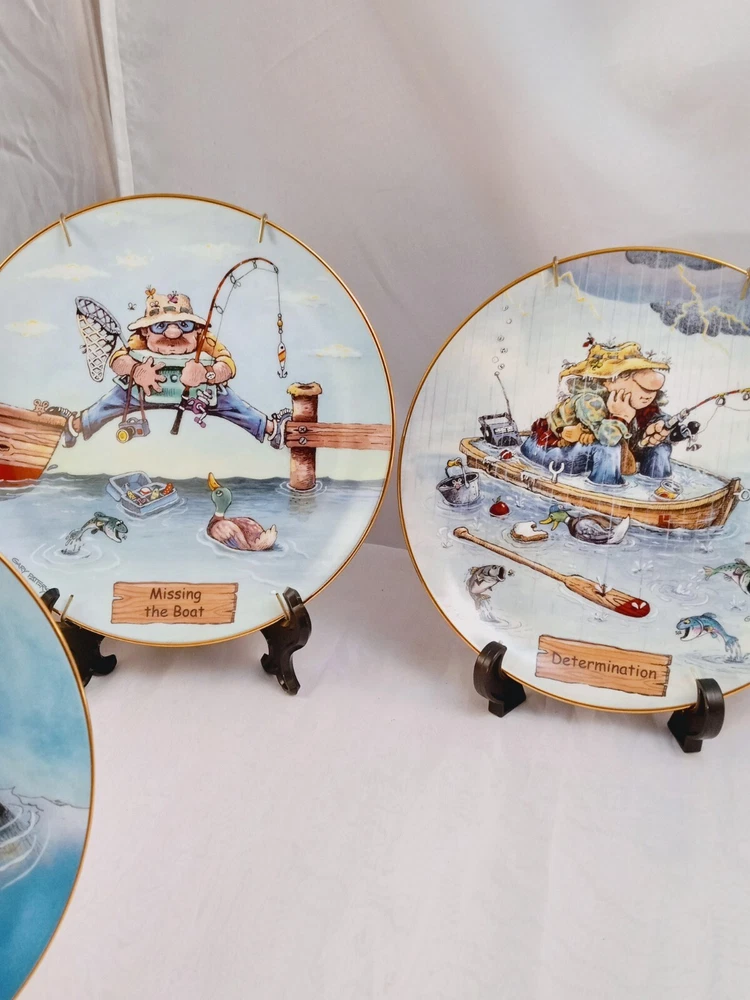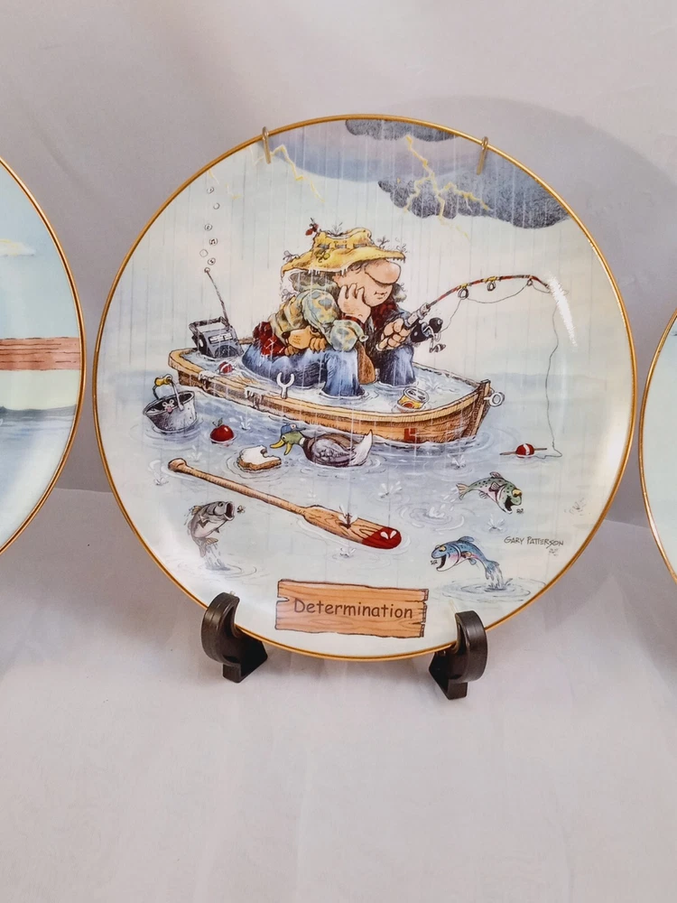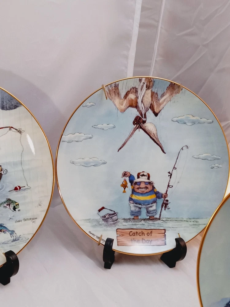 The product is a set of 5 collector plates from "The Art of Fishing" series by Gary Patterson. Each plate is 8 inches in diameter, made of porcelain, and features a cartoon fisherman theme. The plates are multicolored and decorative, showcasing a round shape. They are part of the Danbury Mint brand and are numbered as part of a limited collection.