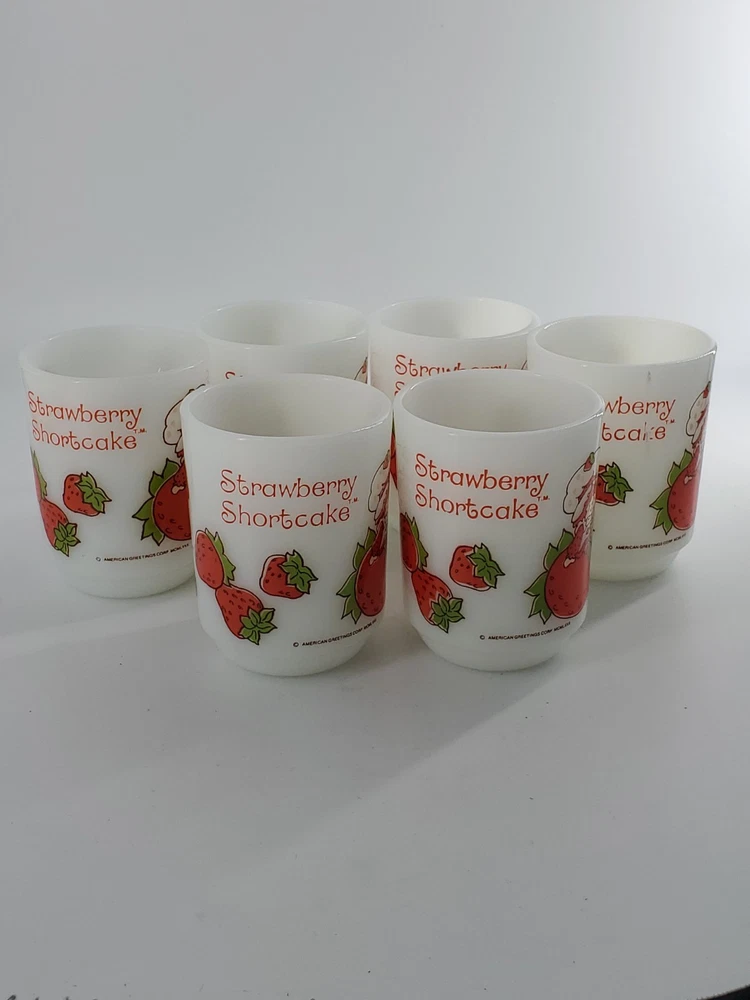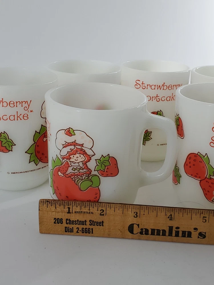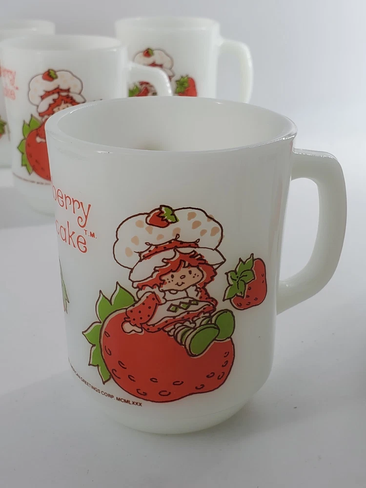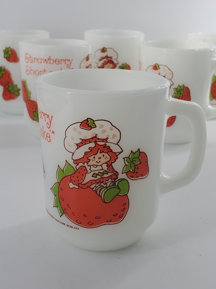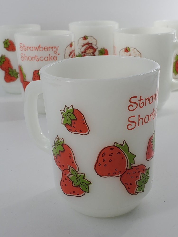 Delightful vintage find! This set of 6 Strawberry Shortcake mugs from the 1980s are so fun. These are 10 oz milk glass mugs by Anchor Hocking which feature a round shape and medium size, perfect for serving hot or cold beverages. The mugs are painted with a strawberry design, representing the popular 1980s cartoon and TV characters franchise. Made of white milk glass with a capacity of 10 oz, these mugs are a collectible piece for fans of Strawberry Shortcake and collectors of vintage kitchen decor. The mugs are decorated with handles and are suitable for hand wash only to maintain their original condition. These mugs are in fantastic condition with no chips or cracks and only minor paint loss on a few of the mugs. See pictures.