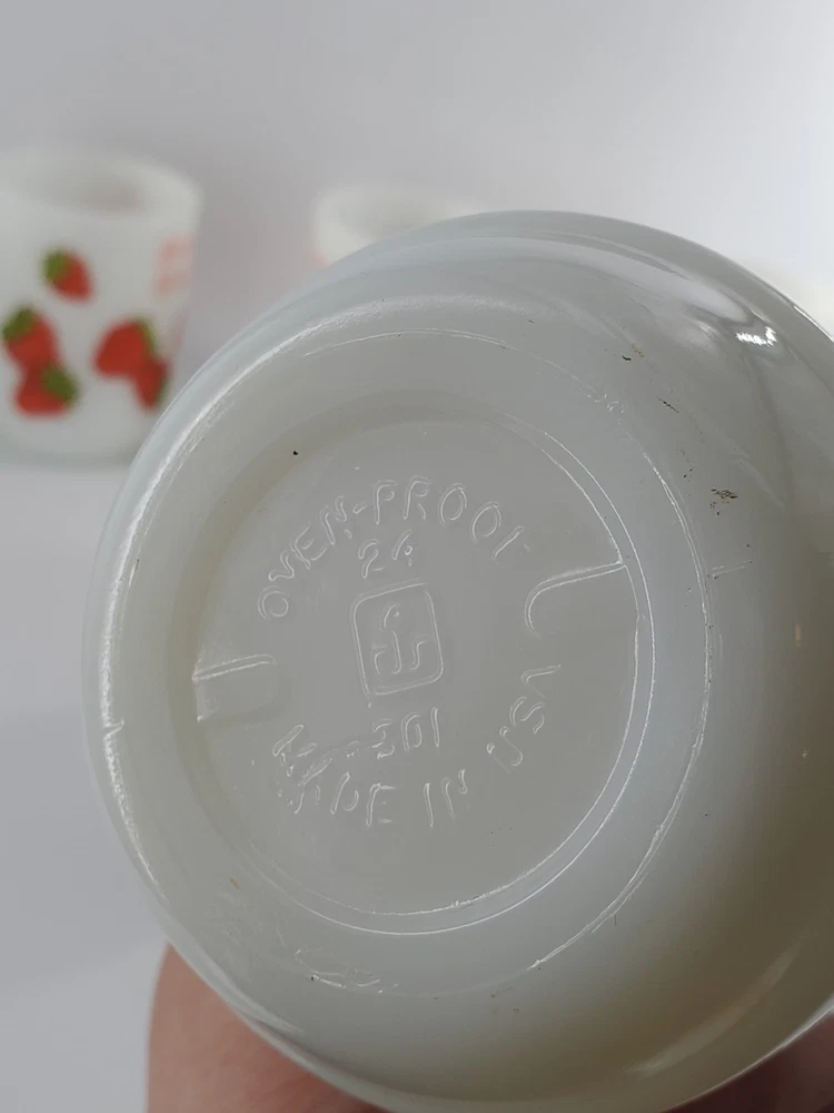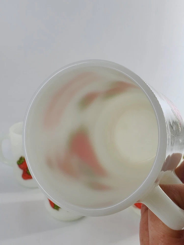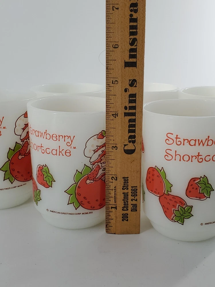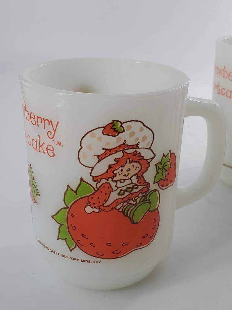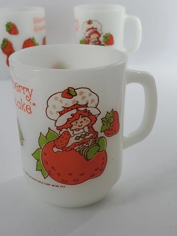 Delightful vintage find! This set of 6 Strawberry Shortcake mugs from the 1980s are so fun. These are 10 oz milk glass mugs by Anchor Hocking which feature a round shape and medium size, perfect for serving hot or cold beverages. The mugs are painted with a strawberry design, representing the popular 1980s cartoon and TV characters franchise. Made of white milk glass with a capacity of 10 oz, these mugs are a collectible piece for fans of Strawberry Shortcake and collectors of vintage kitchen decor. The mugs are decorated with handles and are suitable for hand wash only to maintain their original condition. These mugs are in fantastic condition with no chips or cracks and only minor paint loss on a few of the mugs. See pictures.
