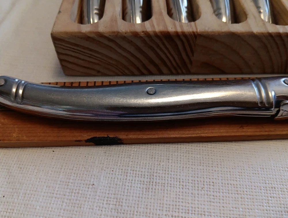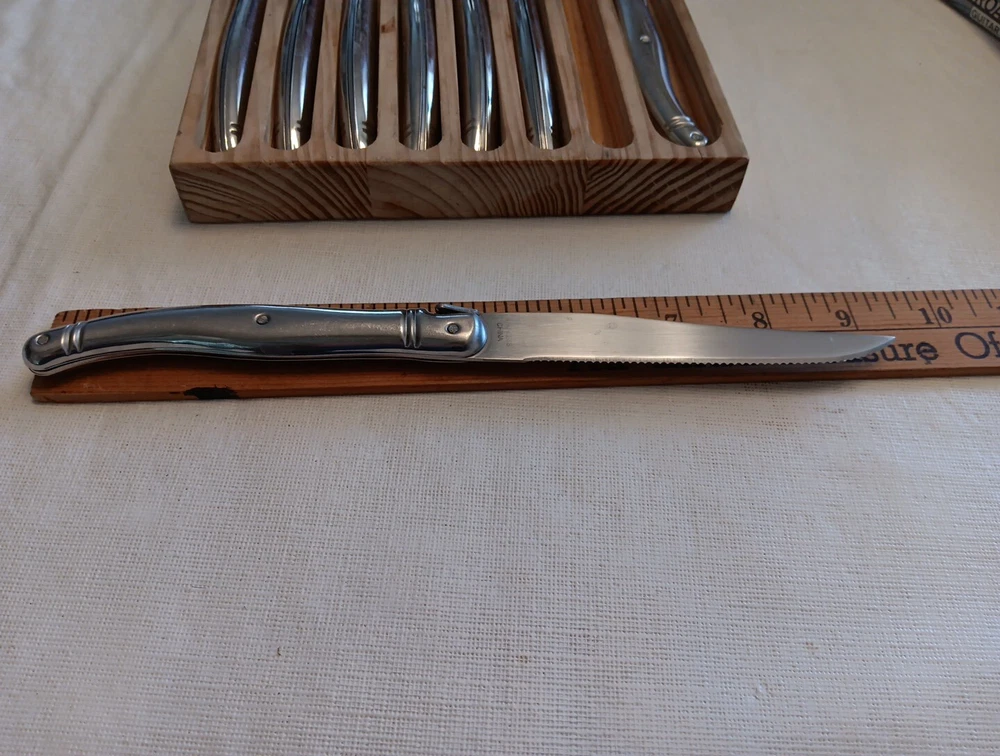 This set of 8 stainless steel steak knives features a serrated blade with a length of 4.5 inches, ideal for effortlessly cutting through meat. The knives have handles adorned with a bee design, adding a touch of elegance to your dining table. Made from high-quality stainless steel, these knives are durable and reliable for everyday use. Perfect for steak lovers or anyone who enjoys a well-crafted cutlery set, this product is a stylish and functional addition to any kitchen or dining room.