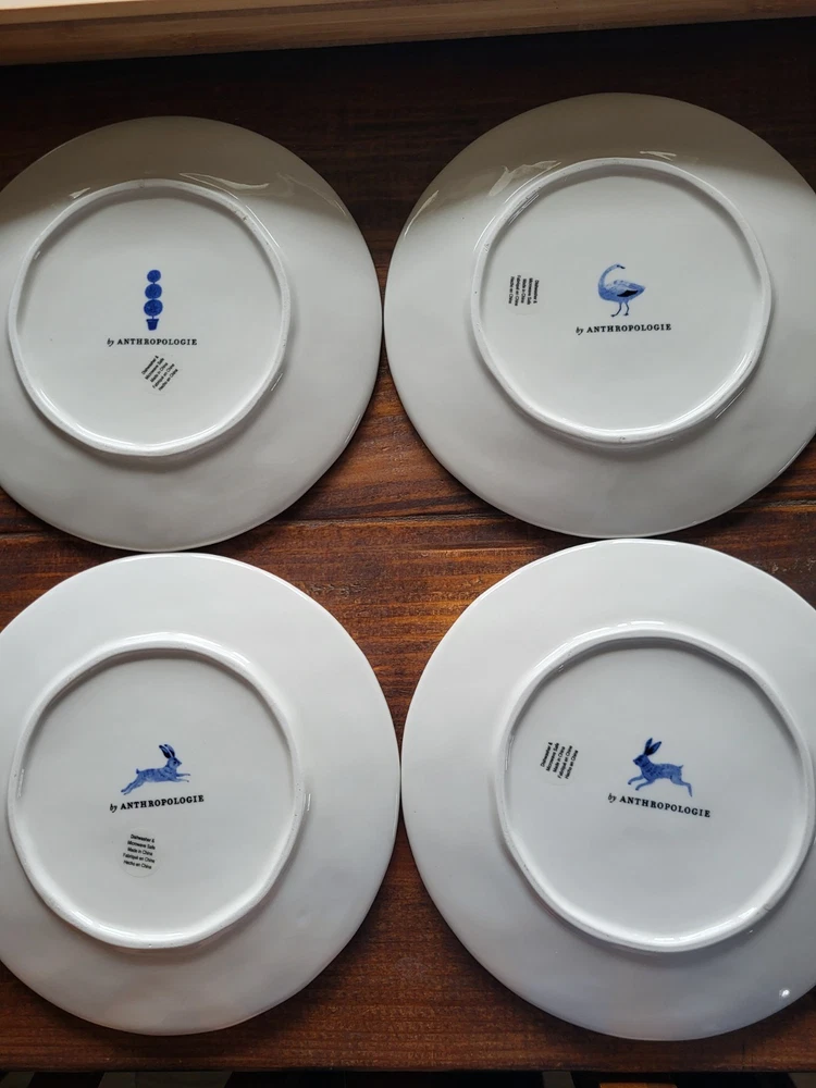 This set of four Anthropologie plates features a beautiful floral and nature-inspired pattern, perfect for all occasions. Made of ceramic with a shiny finish, these round plates have four compartments and come in a vibrant multicolor palette. Ideal for adults, this original plate set by Anthropologie is dishwasher safe for easy cleaning, making it a stylish and practical addition to any dining collection. 8 inches in diameter