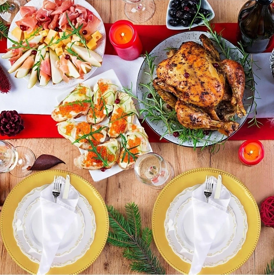 **This is a new never used open-box item. Plates have no signs of wear and are guaranteed unused.** **These plates are not for direct food use** Deliverables: The package includes 12 beaded charging plates, each measuring approximately 13 inches (33 cm) in diameter. These plates are designed to seamlessly complement 10-inch dinner plates and 7-inch salad plates, serving as an ideal decorative element for your table setting. The dimensions and quantity provided are sufficient to address your daily operational, replacement, and distribution requirements. Material Integrity: These beaded charger plates are constructed from high-quality, robust plastic, offering ample thickness to support substantial food items. This material ensures durability, resisting deformation and breakage, and is suitable for repeated use. Furthermore, their design facilitates ease of transport, making them appropriate for both indoor and outdoor events. Refined Aesthetics: The gold-painted charging dishes, adorned with beads, present a sophisticated and understated appearance. Their classic round form, coupled with the exquisite beading along the edges, introduces an element of elegance to your dining presentation. Spill Prevention: These gold-painted charger plates with beads are designed to be positioned beneath soup bowls and dinner plates, effectively preventing food spills. They are compatible with various banquet table arrangements, accommodating everything from salad plates to main course plates, thereby maintaining the cleanliness and order of your table. Concurrently, they contribute a stylish flair to your event and enhance the overall dining experience. Versatile Application: These round charger plates are well-suited for a diverse range of occasions, including dinner parties, birthday celebrations, weddings, engagements, bridal showers, baby showers, Thanksgiving, and other festive gatherings, making them an excellent enhancement to any dining table. Ships within 1 business day.