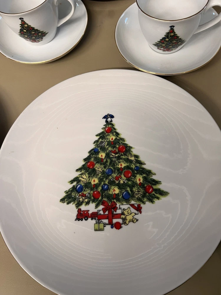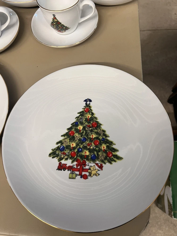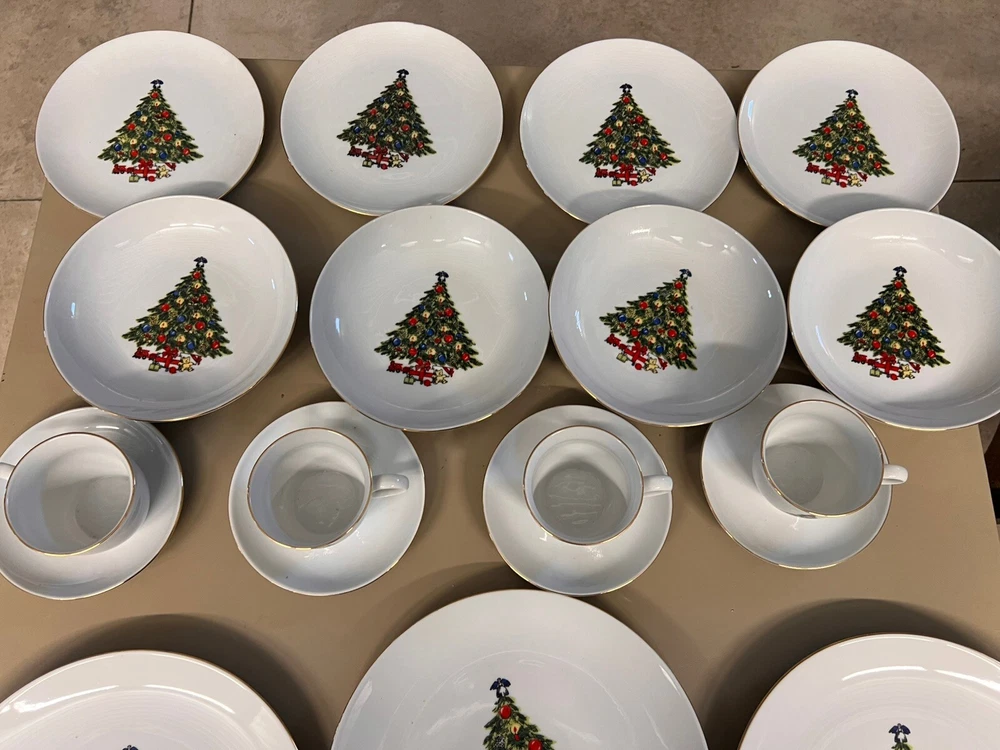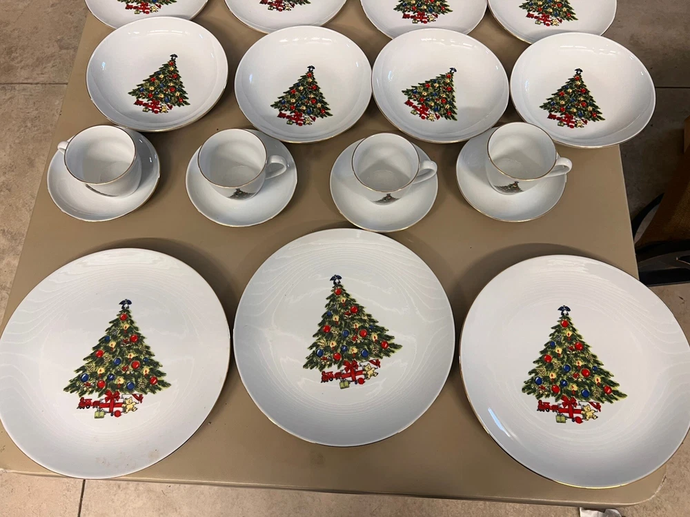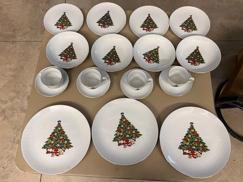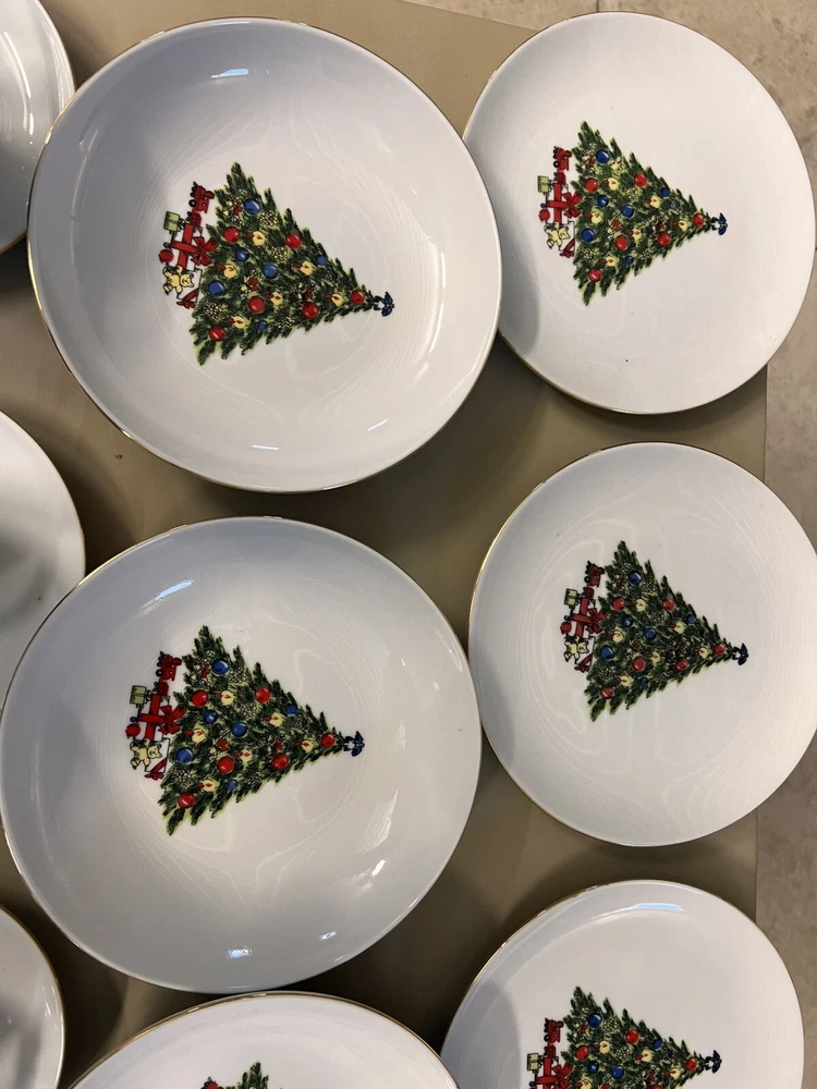 Celebrate the holiday season with this limited edition Jamestown China Christmas Treasure service for 4. The set includes a sauce plate, salad plate, bowl, dinner plate, and cup, all featuring a festive Christmas tree pattern in white porcelain. The round shape and glossy finish of each piece make them stackable and decorative. This vintage set is an original and licensed reproduction from China, with a printed backstamp. Hand wash only and perfect for any Christmas occasion, these plates are a retro addition to your dinnerware collection. Get ready to impress your guests with this elegant and unique Christmas Treasure set from Jamestown China. Missing one plate.
