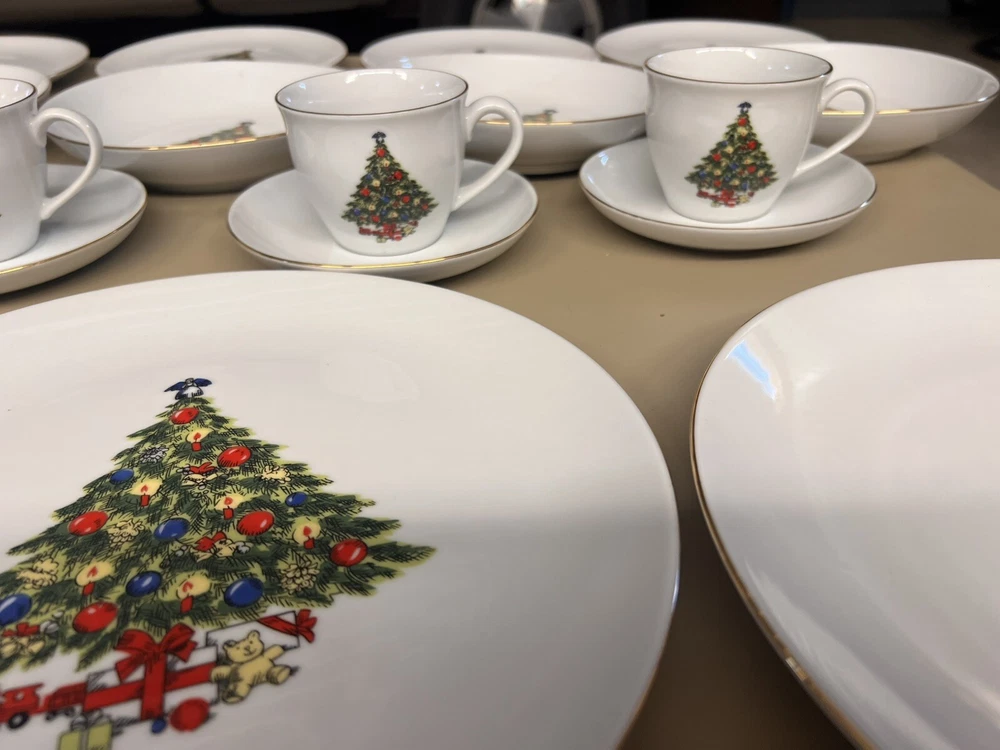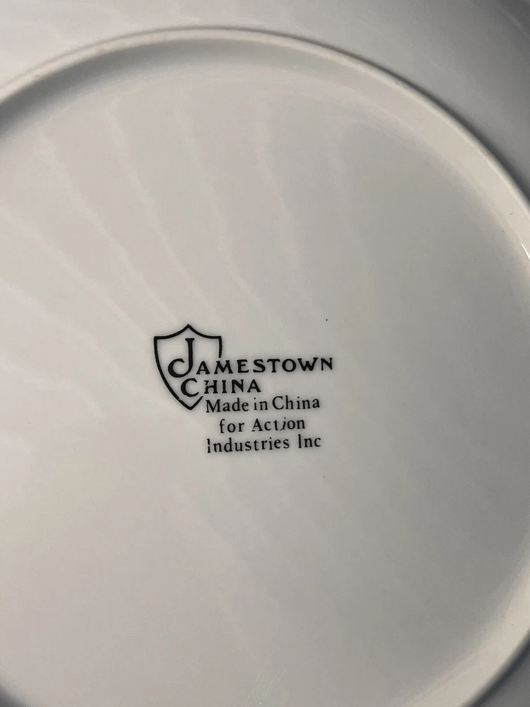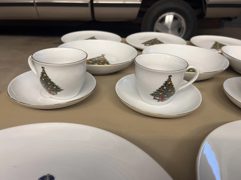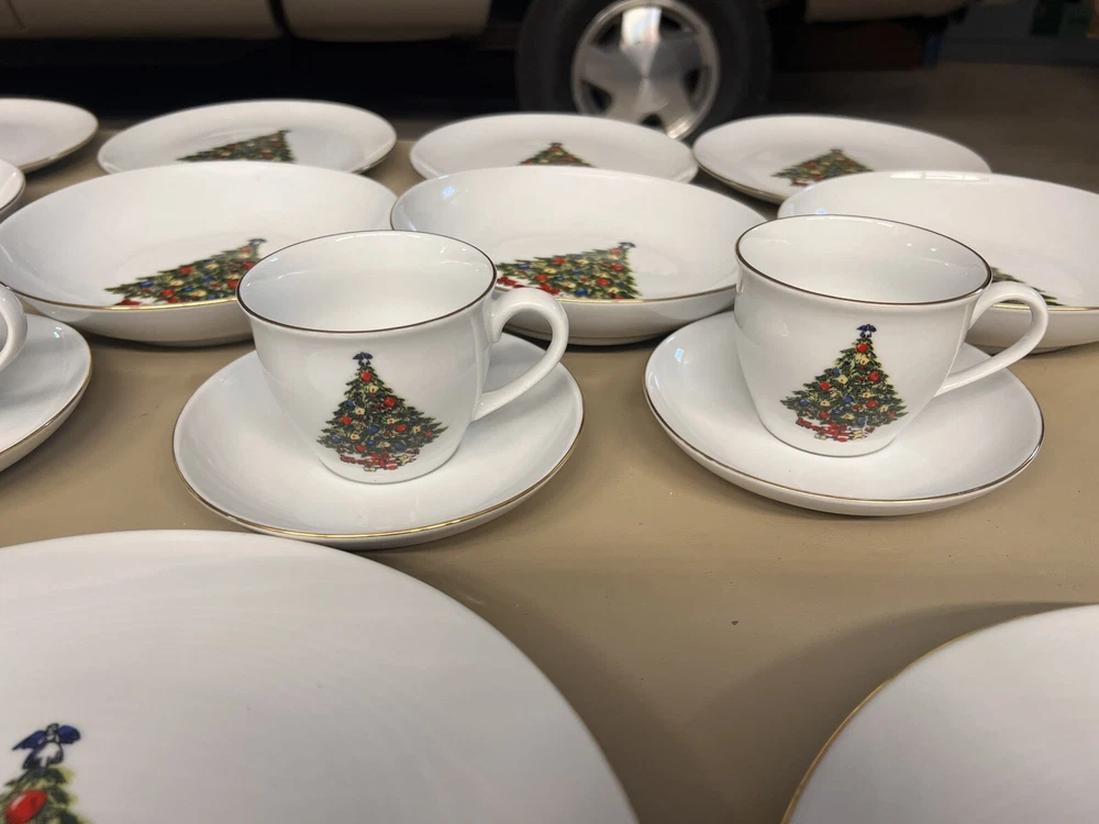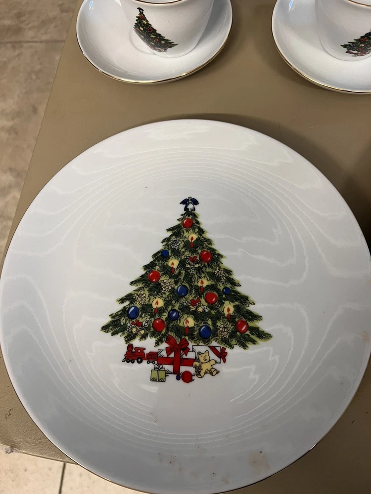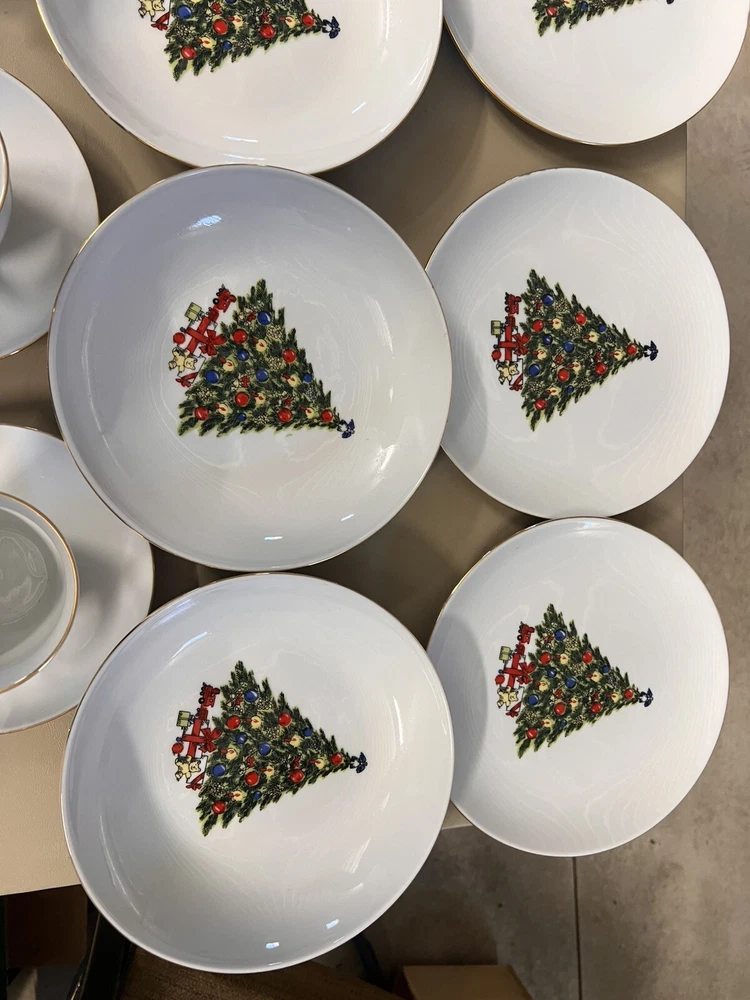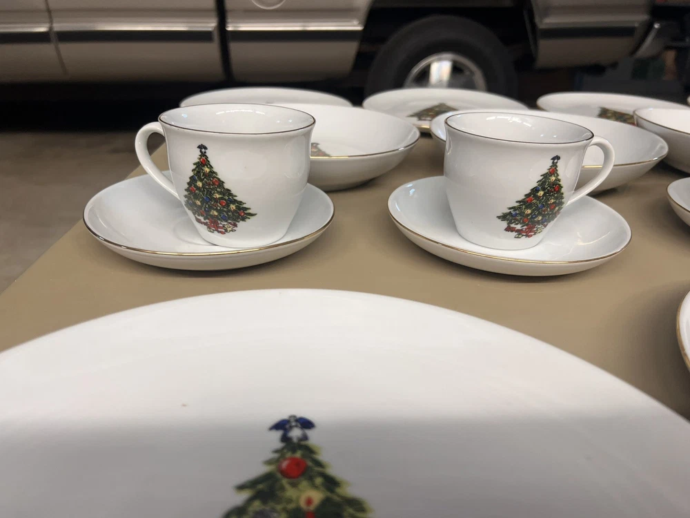 Celebrate the holiday season with this limited edition Jamestown China Christmas Treasure service for 4. The set includes a sauce plate, salad plate, bowl, dinner plate, and cup, all featuring a festive Christmas tree pattern in white porcelain. The round shape and glossy finish of each piece make them stackable and decorative. This vintage set is an original and licensed reproduction from China, with a printed backstamp. Hand wash only and perfect for any Christmas occasion, these plates are a retro addition to your dinnerware collection. Get ready to impress your guests with this elegant and unique Christmas Treasure set from Jamestown China. Missing one plate.