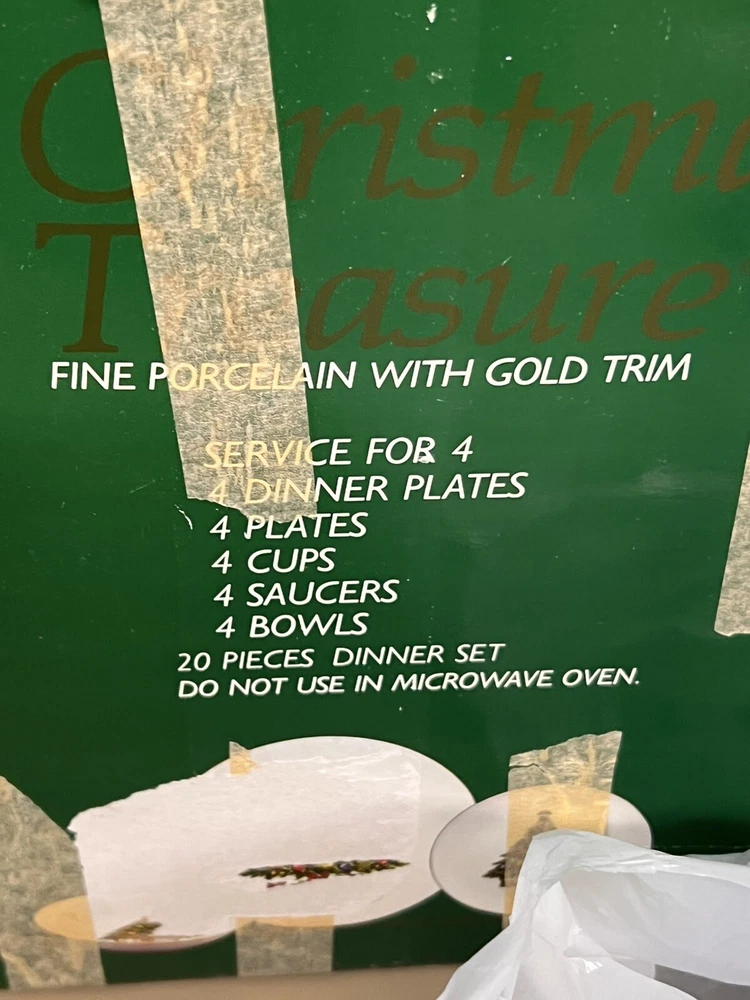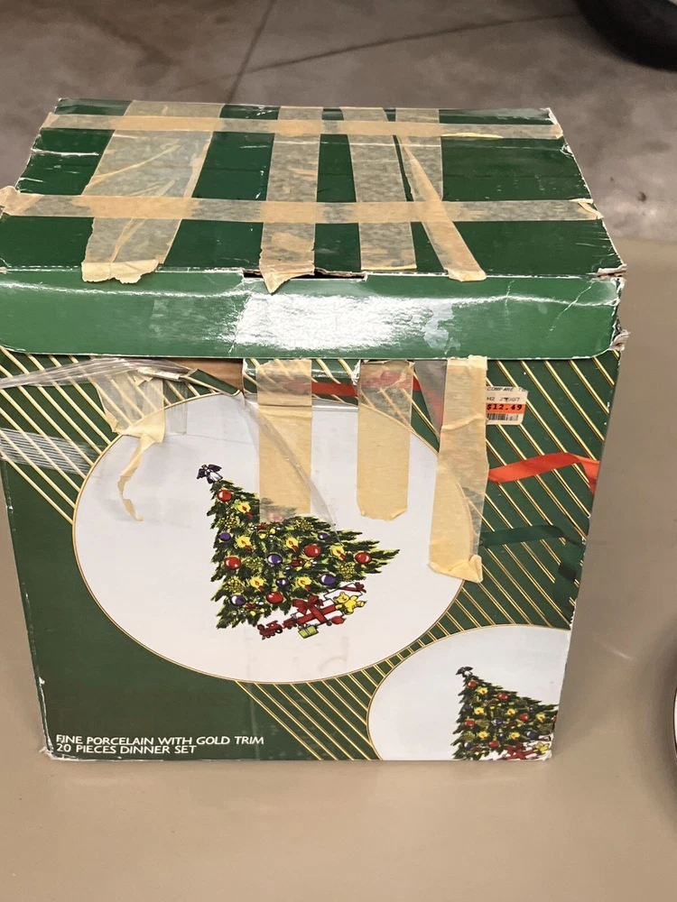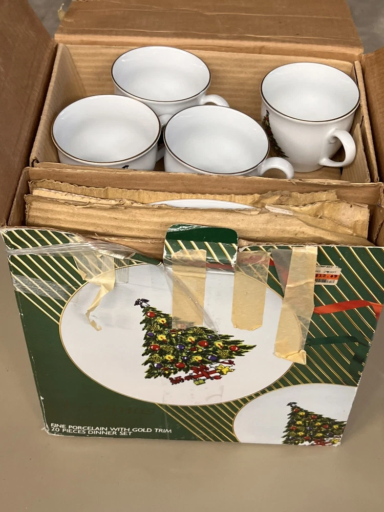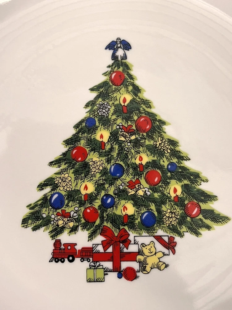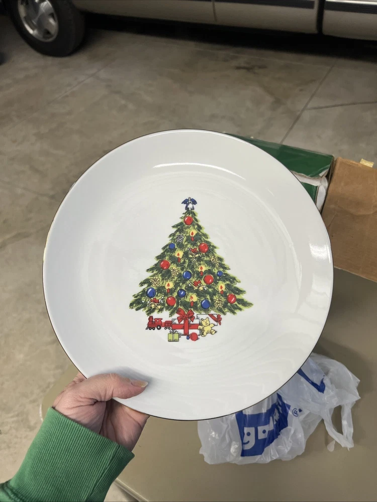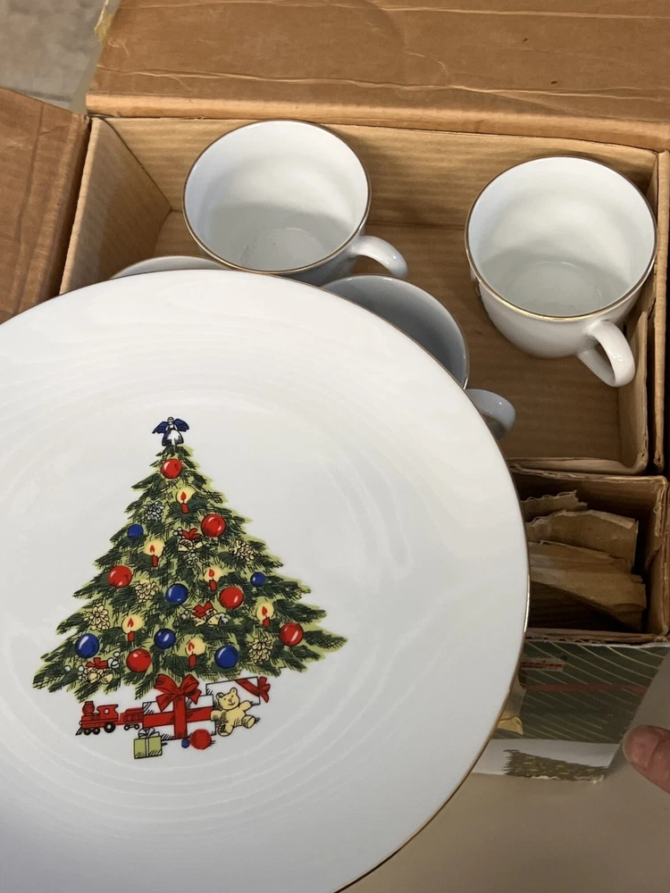 Celebrate the holiday season with this limited edition Jamestown China Christmas Treasure service for 4. The set includes a sauce plate, salad plate, bowl, dinner plate, and cup, all featuring a festive Christmas tree pattern in white porcelain. The round shape and glossy finish of each piece make them stackable and decorative. This vintage set is an original and licensed reproduction from China, with a printed backstamp. Hand wash only and perfect for any Christmas occasion, these plates are a retro addition to your dinnerware collection. Get ready to impress your guests with this elegant and unique Christmas Treasure set from Jamestown China. Missing one plate.