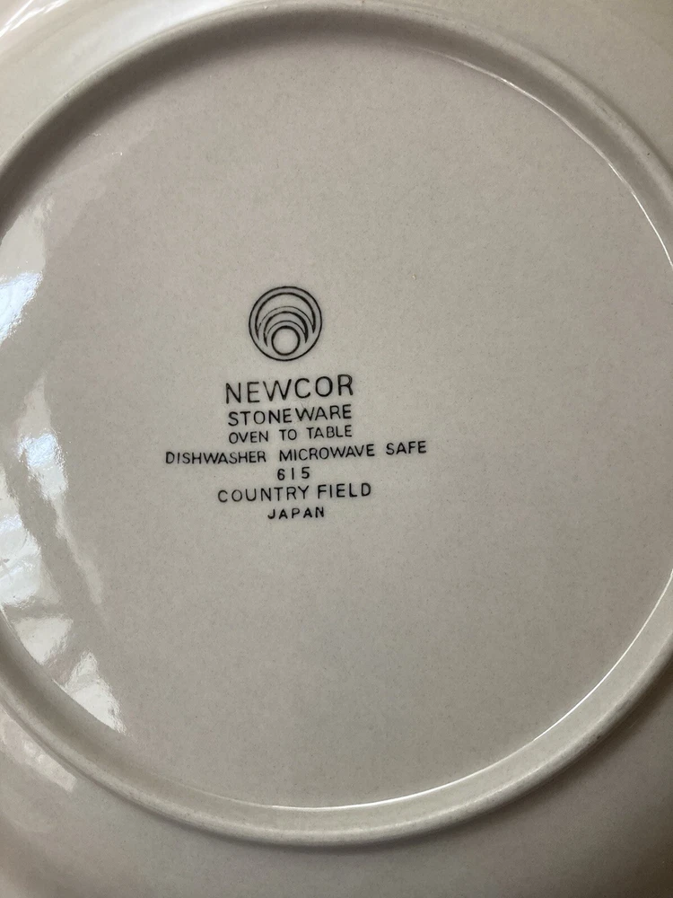 Set of two lovely Newcor Stonrware dinner plates, in Country Field pattern. Beige background with royal blue flowers and brown accents. Measures 10.5” wide. In excellent condition, no chips or cracks. Some very minor surface scuffing from what appears to be cutting with a dinner knife. Not even visible in photographs but I thought I should mention it!