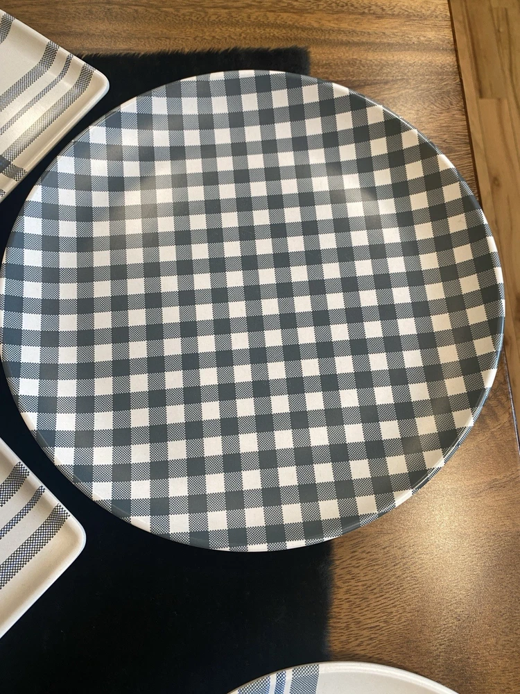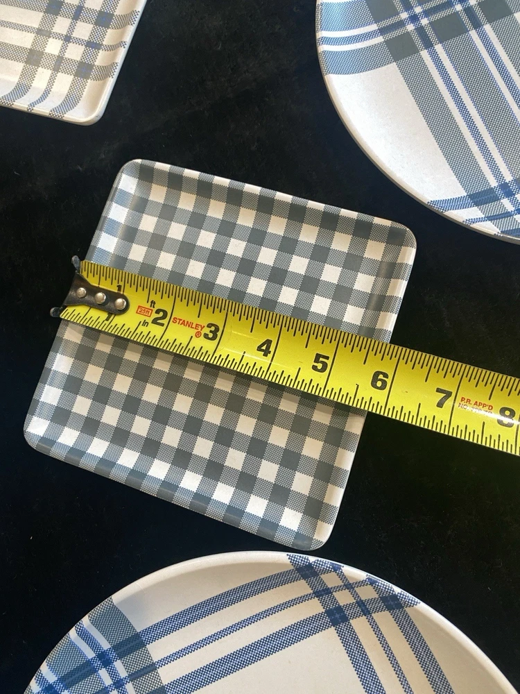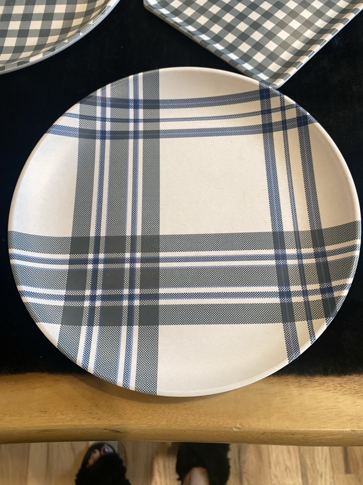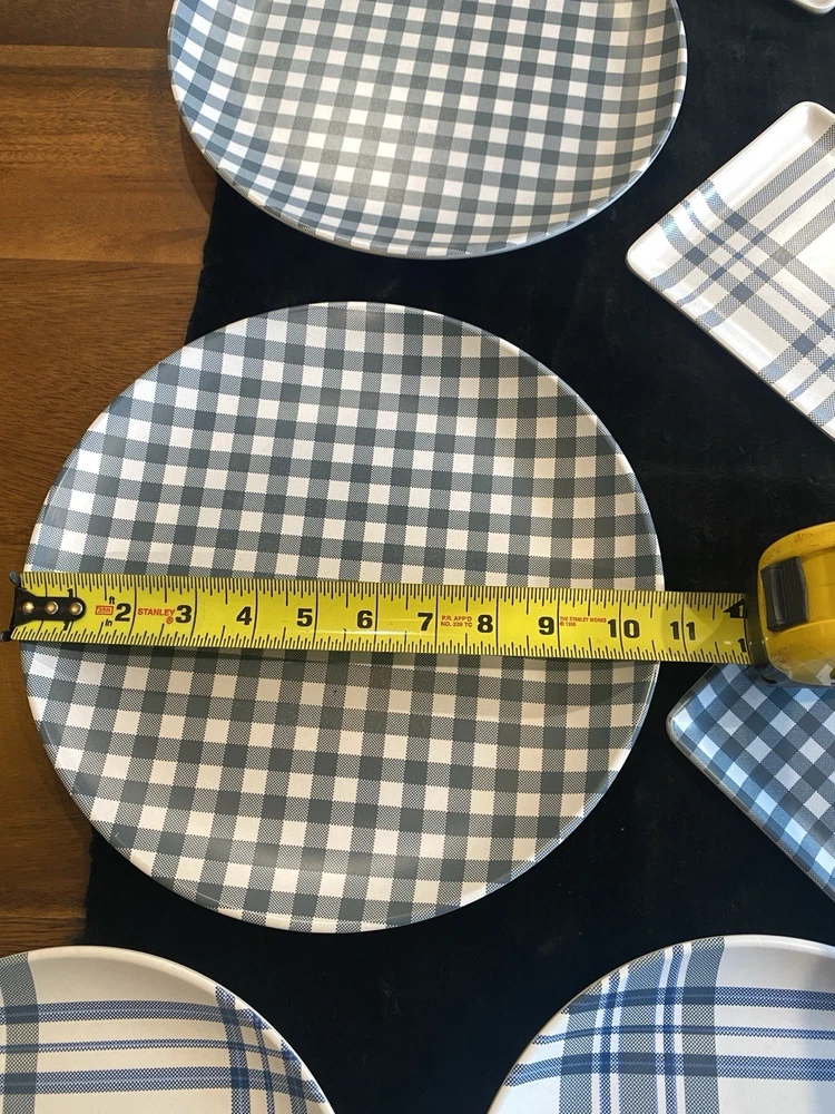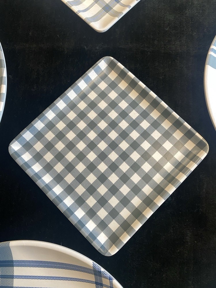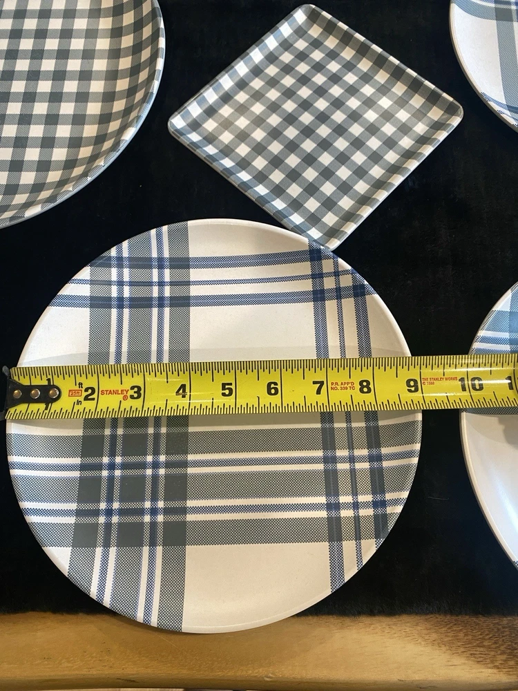 Pattern:Plaid & Tartan, CheckedColor:Gray, WhiteMaterial:MelaminePlate Diameter:10 in, 6 inFinish:MatteDepartment:AdultsNumber of Compartments:1Shape:Round, SquareType:Dinner Plate, Salad PlateBrand:Tommy BahamaNumber of Items in Set:Eight-Piece