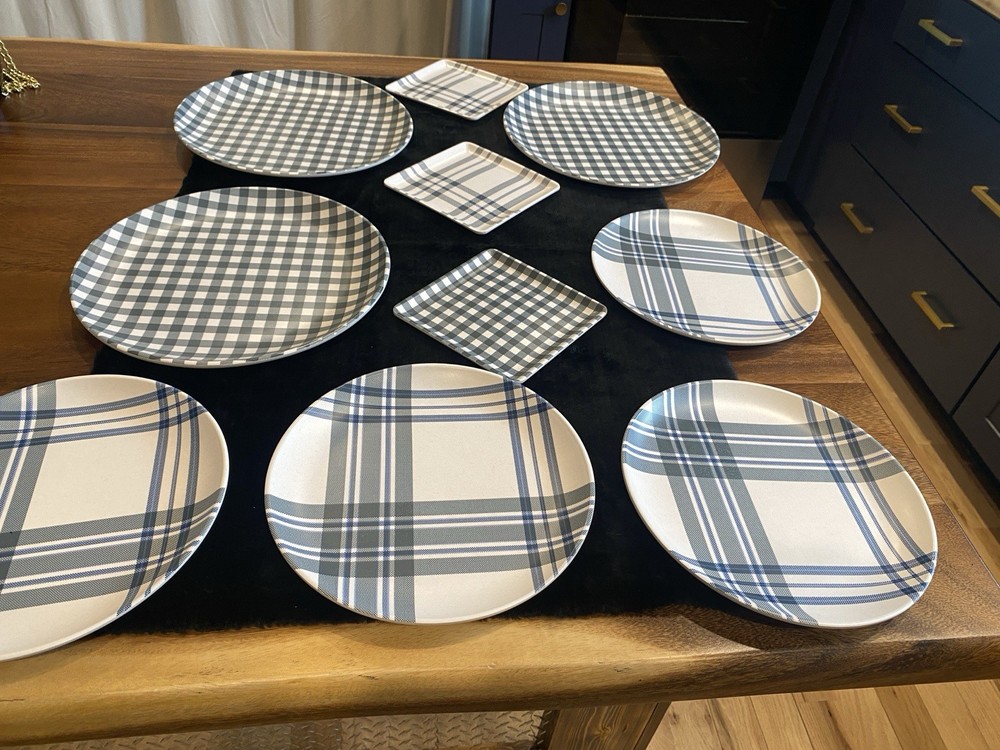 Set of 10 Blue White Melamine Plaid & Checked Plates Round 10" Square 6"