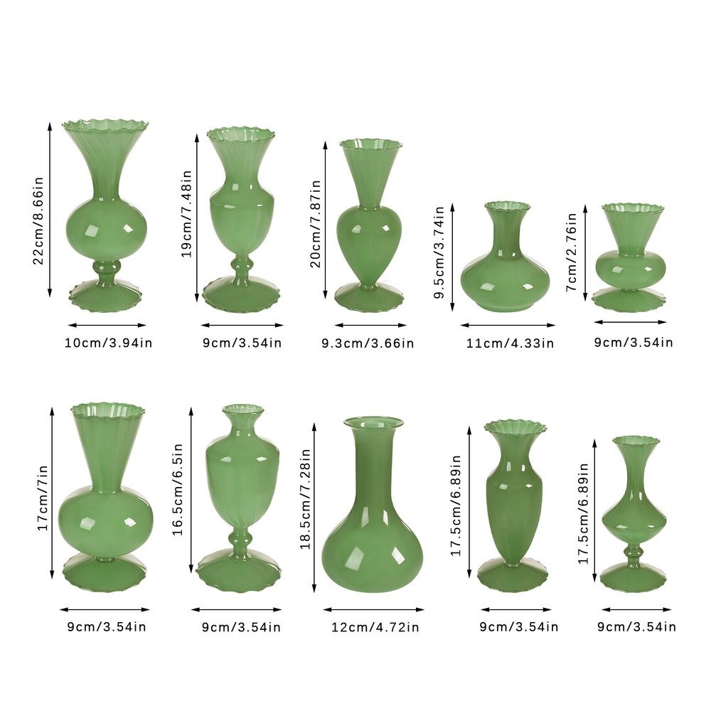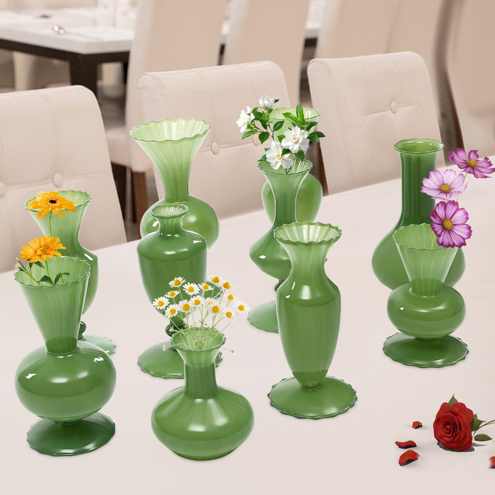 Set of 10 Mini Vases for Flowers - Ten Piece Small Glass Bud Vases - Green Description Weddings, graduations, birthdays, etc. are all memorable events in our lives that will become our precious treasures. With this glass vases set, your wedding and other important events will be even more wonderful. Our vases are made of premium glass, so they can be used for a long time and accompany you through various stages. 10 different styles in sufficient quantity to meet your home decorating needs, adding a touch of elegance and beauty to your home. Key Features Build to Last: High-quality glass makes the product durable and solid, so it remains beautiful and practical for a longer time. Strong Stability: The solid material, reasonable structure, and stable base provide this item with a strong bearing capacity, so you can use it safely without worrying about the fracture. Diverse Styles: The 10 different shapes, sizes, and styles enrich your visual experience, create a personalized background, add brightness to a dull event, and become good home decoration. Wherever it is placed, it is a beautiful scenery. Nice Decorations: You can place this product at the top of the booth as an excellent decoration for special days, creating an elegant atmosphere, especially for weddings. You can also put it on the table to relax your mood. Even if it hasn’t artificial flowers on it, it is still a very elegant decoration! High Cost-effective: 10 Pcs allow you to use different items, such as flowers, artificial flowers, and vines, on other occasions to decorate them freely and repeatedly, promoting the unity of style and fully meeting your needs. Labor-saving Cleaning: The smooth surface and simple structure make it convenient for you to clean with a wet towel and water. Easy to Carry and Store: Its small size and lightweight( 4.41 lbs ) make it easy for you to store and carry them anywhere. Ideal Gift: With an attractive appearance, this product is used as a gift for family, friends, and lovers to make their home more atmospheric and festivals more meaningful. Protective Package: To prevent the product from being damaged and bumped during transportation, we packed it with foam and cartons to protect your products to the maximum extent possible. Details Round Corners: Compared with traditional square corners, an arc design can better care for your skin. Flared Mouth: The flared mouth of the vase is not only aesthetically pleasing but also makes it easier for you to insert flowers, artificial flowers, and other decorations. Application Match with artificial flowers and other items, this product can be used in homes, restaurants, terraces, coffee shops, hotels, balconies, bars, clubs, Spa, candlelight dinners, holiday dinners, weddings, the background decoration of the studio, as well as any other special activities you would like to decorate. Specification Color: Green Style: Modern Material: Glass Assembly Required: No Mount Type: Free Standing Number of Items: 10 Product Size(D*H): 11*9.5cm/4.33*3.74in, 9*17cm/3.54*6.69in, 9*16.5cm/3.54*6.5in, 9*17.5cm/3.54*6.89in, 9*17.5cm/3.54*6.89in, 9*7cm/3.54*2.76in, 12*18.5cm/4.72*7.28in, 9*19cm/3.54*7.48in, 9.3*20cm/3.66*7.87in, 10*22cm/3.94*8.66in Net Weight: 2kg/4.41lbs Gross Weight: 2.3kg/5.07lbs Package Size: 55*45*15.5cm/21.65*17.72*6.1in Package Included 10* Glass Vases Notes Please note that flowers and other decorations are not included. Please use a soft cloth to clean and dry it. Please do not use harsh chemicals or abrasives. It is better to add some rocks or floral foam to the inside to make the item more stable. For better results, we recommend using a small bouquet. Please pay attention to the size details, it may be smaller than you expect. Please check the size of our vases before purchasing a bouquet to prevent buying a larger or smaller bouquet. Please allow the slight color difference caused by the shooting light and 1-3 cm error due to manual measurement, and make sure you do not mind before ordering. Payment Delivery details Terms of sales About us Contact us Payment We accept ebay payment 。 Fees such as import duties, taxes are not included in the item price or shipping costs. These charges are the buyer's responsibility. Delivery details Shipping: 2-9 working days to: USA Terms of sales We maintain high standards of excellence and strive for hundred percent customer satisfaction. Feedback is very important to us. We hope that you contact us immediately before you give neutral or negative feedback, so that we can address your concerns. It is impossible to address issues if we do not know about them! About us Your satis faction is our ultimate goal. We work hard to earn your trust and future business. Our certified technicians have tested each item before shipping. The unit comes with 1 year limited warranty on all manufacturing defects. a) If you receive a defective item, you may return it or ask for a discount. Please contact us within 14 days after you receive the package. b) What you returned must be intact and in its original packaging as re? u. Customer is responsible for shipping costs of the returned item. c) We will cover the cost of shipping back t with the shipping rate indicated in the registration page. We will send you a new unit or refund the full payment you paid. Thank you. Contact us Business Hour Business Hour: Monday To Friday: 8:30 AM to 5:00 PM (Beijing China time) Due to time zones, our reply to your questions may not be immediately. But within above working time, we will reply your email within 24 hours. If it's non-workdays, please kindly be patient and wait till Monday. Please contact us with ebay message. Please feel free to contact us if you have any questions. Monday To Friday: 8:30 AM to 5:00 PM (Beijing China time) Due to time zones, our reply to your questions may not be immediately. But within above working time, we will reply your email within 24 hours. If it's non-workdays, please kindly be patient and wait till