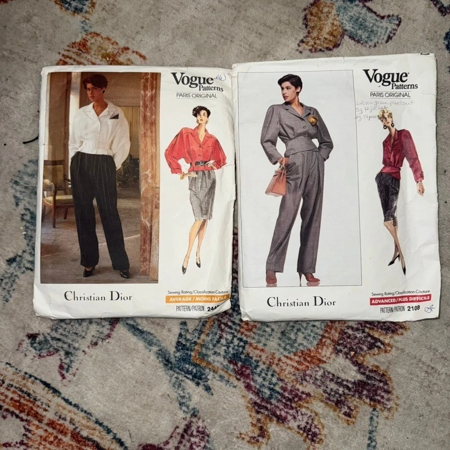 Vogue Paris Original Christian Dior 2108 sewing pattern for misses' jacket pants and skirt. This pattern includes options for a lined, above hip jacket with notched collar, dropped shoulders, full length sleeves with button cuffs and welt front pockets. Button front and back button pleats. Loose fitting, above knee or mid-knee skirt with side pockets and front pleats. Straight legged cuffed pants with fly zipper. This pattern is rated advanced plus. Age Group: Adult Type: Suit, Patterned Paper Gender: Female Compatible Size: 14 (Women's Size), 12 (Women's Size), 16 (Women's Size) Decade: 1980s Cut/Uncut: Uncut Unit Type: Unit Keywords: vintage sewing, designer pattern, couture sewing, tailored jacket, wide leg pants, pencil skirt, 1980s fashion, retro style, DIY clothing, custom made, fashion design, Parisian chic, sew your own Item is preowned, effort has been made to ensure all flaws are displayed photos serve as additional description Sizing varies by manufacturer and time period, please see measurements.