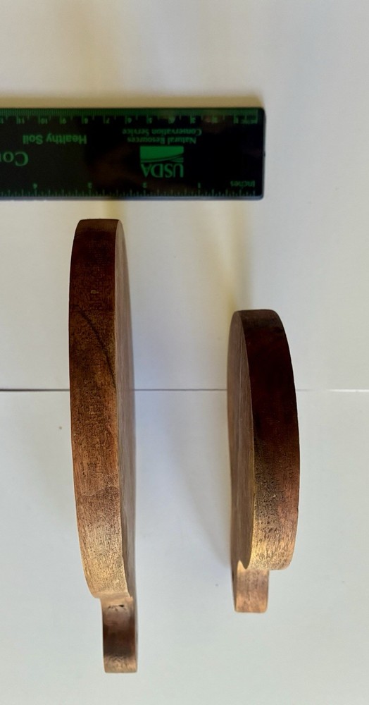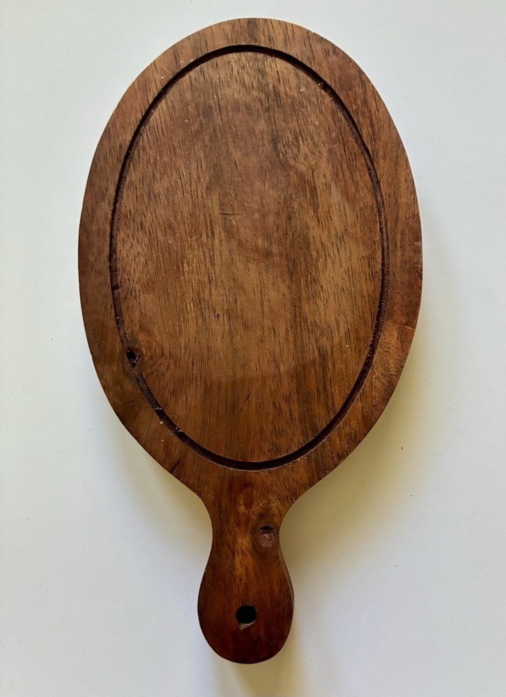 Set of 2 Acacia Wood Serving Boards – Rustic Style Nice set of two solid wood serving boards, likely acacia, with natural grain variation and warm tones. Great for serving cheese, charcuterie, snacks, or small appetizers. Can be used as coasters too. Details: • Set includes 2 boards (as shown) • Solid wood (not bamboo or composite) • Natural variation in grain and color • Handles with hanging holes Condition: • Pre-owned with visible signs of use • Some surface wear, marks, and dry areas from normal use • No cracks or structural damage • Could benefit from light sanding and oiling to restore finish Notes: • Rustic look – perfect for casual entertaining • Compact size – ideal for individual servings or small displays • See photos for exact condition and appearance Ships carefully packaged.