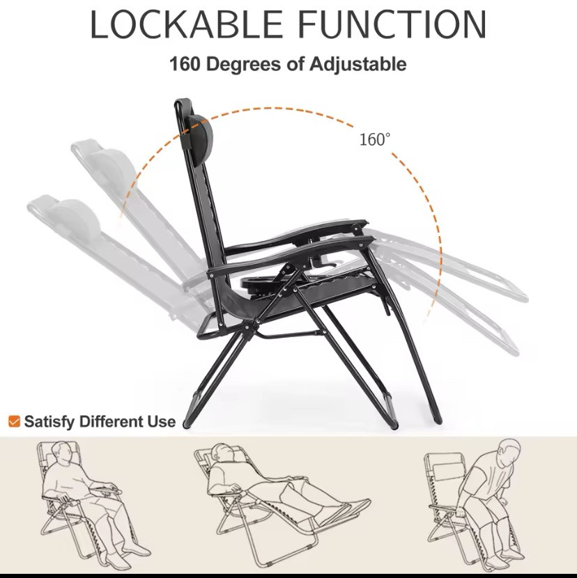 Brand: Does not apply Finish Type: Mesh Back Style: Solid Back Shape: Rectangular Surface Recommendation: Hard Floor Frame Material Alloy Steel: Seat Material Type Textilene Fabric Item Height: 33 in Item Length: 24 in Arm Style: Rounded Features: Adjustable Is Customizable: No Item Weight: 32.6 pounds Indoor/Outdoor Usage: Outdoor Is Foldable: Yes Material: Steel Included Components: Cup Holder Size: Set of 2 Product Dimensions: 61"D x 25"W x 44"H Special Feature: Portable Tilting: No Seat Height: 17 Inches Seat Depth: 21 inches Type: Does not apply Item model number: SKY904 Pattern: Solid Recommended Uses For Product: Relaxing Item Width: 34 in Unit Count: 2.0 Count gtin13: 313113189129 Cushion Style: Boxed Edge Style: Modern Maximum Weight Recommendation: 250 Pounds Model Name: Zero gravity lounge chair Global Trade Identification Number: 00813373014648 Color: Black Country of Origin: China Form Factor: Adjustable Bed Material Alloy Steel: Item Weight 32.6 Pounds Is Discontinued By Manufacturer: No Age Range (Description): Adult Room Type: Patio Garden Furniture base movement: Glide UPC: 313113189129