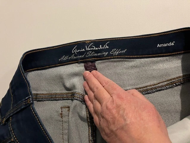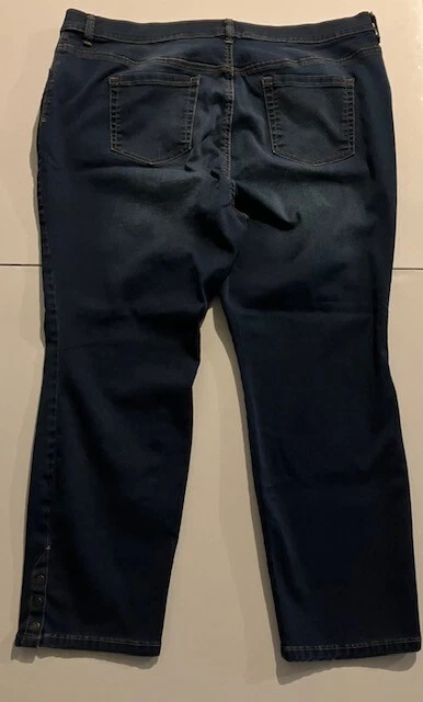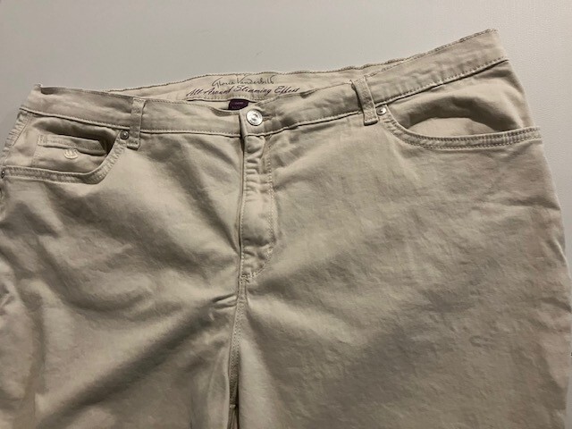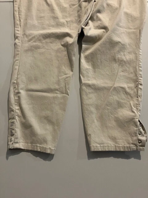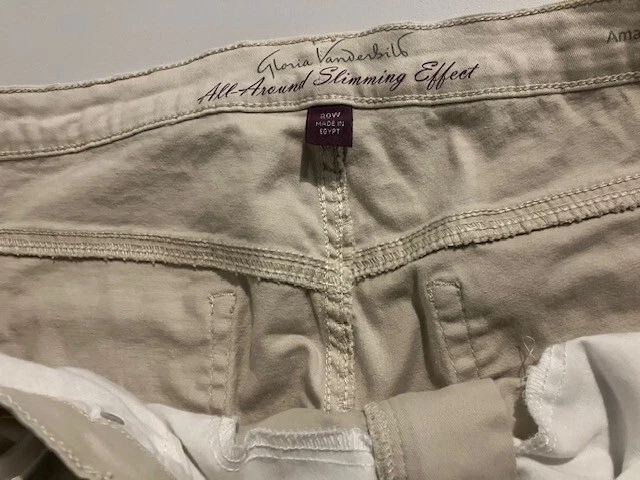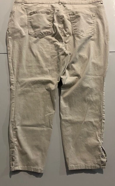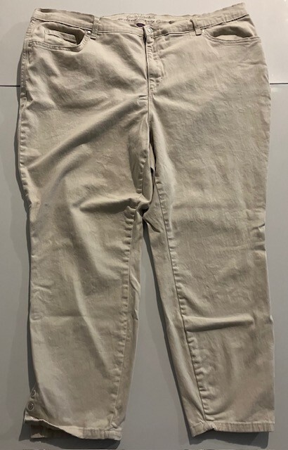 Set of 2 Amanda Vanderbilt Plus Size Women's Stretch Pants Size 20W- Blue- Cream- All Around Slimming Effect. Includes two pairs of plus size stretch pants with regular fit and tapered legs at ankle length. Both are size 20W. Cream pair is made with 98% cotton and 2% elastane. Blue pair is made with 76% cotton, 22% polyester, and 2% elastane. Pants are soft with a brushed fabric. Pants are stretchy with the blue pair like stretchy denim. Pants have button and zipper closure with three front pockets (one small) and two back pockets. Pants have 3 snap ankle closures. Measures 25" inseam and waist is 43". Pants show minimal wear. In good condition for age and use. No rips or tears. No stains. See Photos.