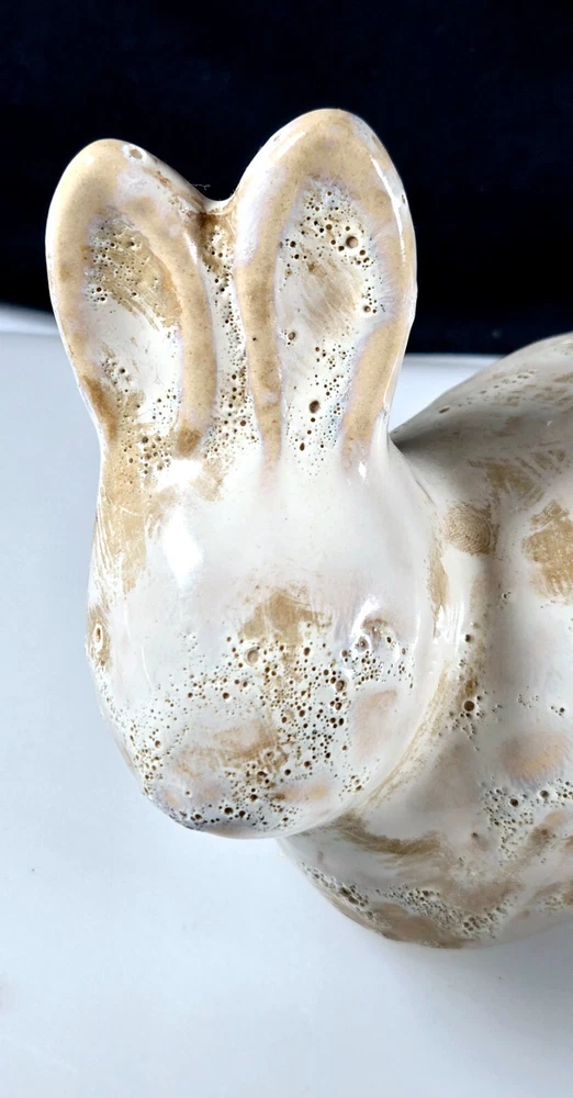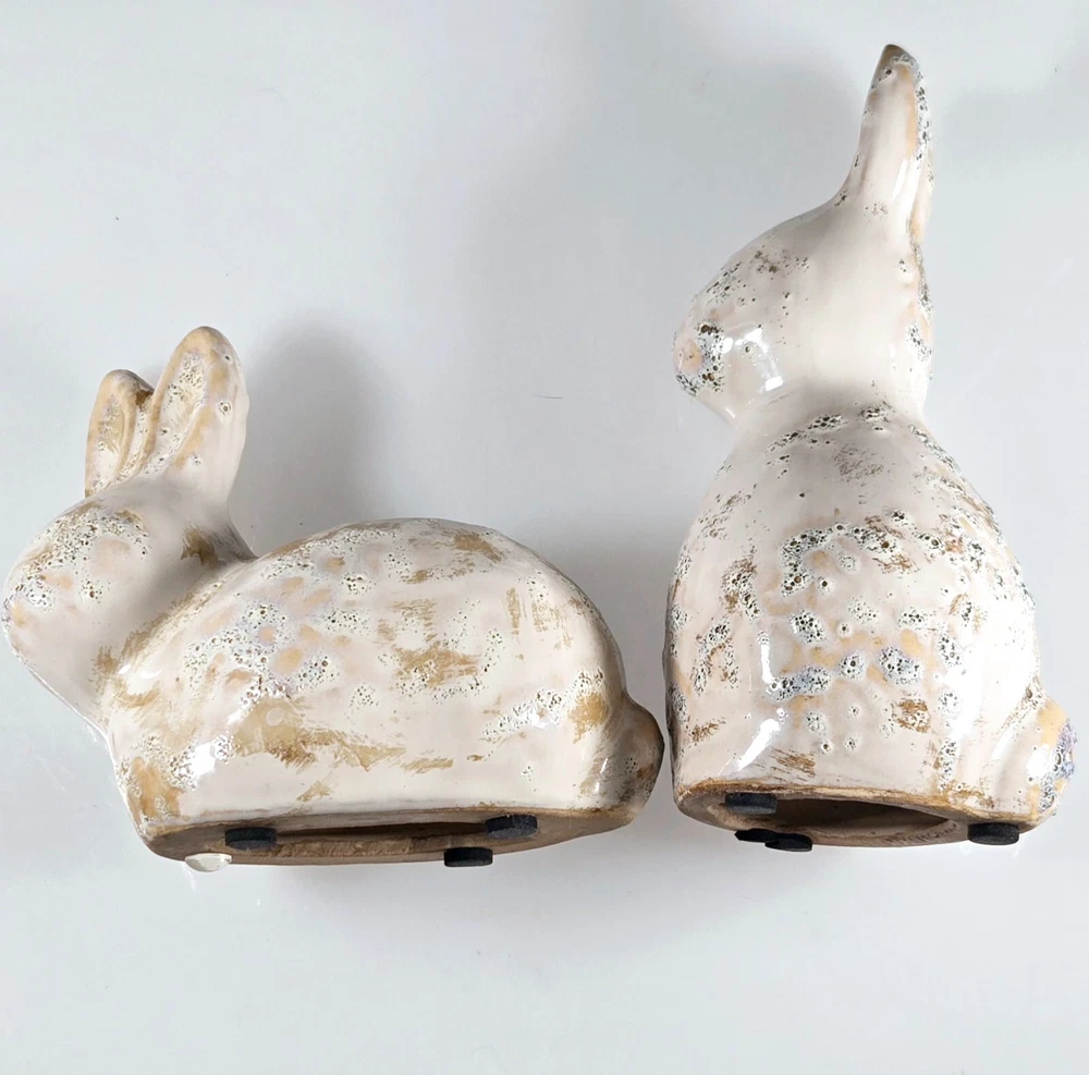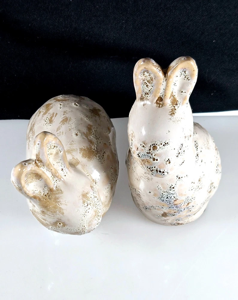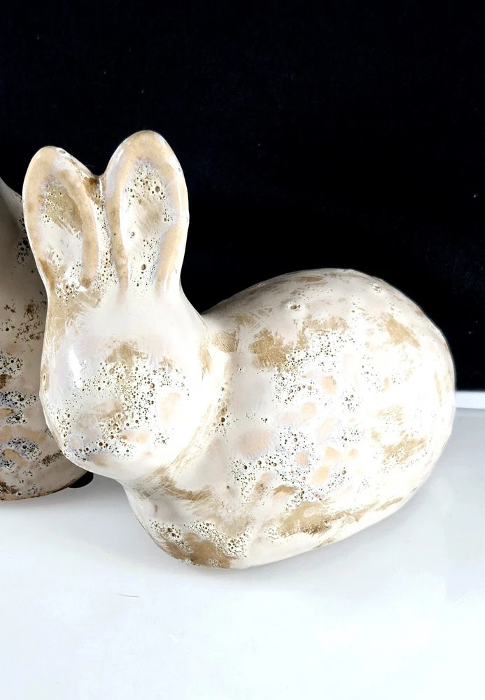 This set features two rustic ceramic bunnies, with one measuring 7.25 inches in height and the other 5.5 inches. The figurines are unmarked and have a beige glazed finish, adding a charming touch to any decor. Crafted from ceramic in an art pottery style, these bunnies showcase a handmade aesthetic, perfect for those who appreciate artisanal pieces. The rabbits are a delightful addition to any space, exuding a quaint and whimsical vibe with their charming design. J011