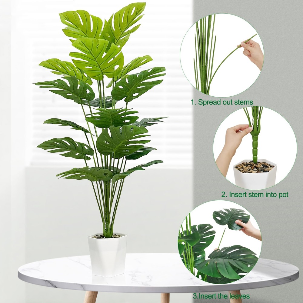 Packaging and Size: The package comes in set of 2 artificial monstera plants, including 2 white plastic pots with cobblestones, 2 stems of plants and 2 set of greenery leaves. Each of artificial monstera plants measures 43 inch long, 10 inch wide. Perfect Decoration: Lifelike artificial monstera deliciosa Tropical Plants make you feel the presence of nature, perfect for home, office, restaurant, store and wedding deco. Easy Assembly: There are 2 set of plants in the package and you need to DIY branches and leaves. Please look through instructions before assembly, it is easy to assemble. Moreover, plant stems are made of plastic and iron wire for adjusting shapes and keeping upright, you can adjust branches and leaves to the shape you love. Easy Maintenance: Contrast to a real plant, artificial plants need no maintenance, water, trim, sunlight, or fertilizer to nurture, making you feel nature at any time while saving your time. Besides, dust from long-term use can be washed with water, recovery as new. Premium Plastic:This artificial plants is made by premium plastic which helpful to create a vivid and realistic appearance. Modern white plastic pots is filled with solidified stones look very generous and real. Packaging and Size: The package comes in set of 2 artificial monstera plants, including 2 white plastic pots with cobblestones, 2 stems of plants and 2 set of greenery leaves. Each of artificial monstera plants measures 43 inch long, 10 inch wide. Perfect Decoration: Lifelike artificial monstera deliciosa Tropical Plants make you feel the presence of nature, perfect for home, office, restaurant, mall and wedding deco. Easy Assembly: There are 2 set of plants in the package and you need to DIY branches and leaves. Please look through instructions before assembly, it is easy to assemble. Moreover, plant stems are made of plastic and iron wire for adjusting shapes and keeping upright, you can adjust branches and leaves to the shape you love. Easy Maintenance: Contrast to a real plant, artificial plants need no maintenance, water, trim, sunlight, or fertilizer to nurture, making you feel nature at any time while saving your time. Besides, dust from long-term use can be washed with water, recovery as new. Premium Plastic:This artificial plants is made by premium plastic which helpful to create a vivid and realistic appearance. Modern white plastic pots is filled with solidified stones look very generous and real.