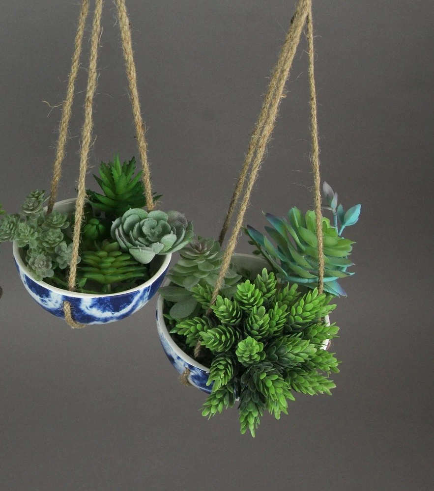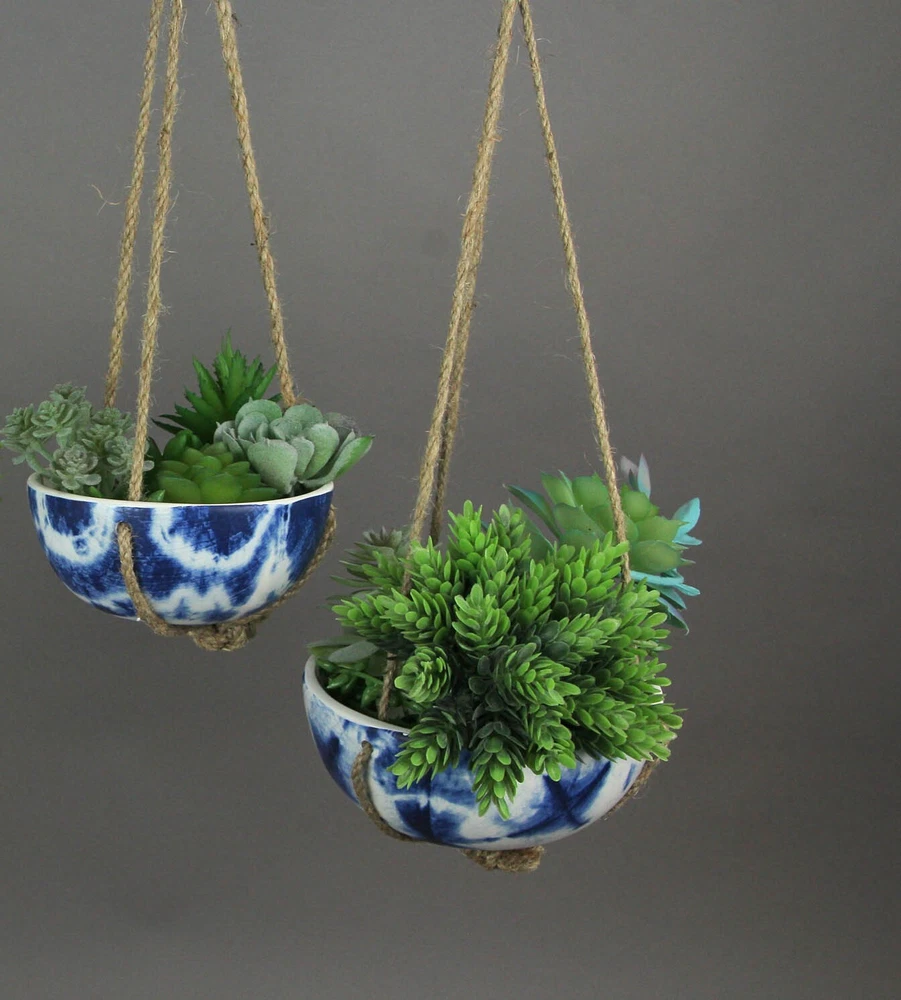 NOTE: DUE TO THIS IS A SET OF 2 this item is being sold at a reduced price. This set of white ceramic hanging mini planters features wonderful Japanese shibori-inspired patterns. Unlike tie-dye, shibori utilizes wooden blocks to create wonderful geometric patterns. These beautiful planters have stunning deep blue shibori-style designs to add a burst of color to your room, and have natural jute rope hangers for easy mounting to ceiling hooks or shepherd's hooks. The bigger one is 3 inches high, 6 inches in diameter, with an 11. inch drop hanger, and the smallest is 2.75 inches high, 5 inches in diameter, with a 9.5 inch drop hanger. Our eBay Store About Us Add to Favorite Sellers Set of 2 Blue and White Shibori Style Dyed Ceramic Hanging Mini Planters NOTE: DUE TO THIS IS A SET OF 2 this item is being sold at a reduced price. NOTE - DUE TO THIS IS A SET OF 2 this item is being sold at a reduced price. DURABLE MATERIAL - Made of Ceramic With Natural Jute Rope Hangers For Years of Display UNIQUE FINISH - Different Deep Blue Shibori Inspired Patterns EASY TO HANG - From Shepherds Hooks, Garden Stakes and Trees OVERALL SIZE - Large - 3 Inches High, 6 Inches in Diameter. Small - 2.75 Inches High, 5 Inches in Diameter NOTE: DUE TO THIS IS A SET OF 2 this item is being sold at a reduced price. This set of white ceramic hanging mini planters features wonderful Japanese shibori-inspired patterns. Unlike tie-dye, shibori utilizes wooden blocks to create wonderful geometric patterns. These beautiful planters have stunning deep blue shibori-style designs to add a burst of color to your room, and have natural jute rope hangers for easy mounting to ceiling hooks or shepherd's hooks. The bigger one is 3 inches high, 6 inches in diameter, with an 11. inch drop hanger, and the smallest is 2.75 inches high, 5 inches in diameter, with a 9.5 inch drop hanger. Product Details Color Blue Height 3.5 Length 7 Weight 2.3 LB