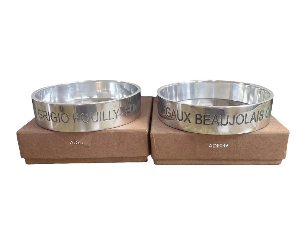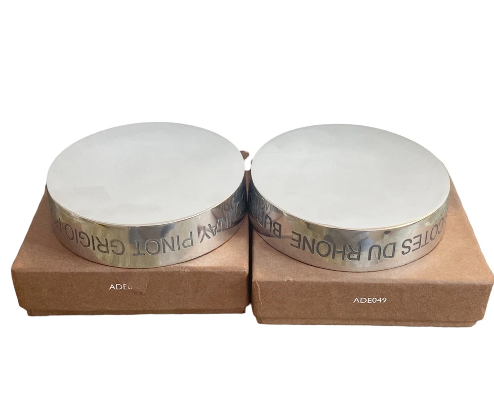 Set of 2 Bombay London Wine Coasters Etched Aluminium Boxed Red White Wine Measure approx 4" D X 1' H Set of 2 Cast Aluminum Coasters White Wine has etched Pinot Grigio, Pouilly Fume, Sanceree, Chablis, Chardonnay Red Wine has etched Burgandy, Bordeaux, Marguex, Beaujolais, Cotes du Rhone. Smoke free home Please visit my store at https://www.ebay.com/str/theuniqueredhead . Thank you for your consideration. Please message me if you have any questions. I do combined shipping on my items in the store.