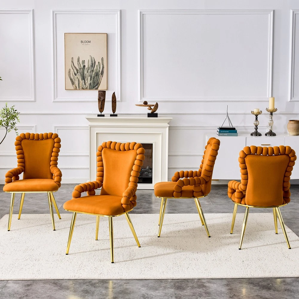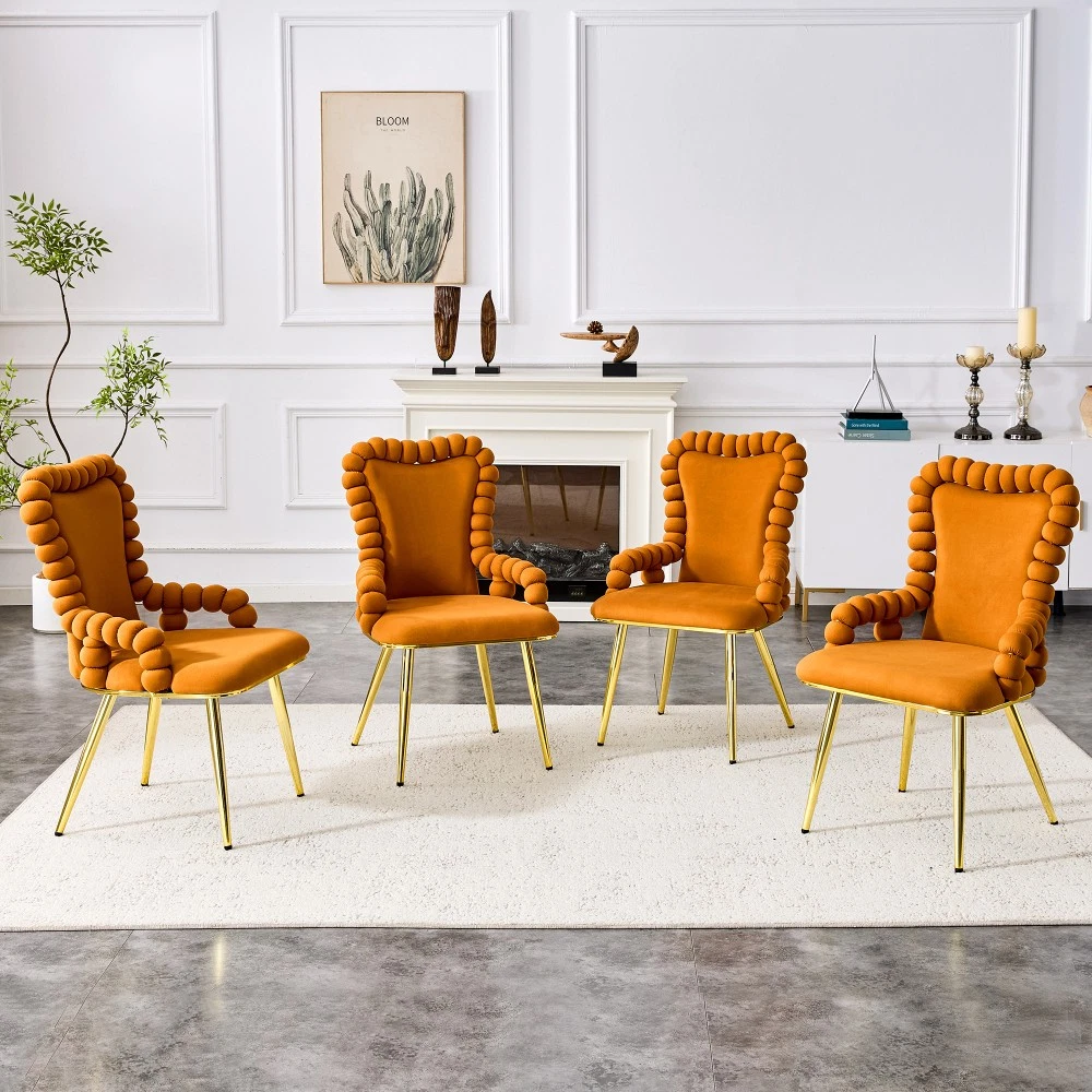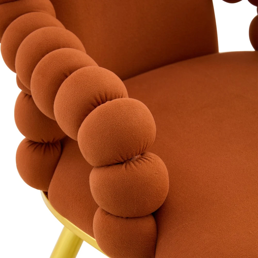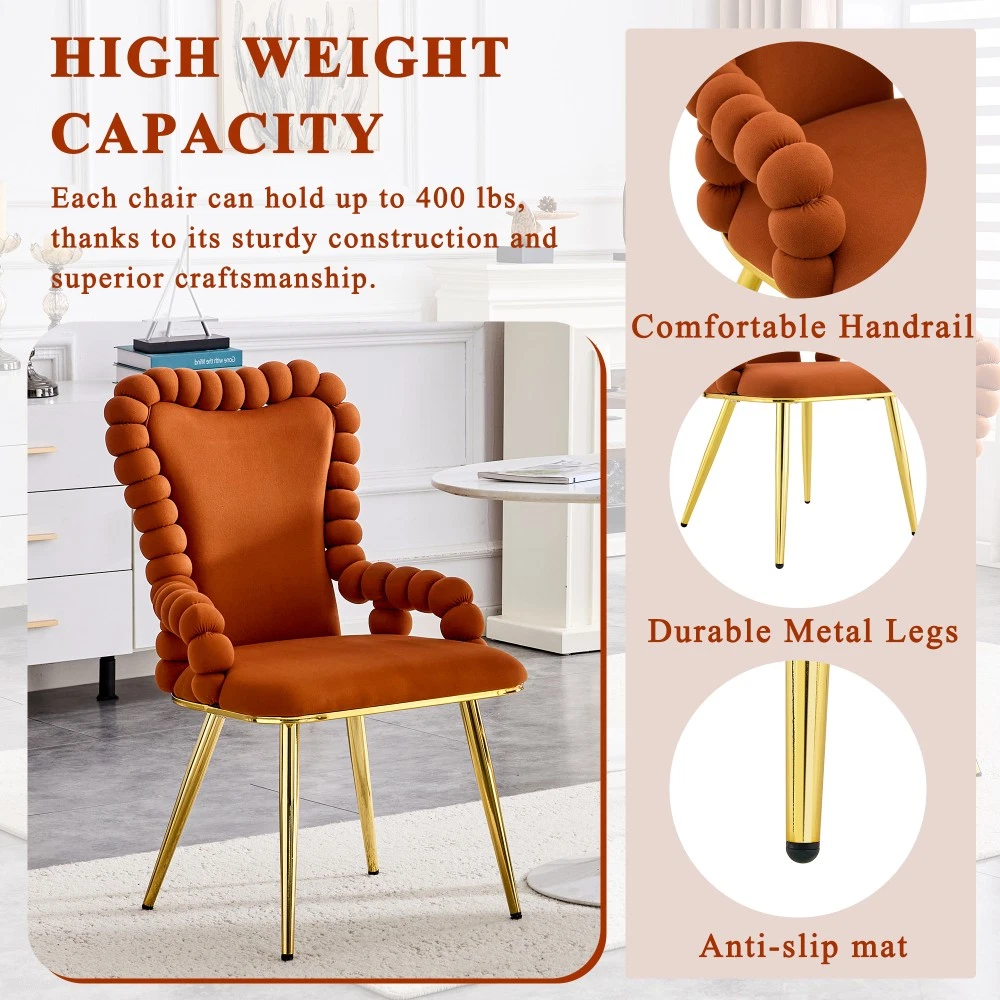 Set of 2 Brown Puffy Bubble Chain Dining Chairs, Velvet Upholstered with Gold Metal Legs & Armrests for Dining Room, Kitchen Elevate your dining space with a perfect blend of sculptural artistry and plush comfort—introducing this set of 2 bubble chain dining chairs! Crafted with luxurious brown Dutch velvet and sleek gold metal legs, these chairs aren’t just seating solutions; they’re eye-catching statement pieces that add warmth, glamour, and personality to your dining room or kitchen. Whether you’re hosting a dinner party, enjoying a family meal, or simply relaxing, they deliver unmatched style and all-day coziness. Unique Ball-Chain Bubble Design: A Sculptural Home Accent Inspired by high-end jewelry and contemporary art, these dining chairs feature a one-of-a-kind ball-link backrest. Made of plush round cushions that resemble a chain of delicate bubbles, the design turns ordinary dining seating into a conversation starter. The sculpted armrests further enhance the artistic appeal, making each chair a stunning focal point that transforms your space with modern sculptural charm. Premium Non-Directional Dutch Velvet Upholstery Upholstered in top-quality Dutch velvet, these chairs stand out from standard velvet seating. Unlike ordinary velvets, Dutch velvet has no shading effect or “nap,” boasting a soft, consistent texture that looks smooth and refined from every angle. The rich brown hue adds a touch of warmth to your space, while the plush fabric feels gentle against the skin and holds up well to daily use—perfect for busy dining areas. Luxurious Gold Metal Legs: Glamour Meets Stability The electroplated gold metal legs exude chic contemporary style, pairing beautifully with the soft brown velvet for a balanced mix of glamour and modern minimalism. Beyond aesthetics, the sturdy metal construction ensures reliable stability, supporting daily use for years to come. The polished gold finish showcases exceptional craftsmanship, instantly upgrading the ambiance of your dining room or kitchen with a high-end touch. Ergonomic Comfort for All-Meal Enjoyment Designed with comfort at the core, the gently curved bubble backrest hugs your body’s natural shape, providing optimal lumbar support during extended meals. The seat is padded with thick foam, delivering plush, cloud-like comfort that keeps you cozy even during long dining sessions. The ergonomic high back and velvet cushioning work together to reduce strain, making these chairs ideal for both dining and casual relaxation. Versatile Style for Multiple Spaces This set of 2 dining chairs is perfect for instantly upgrading your dining area’s aesthetic, but their versatility doesn’t stop there. They also work beautifully as accent chairs in your living room or extra seating in the kitchen, blending seamlessly with various interior decor styles—from modern and contemporary to eclectic and luxurious. A perfect combination of style, comfort, and functionality for any home space. Product Specifications Material: Metal (Legs), Velvet (Upholstery) Color: Brown (Upholstery), Gold (Legs) Seating Capacity: Set of 2 Features: Armrests, Ergonomic High Back, Thick Foam Padding Assembled Dimensions: 22.00" (Length) x 19.00" (Width) x 37.00" (Height) Product Weight: 34.67 lbs Packaging Details Package Dimensions: 27.95" (Length) x 22.05" (Width) x 21.65" (Height) Package Weight: 39.82 lbs Included in Package: 2 x Brown Velvet Bubble Chain Dining Chairs with Gold Metal Legs Shop With Confidence We stand behind the quality and craftsmanship of these bubble chain dining chairs! Enjoy a 1-Year Warranty for peace of mind against manufacturing defects, plus a 30-Day Free Return & Exchange Policy. If you’re not completely satisfied with your purchase, we offer a hassle-free return or exchange process—no hidden fees, just total satisfaction guaranteed.