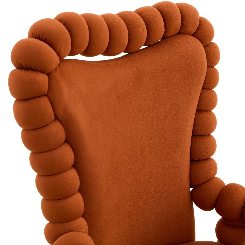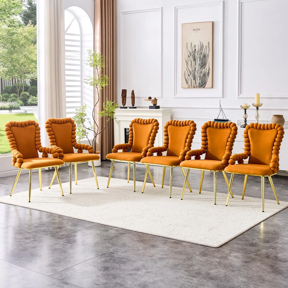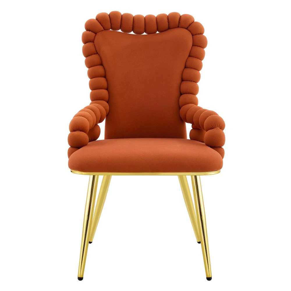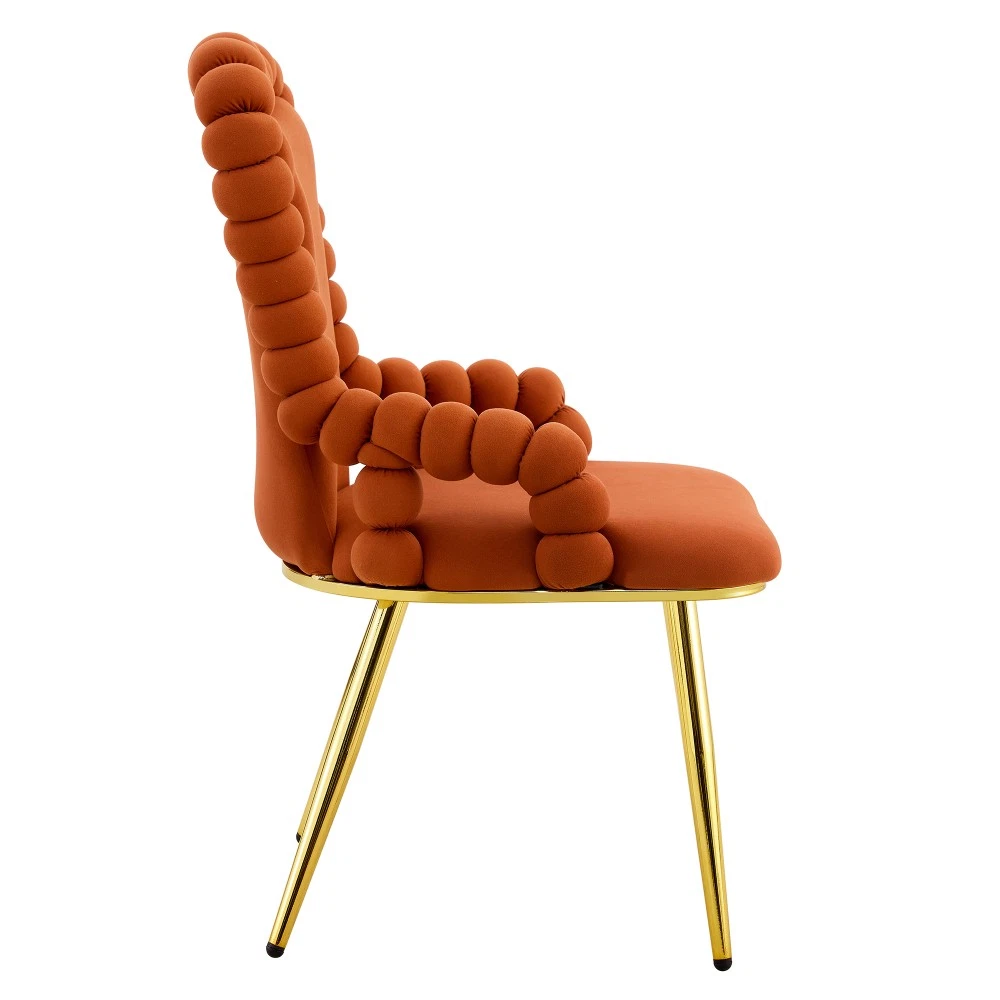 Set of 2 Brown Puffy Bubble Chain Dining Chairs, Velvet Upholstered with Gold Metal Legs & Armrests for Dining Room, Kitchen Elevate your dining space with a perfect blend of sculptural artistry and plush comfort—introducing this set of 2 bubble chain dining chairs! Crafted with luxurious brown Dutch velvet and sleek gold metal legs, these chairs aren’t just seating solutions; they’re eye-catching statement pieces that add warmth, glamour, and personality to your dining room or kitchen. Whether you’re hosting a dinner party, enjoying a family meal, or simply relaxing, they deliver unmatched style and all-day coziness. Unique Ball-Chain Bubble Design: A Sculptural Home Accent Inspired by high-end jewelry and contemporary art, these dining chairs feature a one-of-a-kind ball-link backrest. Made of plush round cushions that resemble a chain of delicate bubbles, the design turns ordinary dining seating into a conversation starter. The sculpted armrests further enhance the artistic appeal, making each chair a stunning focal point that transforms your space with modern sculptural charm. Premium Non-Directional Dutch Velvet Upholstery Upholstered in top-quality Dutch velvet, these chairs stand out from standard velvet seating. Unlike ordinary velvets, Dutch velvet has no shading effect or “nap,” boasting a soft, consistent texture that looks smooth and refined from every angle. The rich brown hue adds a touch of warmth to your space, while the plush fabric feels gentle against the skin and holds up well to daily use—perfect for busy dining areas. Luxurious Gold Metal Legs: Glamour Meets Stability The electroplated gold metal legs exude chic contemporary style, pairing beautifully with the soft brown velvet for a balanced mix of glamour and modern minimalism. Beyond aesthetics, the sturdy metal construction ensures reliable stability, supporting daily use for years to come. The polished gold finish showcases exceptional craftsmanship, instantly upgrading the ambiance of your dining room or kitchen with a high-end touch. Ergonomic Comfort for All-Meal Enjoyment Designed with comfort at the core, the gently curved bubble backrest hugs your body’s natural shape, providing optimal lumbar support during extended meals. The seat is padded with thick foam, delivering plush, cloud-like comfort that keeps you cozy even during long dining sessions. The ergonomic high back and velvet cushioning work together to reduce strain, making these chairs ideal for both dining and casual relaxation. Versatile Style for Multiple Spaces This set of 2 dining chairs is perfect for instantly upgrading your dining area’s aesthetic, but their versatility doesn’t stop there. They also work beautifully as accent chairs in your living room or extra seating in the kitchen, blending seamlessly with various interior decor styles—from modern and contemporary to eclectic and luxurious. A perfect combination of style, comfort, and functionality for any home space. Product Specifications Material: Metal (Legs), Velvet (Upholstery) Color: Brown (Upholstery), Gold (Legs) Seating Capacity: Set of 2 Features: Armrests, Ergonomic High Back, Thick Foam Padding Assembled Dimensions: 22.00" (Length) x 19.00" (Width) x 37.00" (Height) Product Weight: 34.67 lbs Packaging Details Package Dimensions: 27.95" (Length) x 22.05" (Width) x 21.65" (Height) Package Weight: 39.82 lbs Included in Package: 2 x Brown Velvet Bubble Chain Dining Chairs with Gold Metal Legs Shop With Confidence We stand behind the quality and craftsmanship of these bubble chain dining chairs! Enjoy a 1-Year Warranty for peace of mind against manufacturing defects, plus a 30-Day Free Return & Exchange Policy. If you’re not completely satisfied with your purchase, we offer a hassle-free return or exchange process—no hidden fees, just total satisfaction guaranteed.