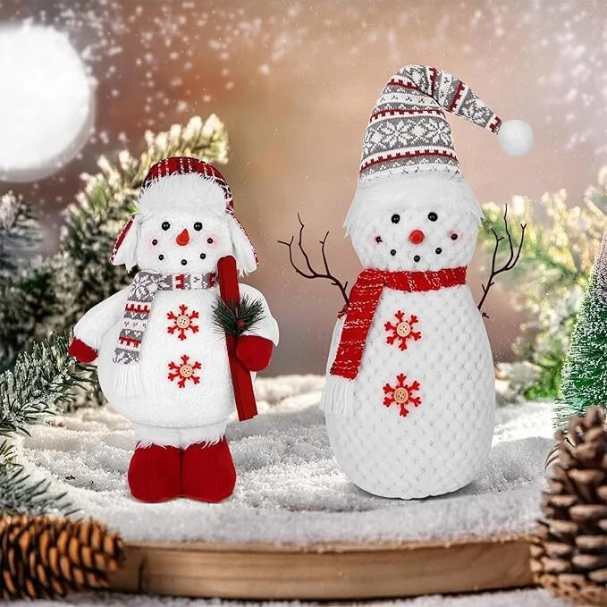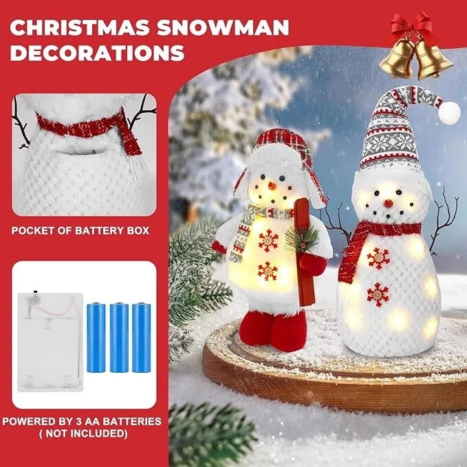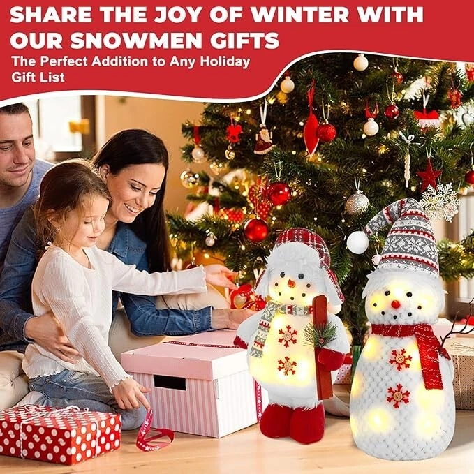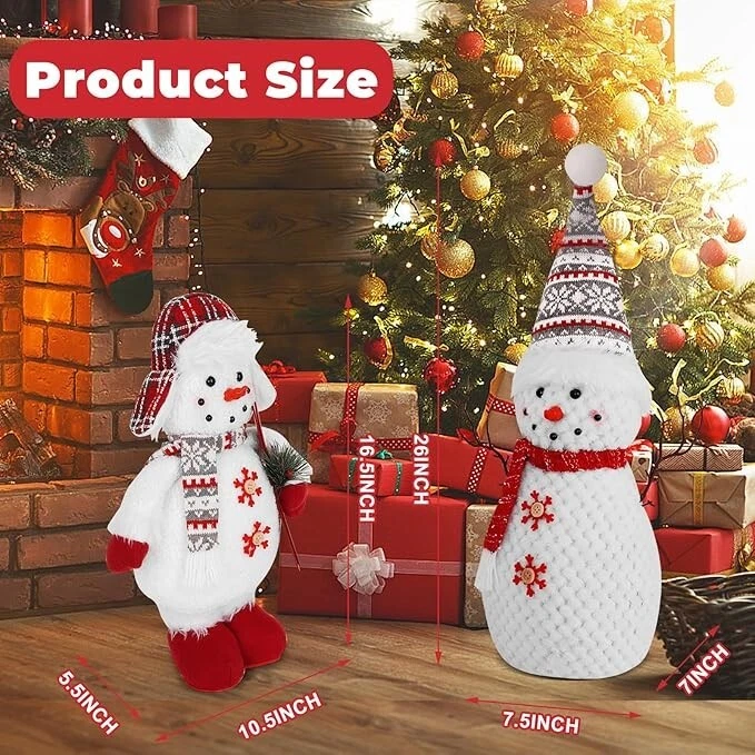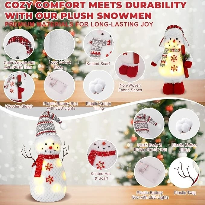 Set of 2 Christmas Plush Snowman Tabletop Decorations, Stuffed Snowman Christmas Product Description: 2 Pack Lighted Christmas Snowmen Illuminating Winter Charm: Our snowman decorations feature built-in LED lights that cast a warm, inviting glow, transforming any corner of your home into a magical winter wonderland. Our soft light up snowman are perfect for creating a cozy atmosphere during the holiday season, our snowman christmas decorations add a touch of cheer to any gathering. The snowmen are separately sized 7.5"L x 7"W x 26"H and 10.5"L x 5.5"W x 16.5"H Plush Comfort Meets Durability: Our snowman christmas decorations are crafted from a blend of premium materials including plush velvet, knit fabrics, and elastic cotton filling, these snowmen offer a soft, cuddly touch while ensuring long-lasting durability. Our christmas indoor decorations embrace the comfort of winter with decorations that are as cozy as they are stylish. The light Up Christmas Decor: Snowman figurines features light-up Christmas that adds a warm glow to your holiday decor Versatile Display Options: Christmas table decor whether perched on a mantel, shelf, or tabletop, our snowman decorations are designed for versatile display. Snowman figurines detailed accessories like wooden sleighs and plastic twig holders add a rustic charm, making them perfect for a variety of holiday decor themes, highlighting the winter decor of your home. Let these cute Christmas plush snowman accompany you to spend a happy and unforgettable thanksgiving day and christmas holiday Gifts of Joy: Our light up christmas decorations will surprise loved ones with these delightful snowman decorations, packaged in a compact-ready box. Snowman decorations indoor make the perfect addition to any holiday gift list, spreading joy and festive cheer to friends and family alike. An awesome gift choice for family, friends, couples, coworkers or snowman collectors to express your best wishes and bring them good luck. Why not choose christmas snowman at christmas day Elevate Your Holiday Decor: Our christmas figurine indoor upgrade your winter decor game with these stunning snowmen. Their intricate design and attention to detail set them apart from the rest, making them a must-have addition to any festive display. The light up snowman add a touch of elegance and sophistication to your holiday decor with these charming snowmen. These 2 pack cute light up plush figurines will be a unique gift for anyone during holiday seasons