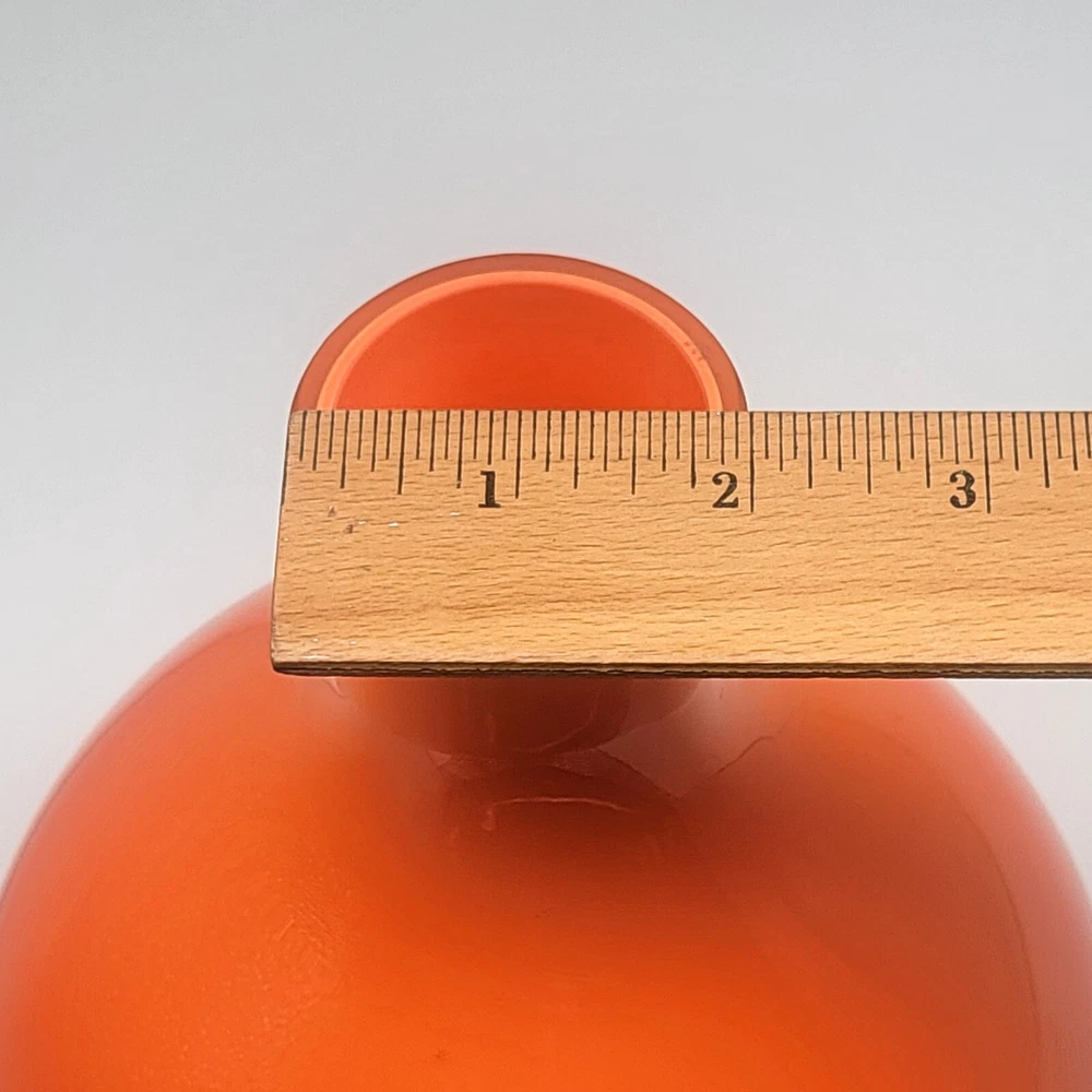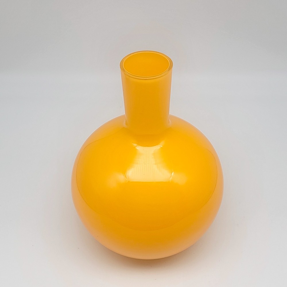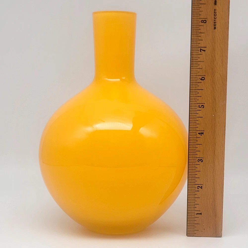 Set of 2 Crate and Barrel Encased Glass Vases Yellow 8.25" T and Orange 9.5" T The vases feature a glossy finish and bright yellow and orange colors. Yellow vase measures 8.25" T and 5.5" Diameter. Orange vase measures 9.5" T and 6.5" Diameter. Yellow vase has a 1 3/8" opening at the top. Orange vase has a 1 5/8" opening at the top. Used but in very good condition. Yellow vase has a small black spot inside the glass. The orange vase has a few small scratches that are hard to see because of the glossy finish and bright color. See photos for details.