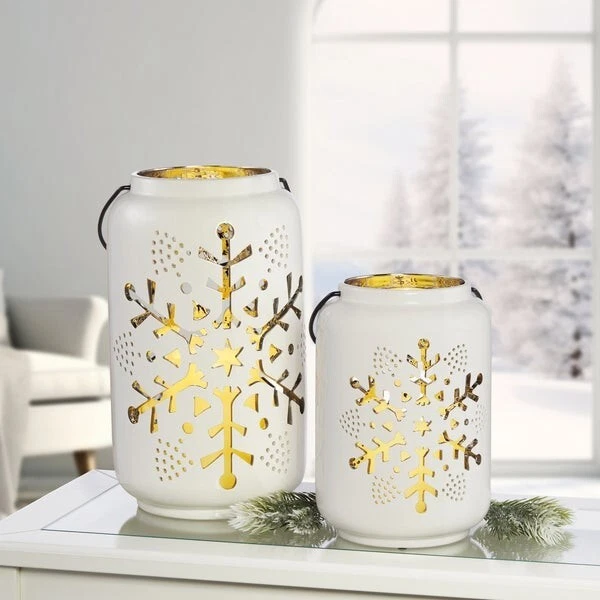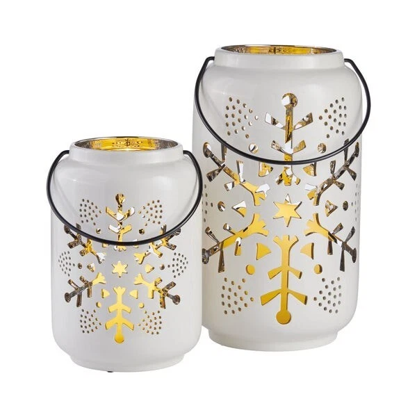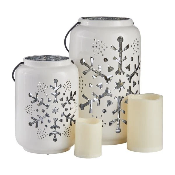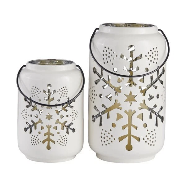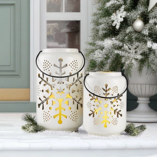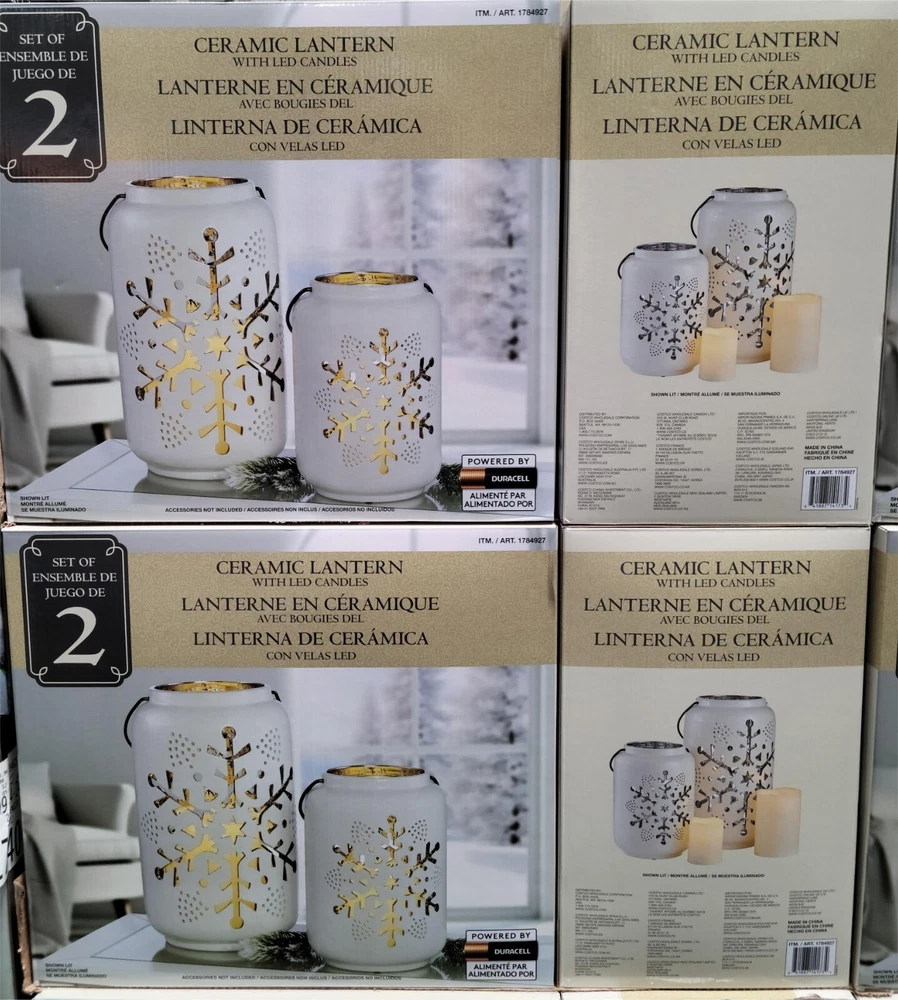 Set of 2 Holiday Snowflake Ceramic Lanterns with LED Candles, 14” H Lantern
