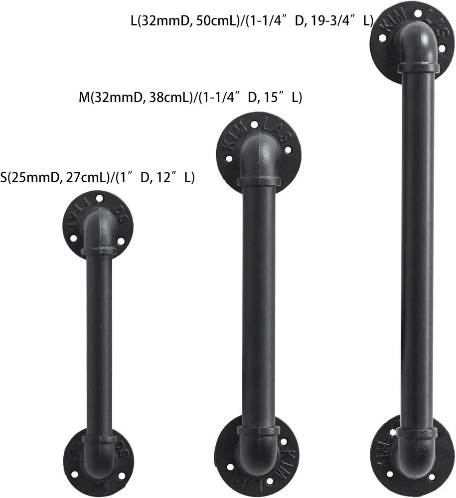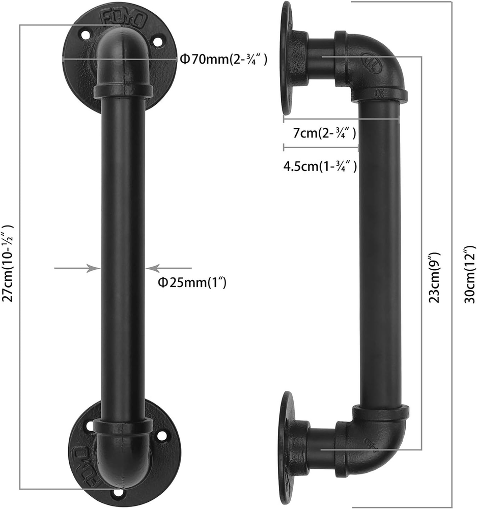 Longer Lifetime: Loft Industrial Design, Matte Black Antirust Coating, Galvanized Big Pipe Barn Door Handle Décor: Black Rustic Industrial Style Handle Bar Pull for Gate Cabinet Shed Door, commercial, and steampunk style décor, such as Bar, Hotel Wineshop, Coffee House, Leisure, Dessert Shop, Restaurant, bring you with an industrial visual effect Multi-application: FOYO handles are used for doors, gates, garages, barns, sheds, closets, sliding doors , also can be used as Door Handrails, Cabinet Pulls, Shed Door, Window Balustrades, Bathroom Rail, Towel Racks, Curtain Parapets Home Care: Safety, providing extra security as in the bathroom, window and stairs for the people whom need it Size: S(25mmD, 27cmL)/(1”D, 12”L), Assemble Required, 2 Handles and matching mounting hardware and black screws are included(NOTICE: Floor flanges have FOYO logo on it) Product description Versatile application: Towel Racks Can be installed in the bathroom as a hanging rod Used for hanging clothes and towels Make your life easier Door Handles Suitable for a lot of door types (large /small) Even for garage/barn/sheds/closets or sliding doors Antique Cast Iron Handrail: Can be installed on the side of the stairs as a stair railing Safe and Exquisite, Easily coordinates with the style of your home Matches Multiple Types of Doors Size: Door Handles ( S ) Size: Flange Diameter:70mm Pipe Diameter:25mm Total Length: 12 inches Suitable for Small size door Bathroom, Bedroom, Study room, Kitchen room, Refrigerator, Closet, etc Can be installed in your garden or loft, Strong and Durable Barn Handles ( M ) Size: Flange Diameter:85mm Pipe Diameter:32mm Total Length: 15 inches Suitable for Middle size door Garages, Barns, Sheds, Sliding doors, Bathroom Rail, Towel Racks, Curtain Parapets, etc Gate Handles ( L ) Size: Flange Diameter:85mm Pipe Diameter:32mm Total Length: 19-3/4 inches Suitable for Large size door Coffee store, Flower shop, Office, Cabinet Pulls, Window Balustrades etc Door Handles ( S ) Barn Handles ( M ) Gate Handles ( L )